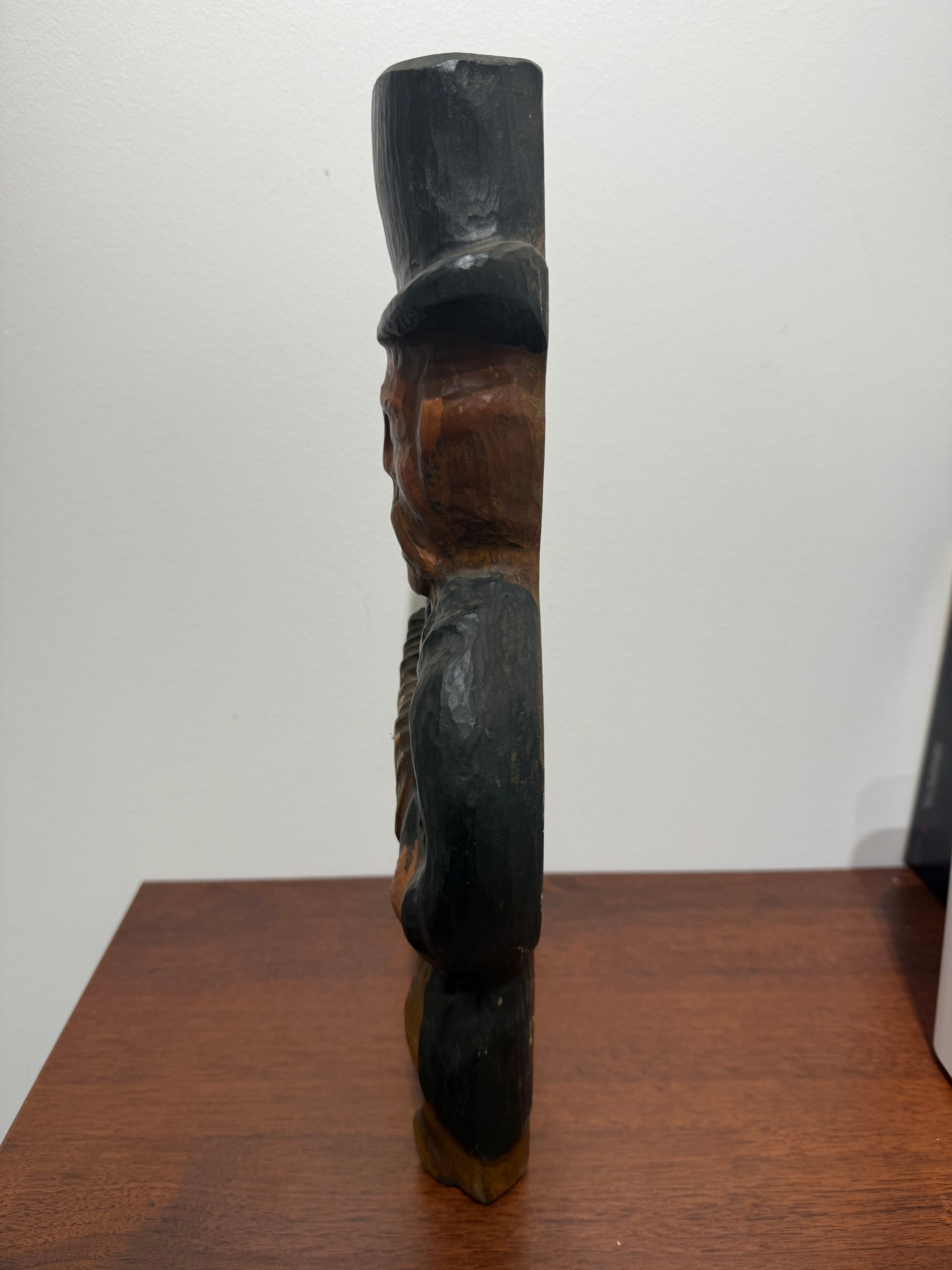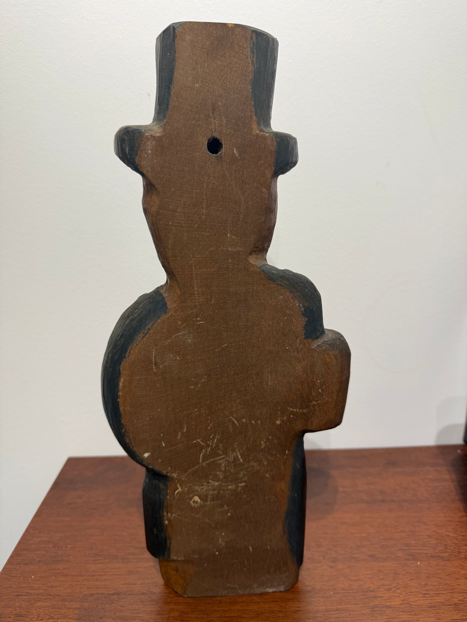 Cette imposante sculpture en bois polychrome représente un musicien moustachu vêtu d’un costume noir et d’un haut-de-forme, jouant de l’accordéon. Le style naïf et expressif de la sculpture, ainsi que les coups de ciseaux apparents, laissent penser à un travail artisanal, typique de l’art populaire d’Europe de l’Est ou du Nord, probablement des années 1960-1980. Une pièce pleine de caractère, idéale pour une décoration rustique, rétro ou décalée.