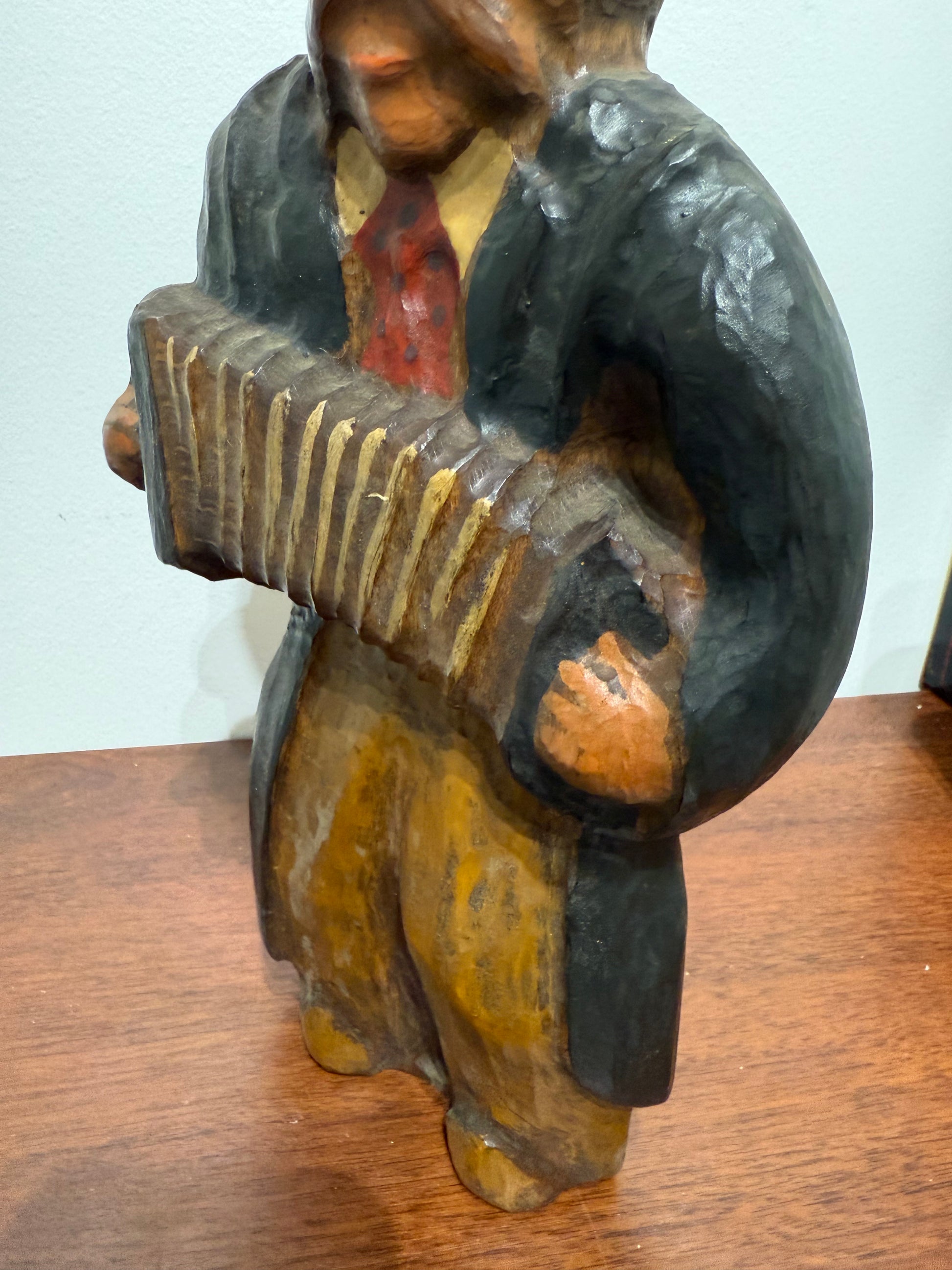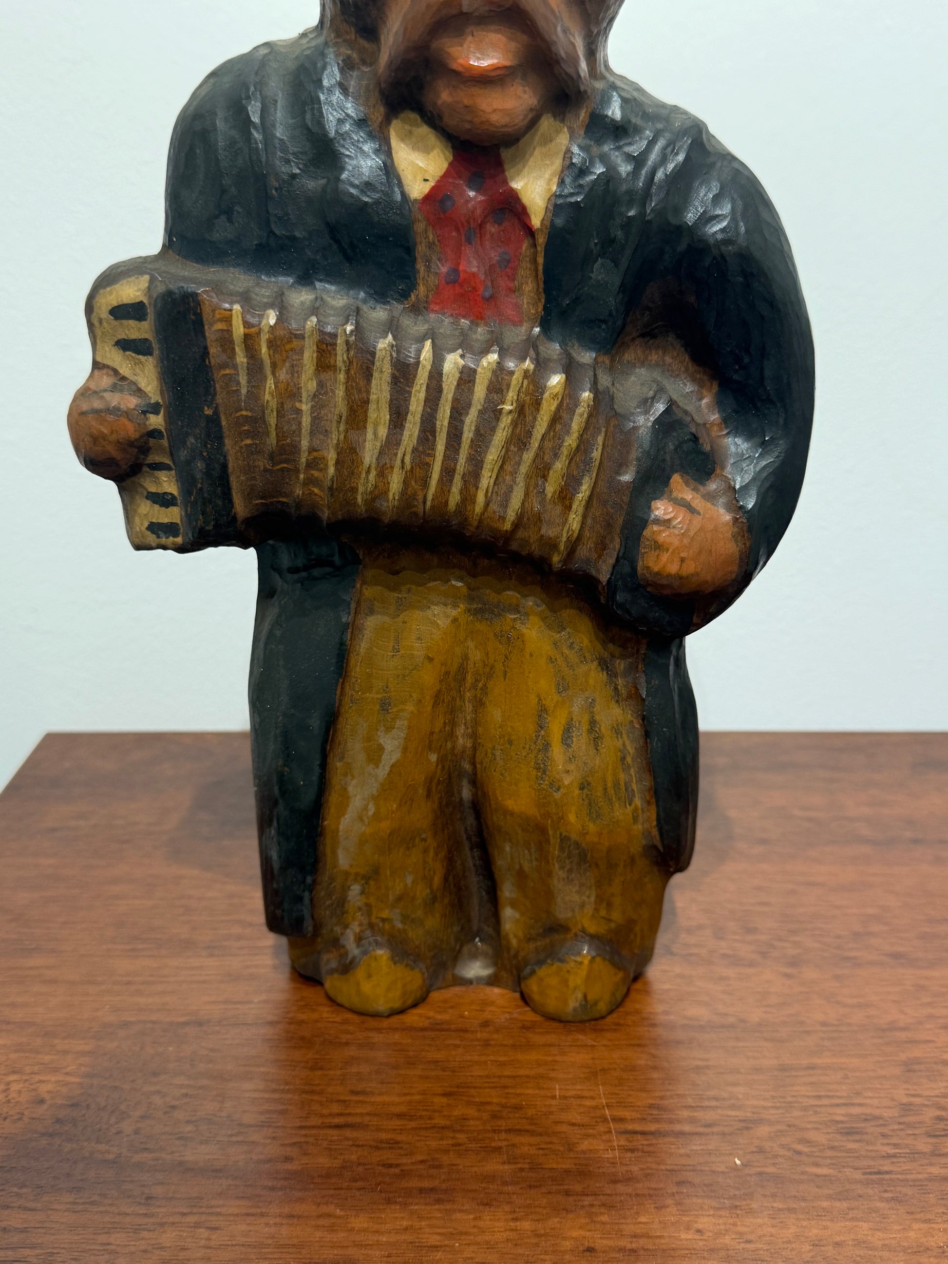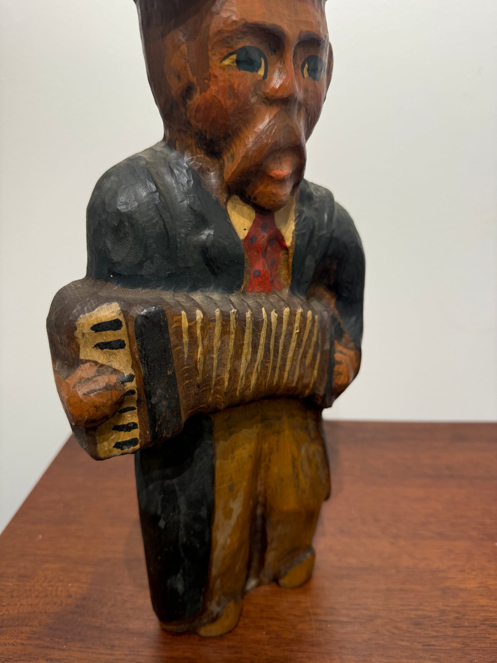 Sculpture en bois d’un musicien à l’accordéon – Art populaire vintage