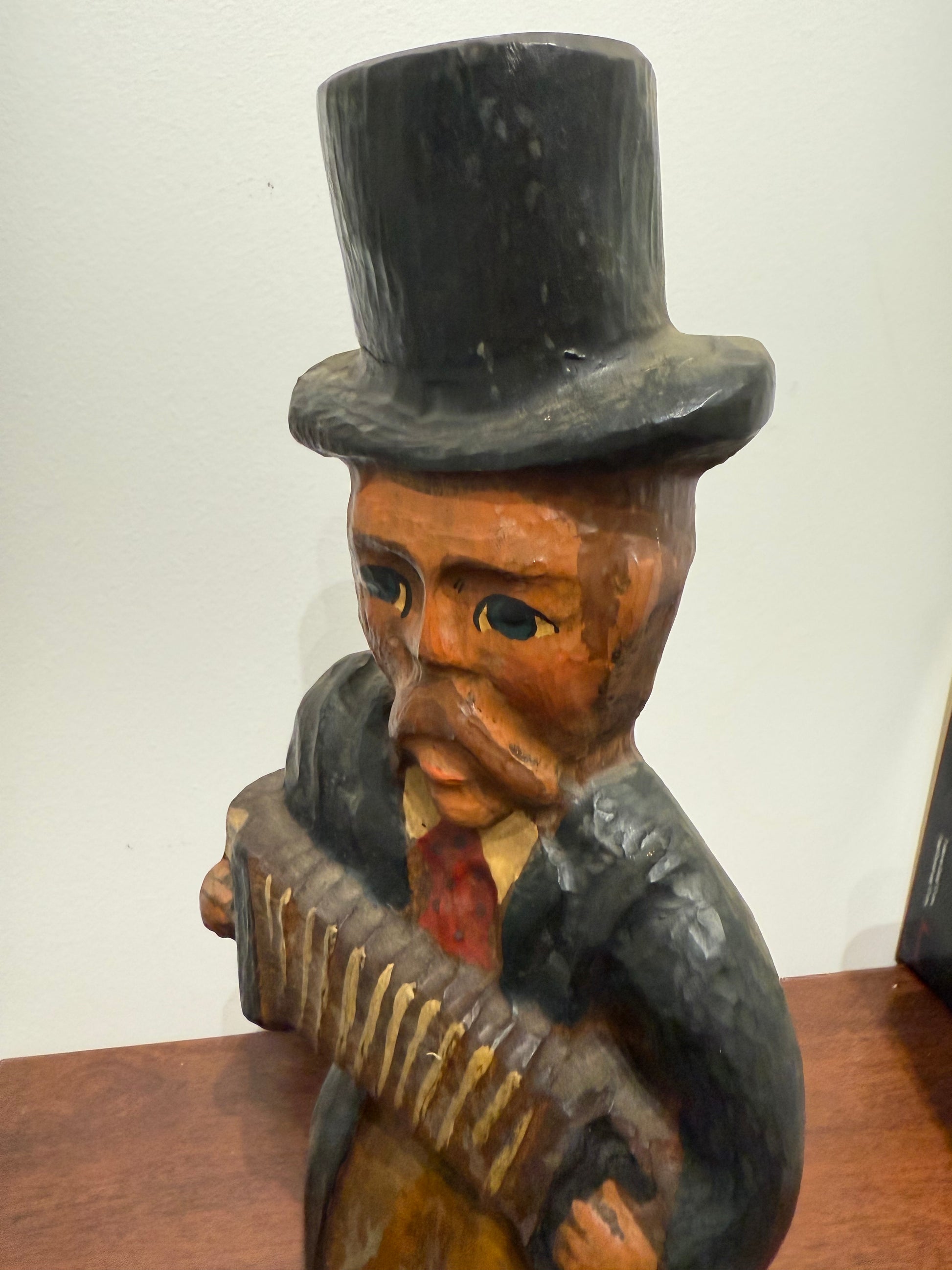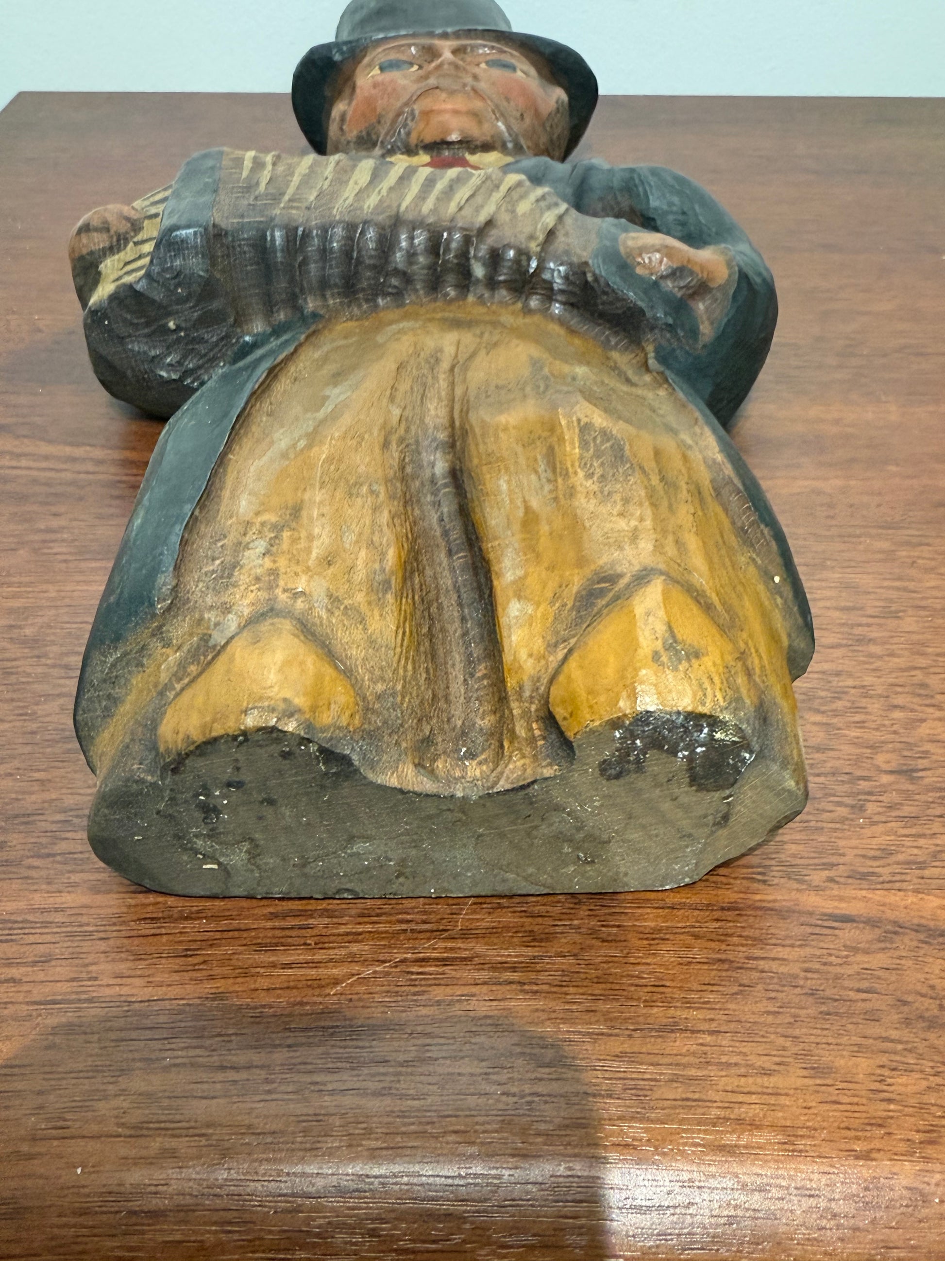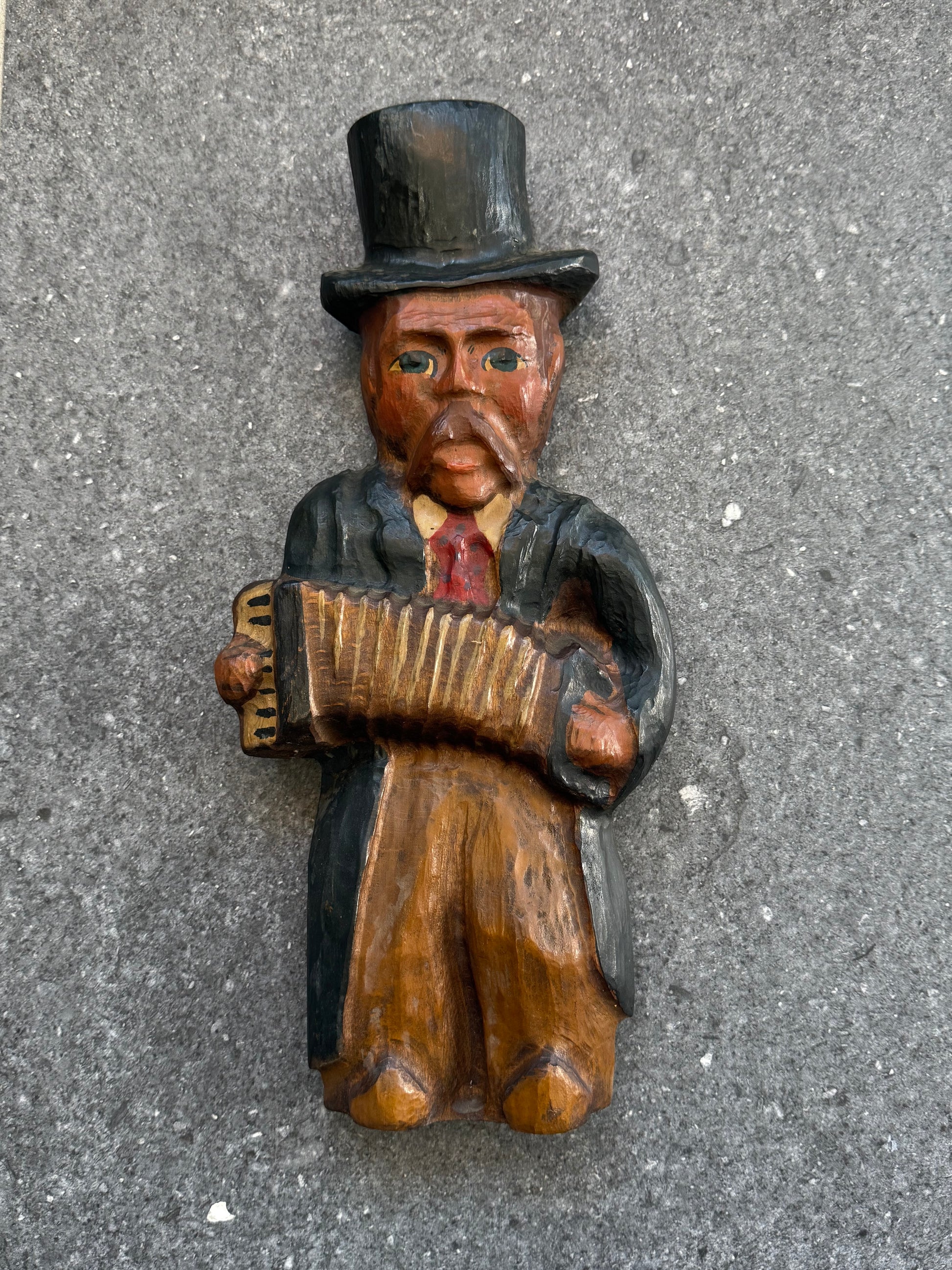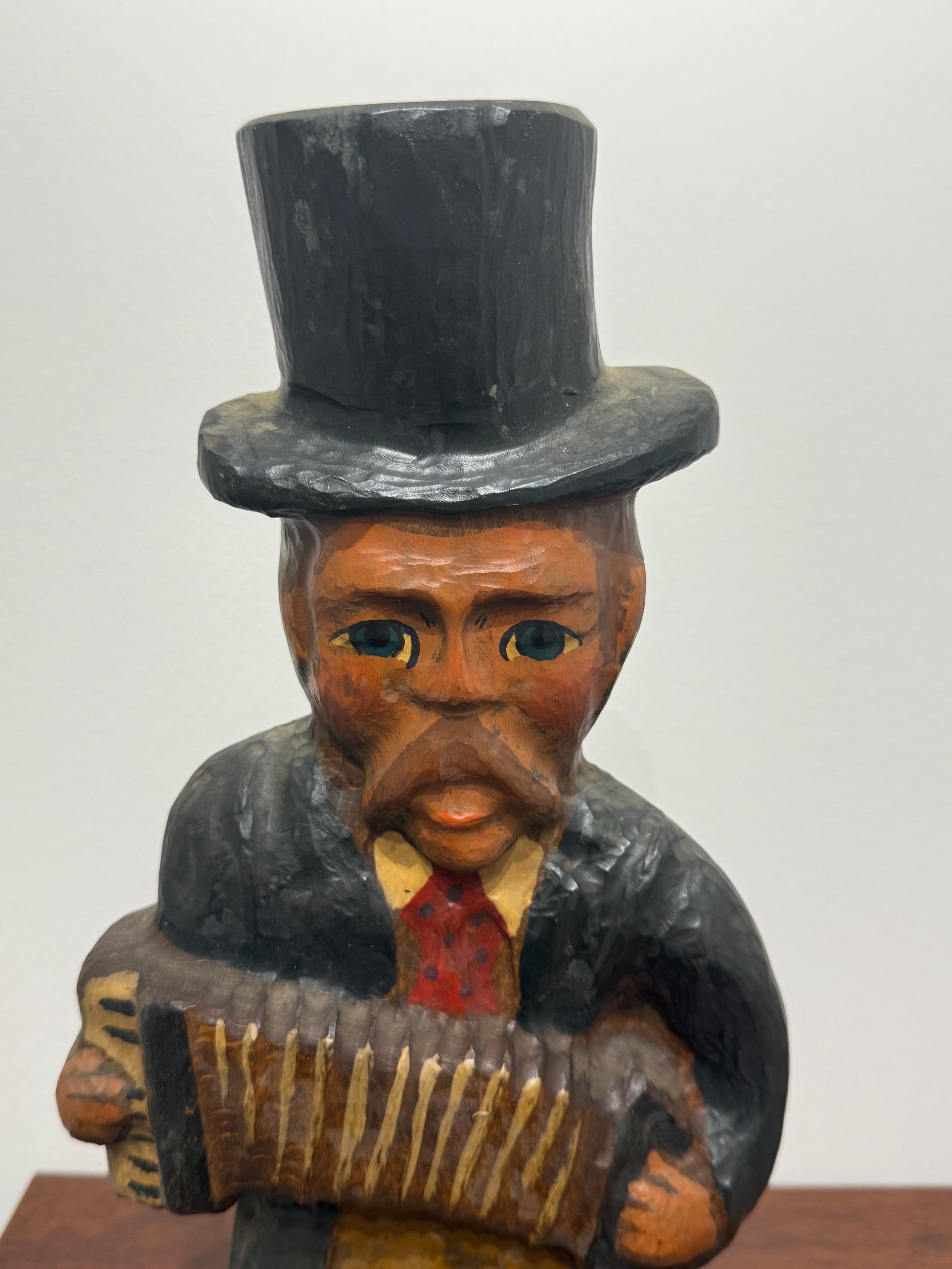 Sculpture en bois d’un musicien à l’accordéon – Art populaire vintage