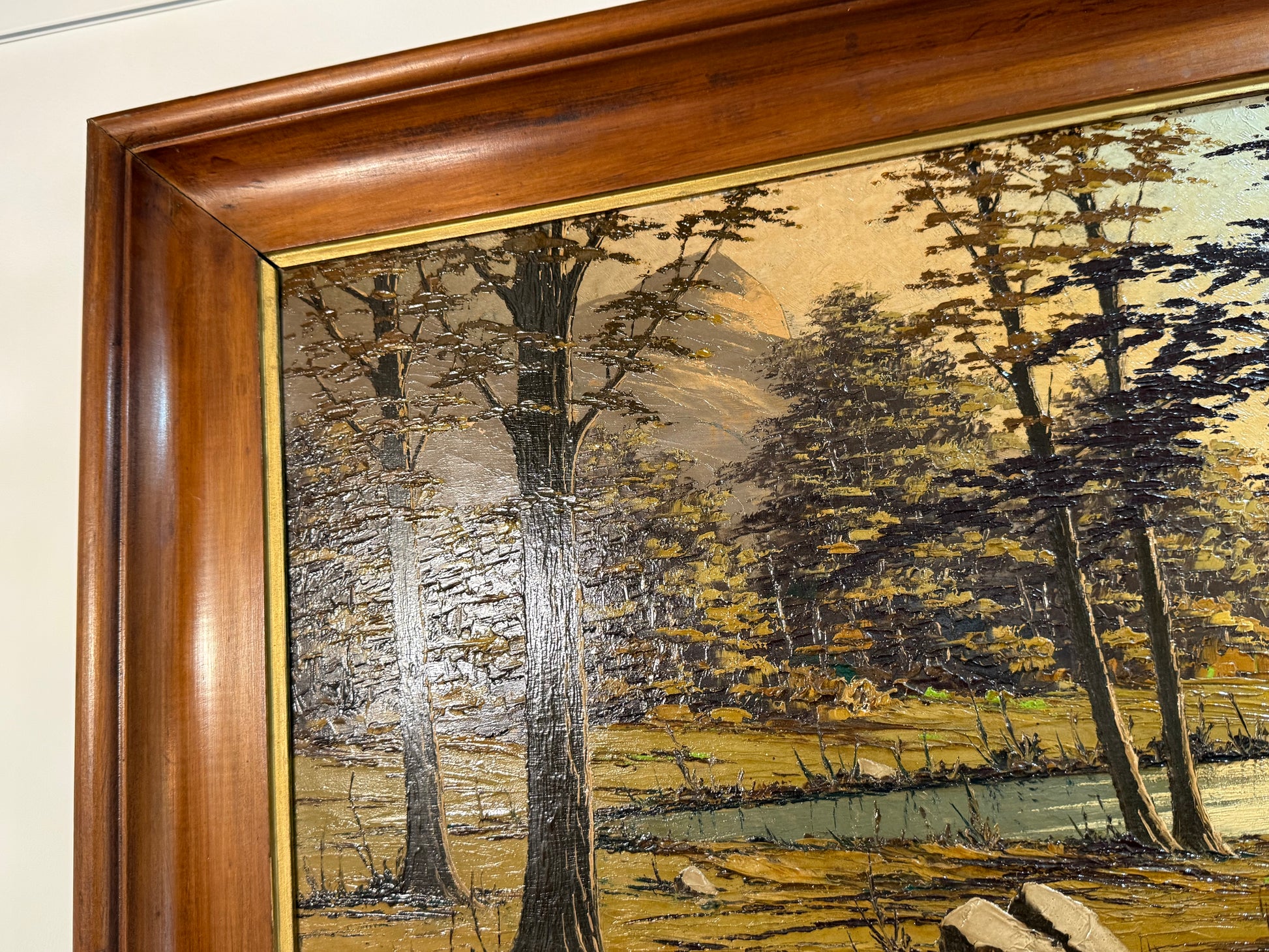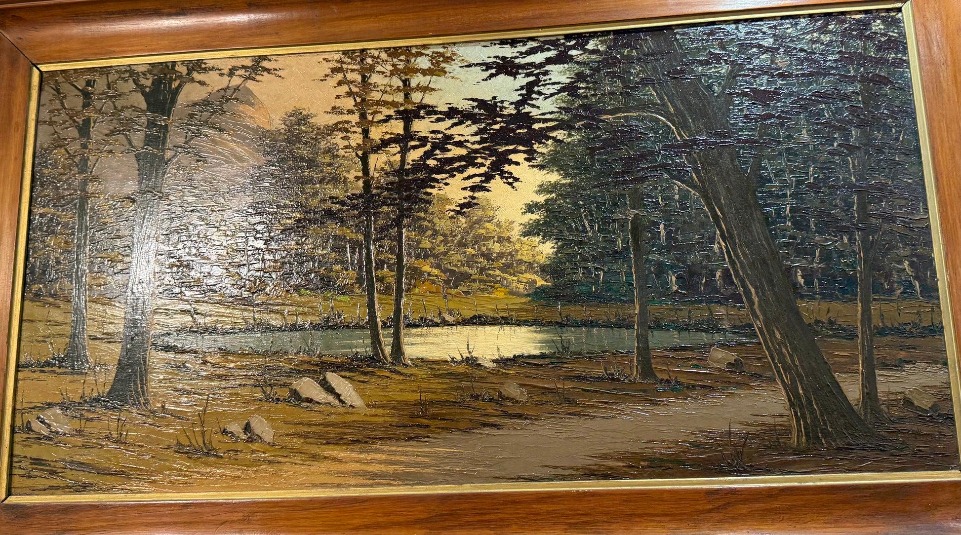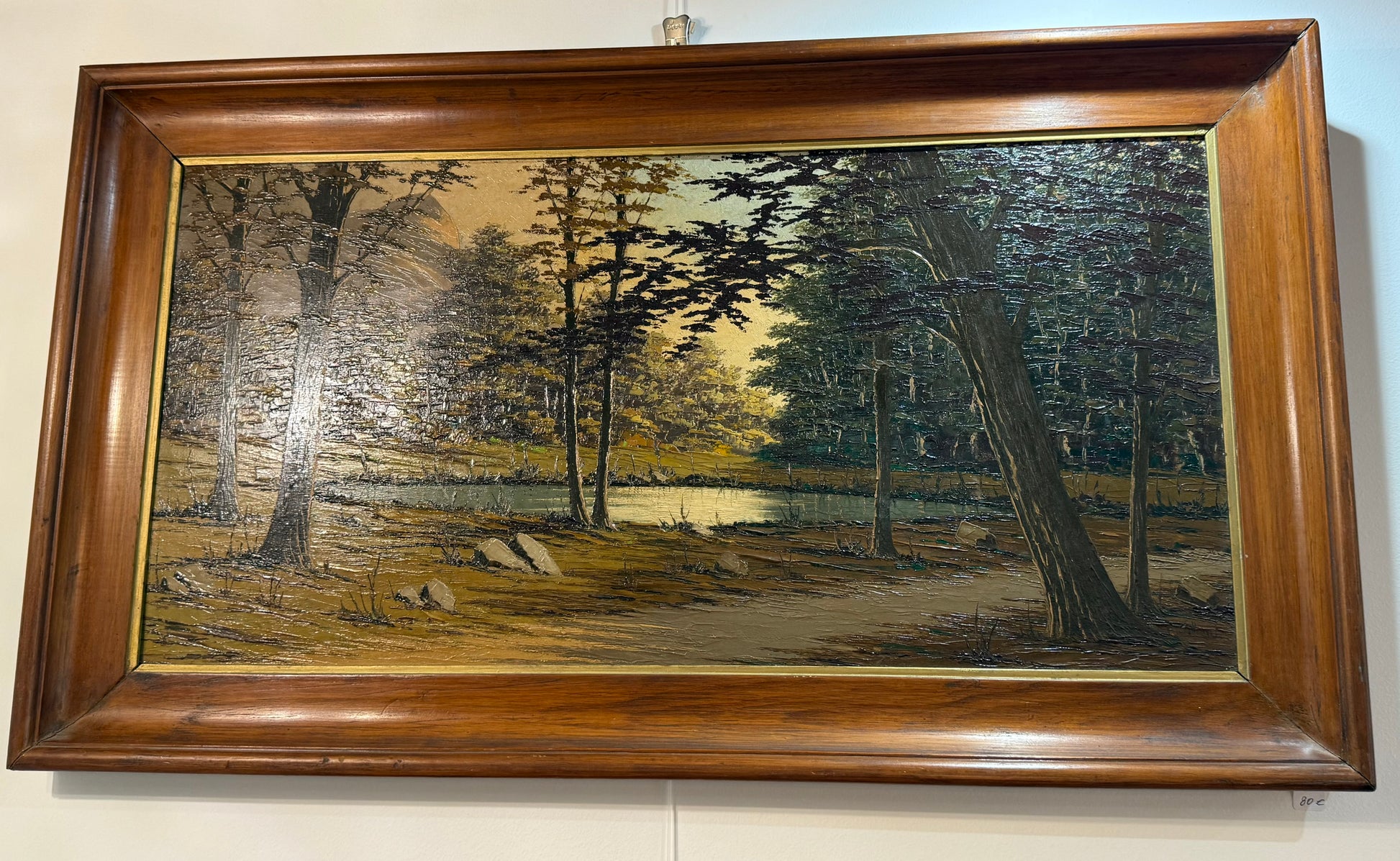 Atmosphère calme et mystérieuse pour ce paysage peint à l’huile représentant un sous-bois au bord d’un étang à la tombée du jour. Les grands arbres en premier plan encadrent une percée lumineuse vers un ciel doré, tandis que les tons bruns, verts sombres et reflets argentés de l’eau évoquent une fin d’après-midi paisible, propice à la contemplation.