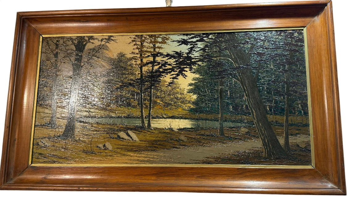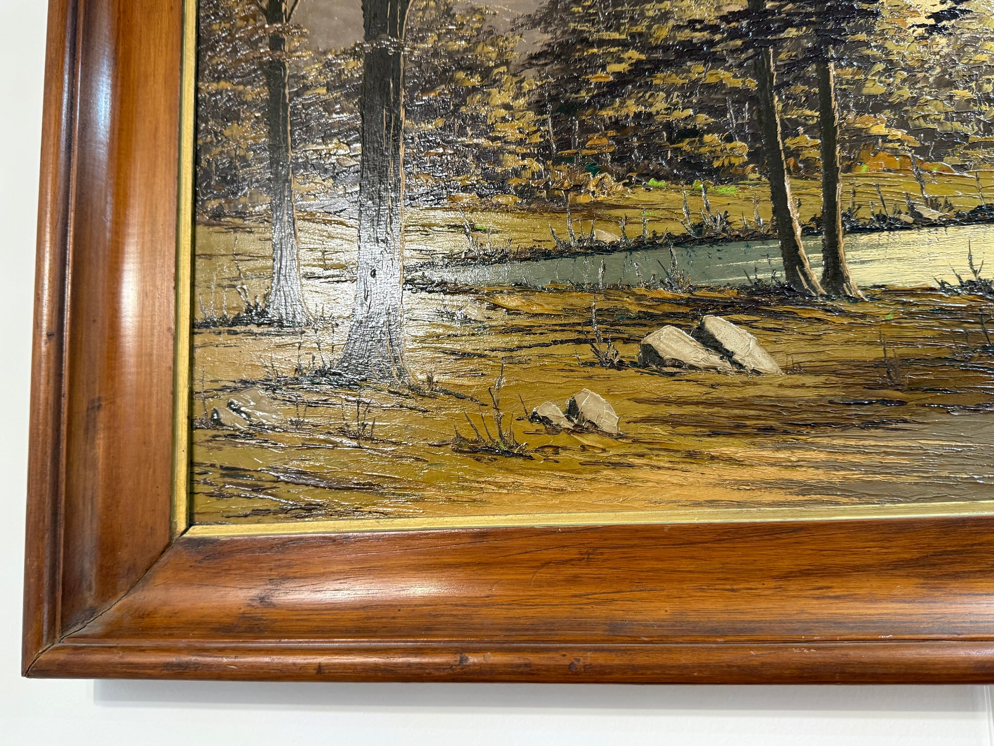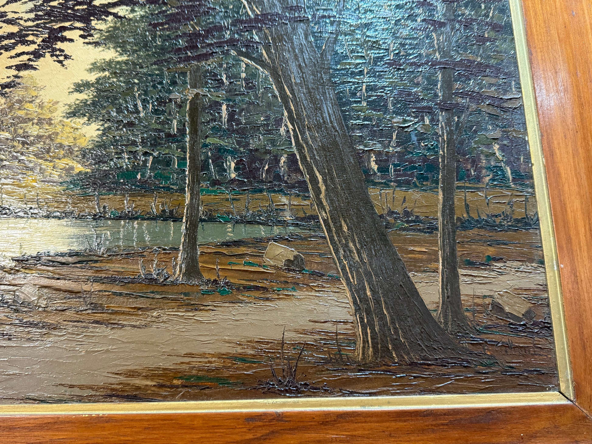 Atmosphère calme et mystérieuse pour ce paysage peint à l’huile représentant un sous-bois au bord d’un étang à la tombée du jour. Les grands arbres en premier plan encadrent une percée lumineuse vers un ciel doré, tandis que les tons bruns, verts sombres et reflets argentés de l’eau évoquent une fin d’après-midi paisible, propice à la contemplation.