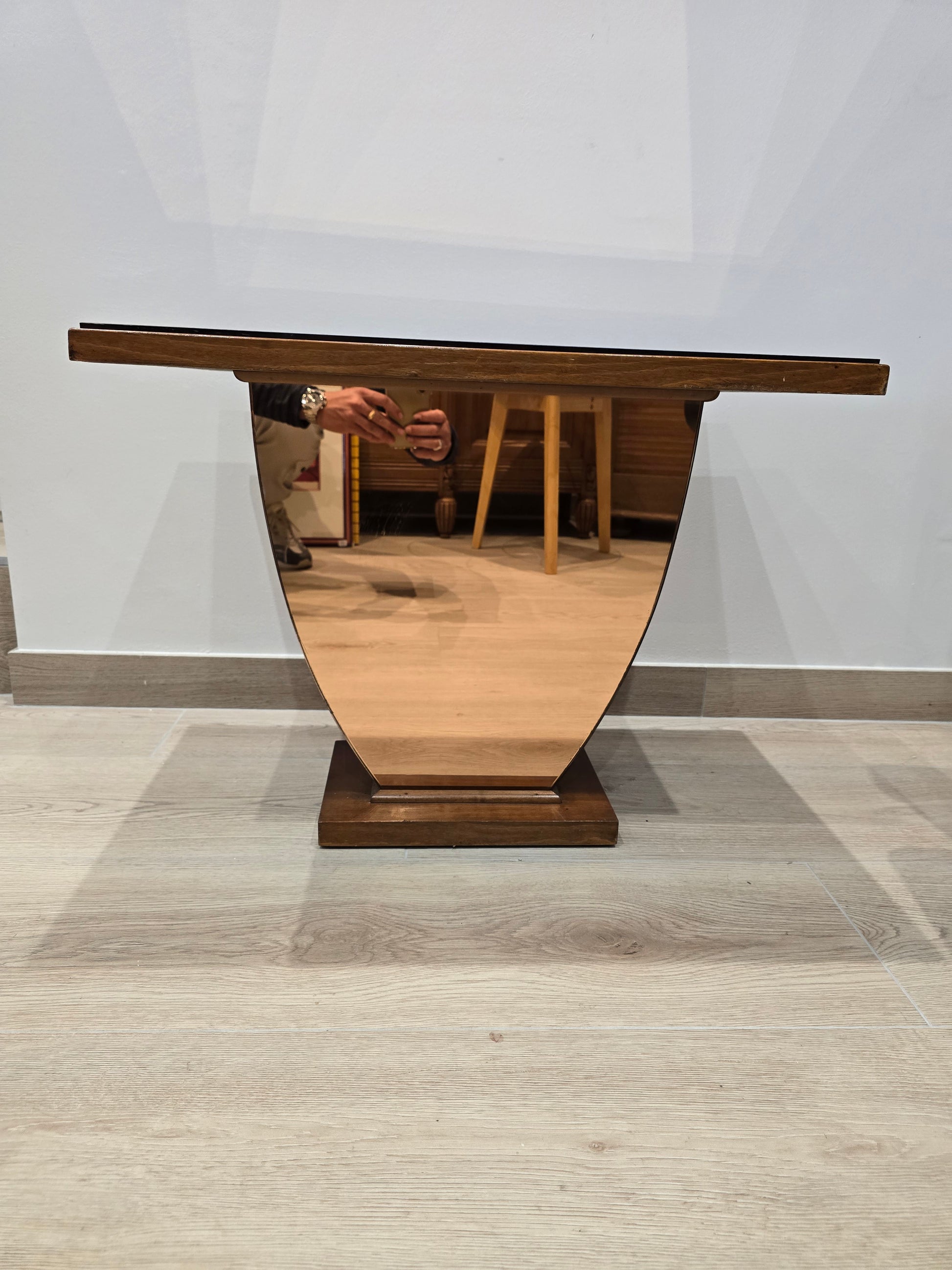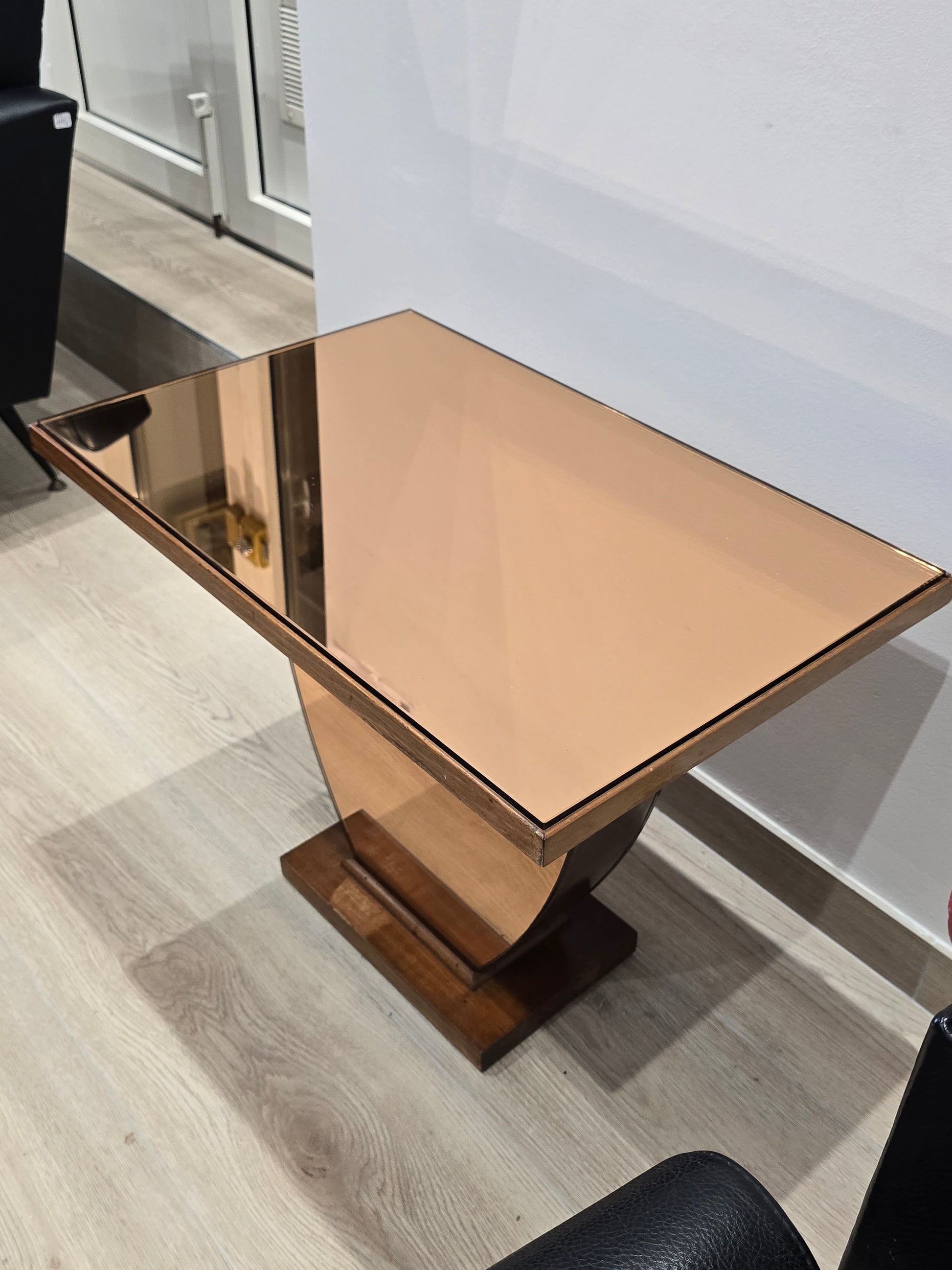 Élégante table basse ou table d’appoint de style Art déco, probablement réalisée dans les années 1940. Son piétement en bois massif, à la silhouette galbée et symétrique, repose sur une base rectangulaire. Le plateau est surmonté d’un miroir teinté couleur cuivre, apportant une touche chaleureuse et raffinée à l’ensemble.