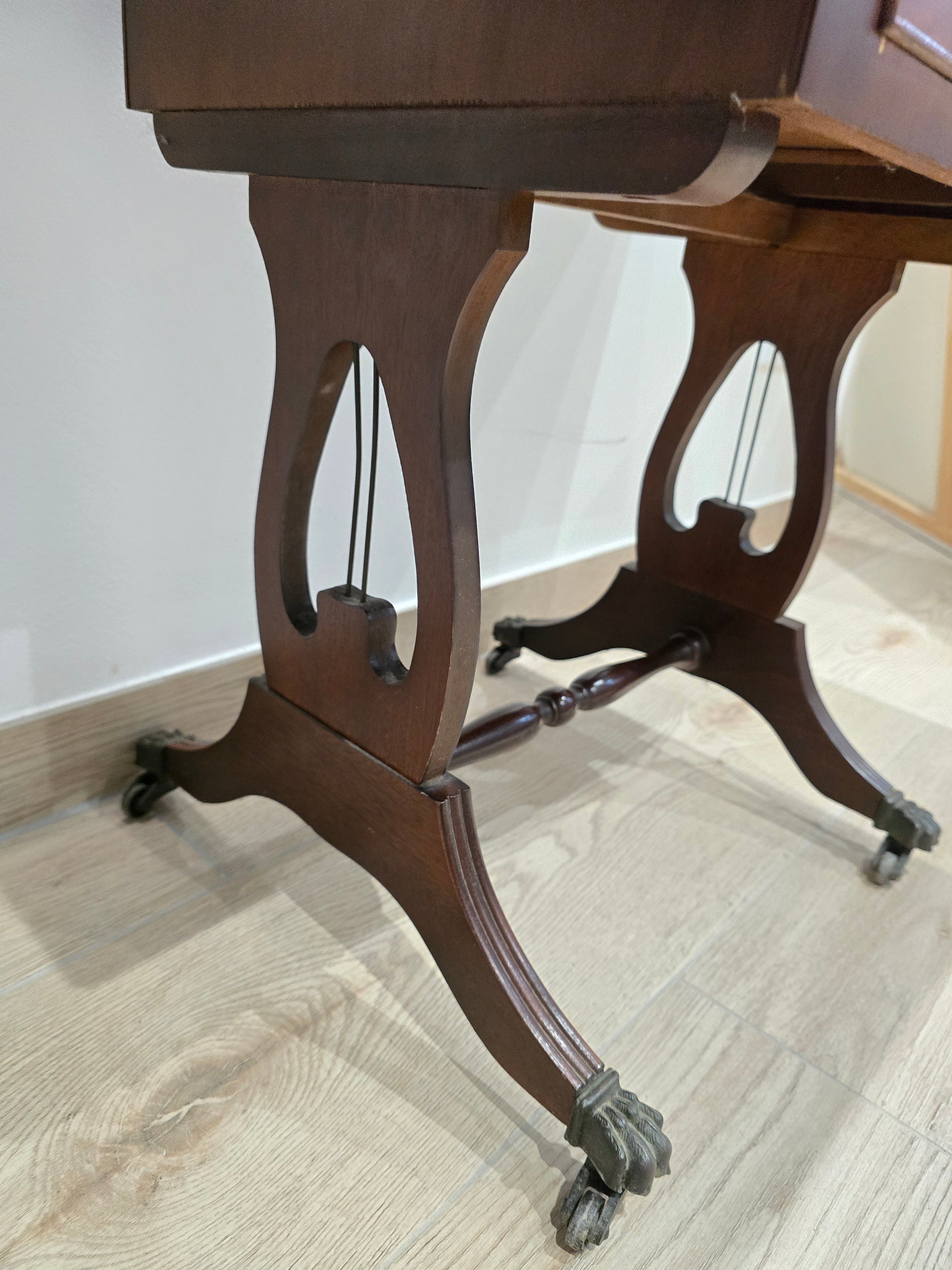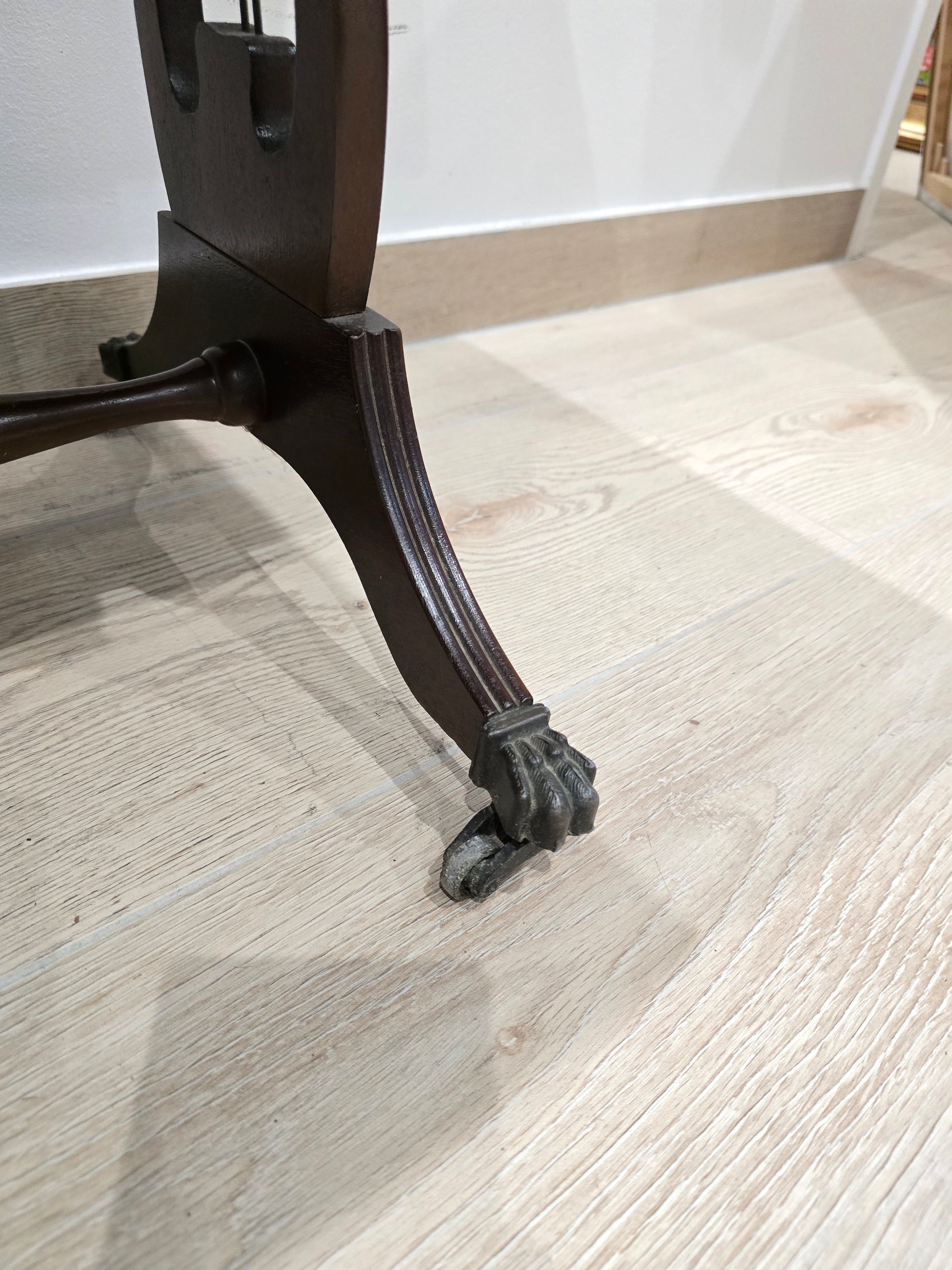 Le piétement est particulièrement raffiné : pieds tournés, légèrement cannelés, terminés par des pattes griffes en bronze montées sur roulettes d’origine – un détail typique des meubles anglais du début du XXᵉ siècle. Une entretoise centrale stabilise l’ensemble.