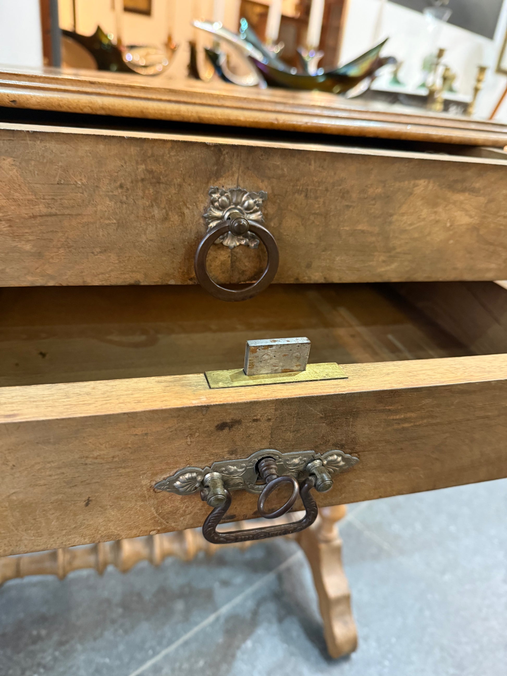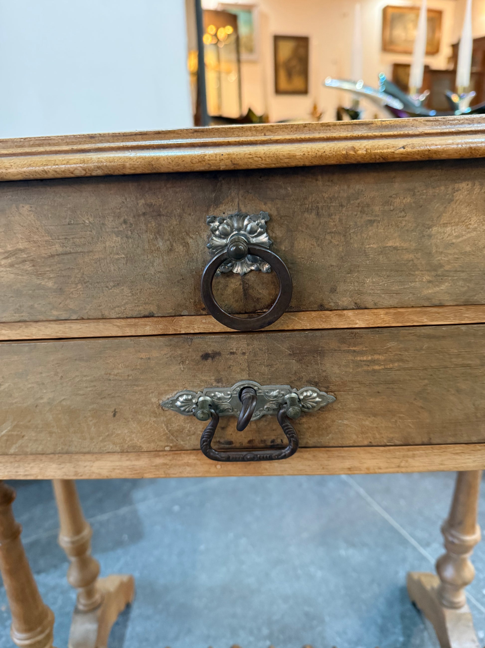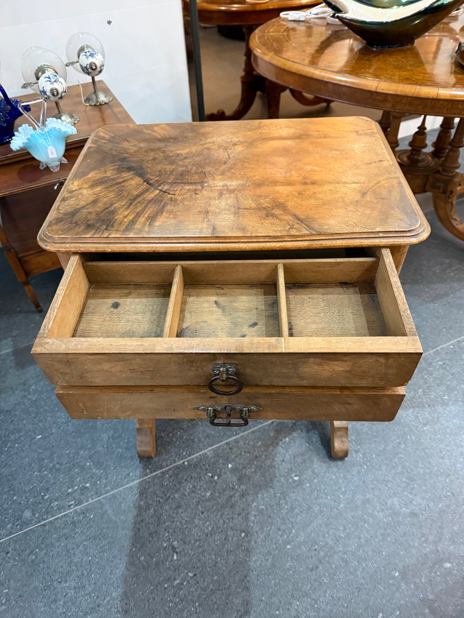 La partie supérieure est composée de deux tiroirs, dont l’un est équipé de compartiments d’origine, parfaits pour le rangement des accessoires de couture, bijoux ou petits objets. Les poignées en métal ouvragé sont authentiques, avec des formes florales décoratives très représentatives du style de la fin du XIXe.