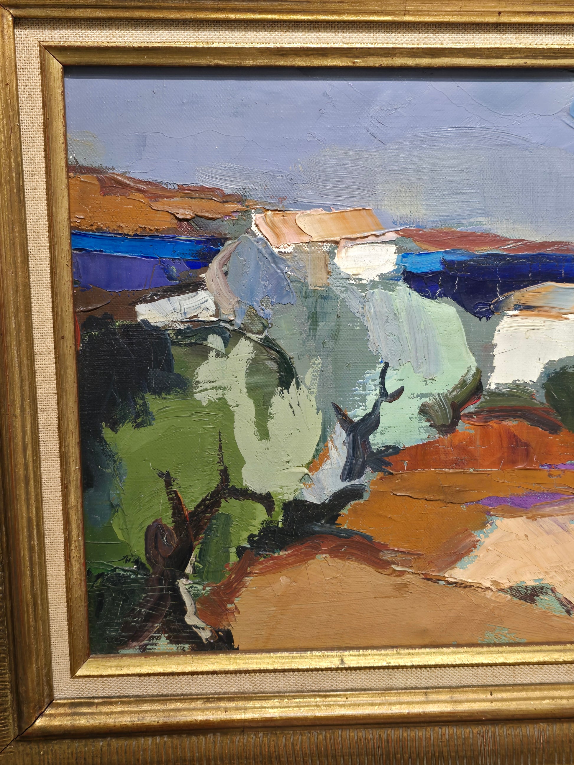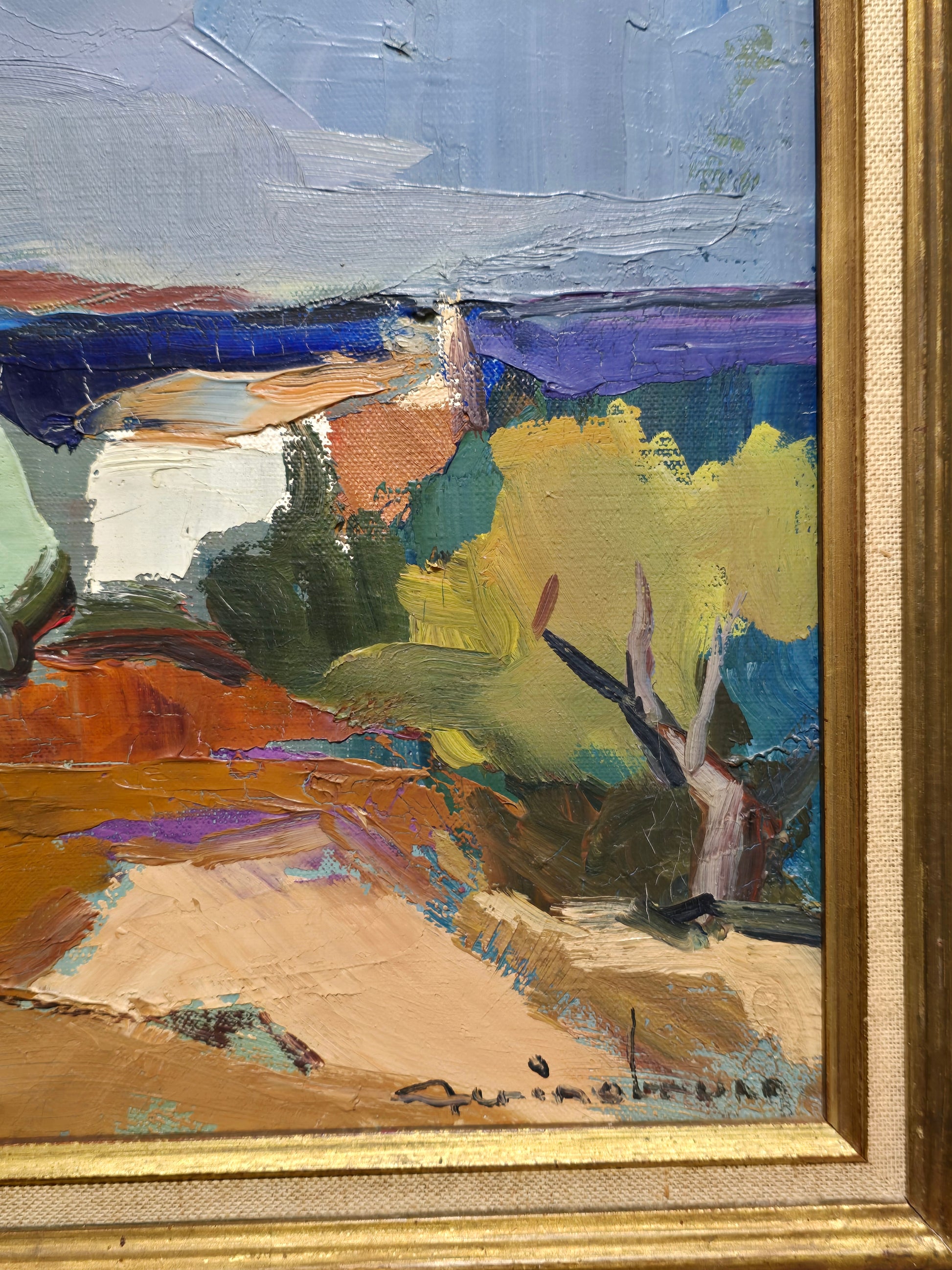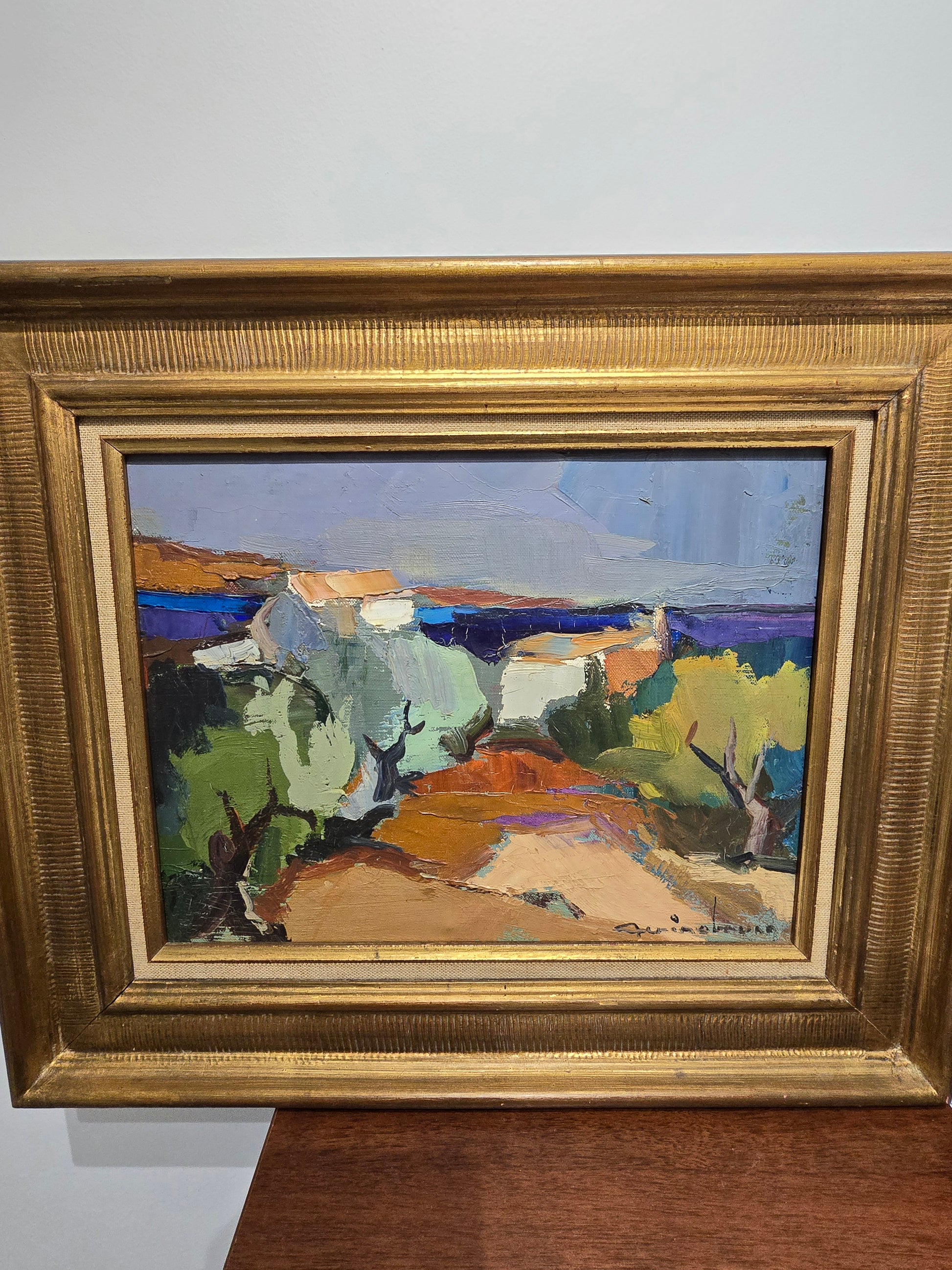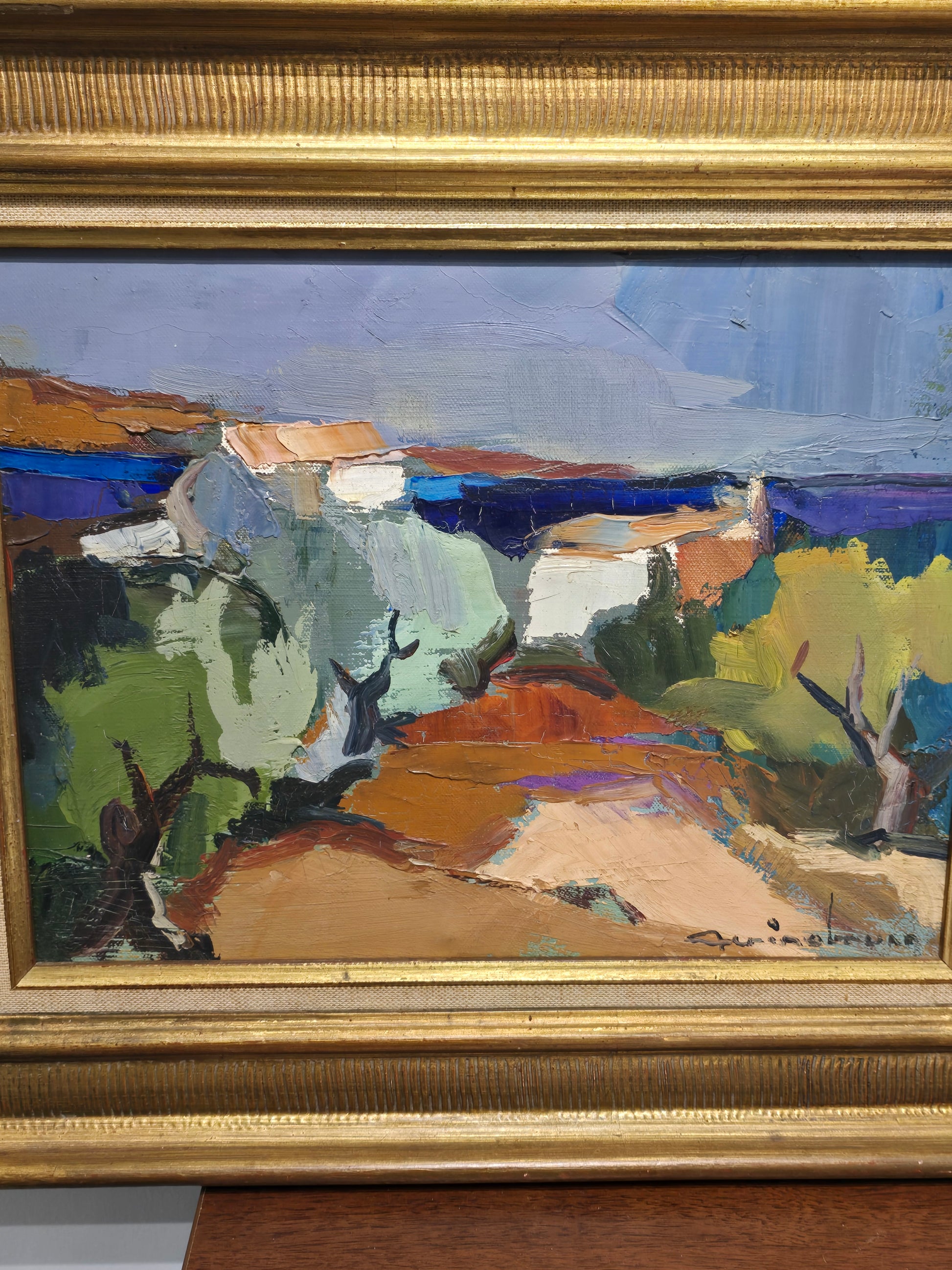 Ce paysage, par son style post-impressionniste, capture l’essence vibrante des paysages méditerranéens. L'artiste utilise des palettes intenses et des compositions simples pour exprimer la beauté de la nature. Le cadre doré enrichit l'ensemble, ajoutant une touche classique et mettant en valeur les détails du tableau.