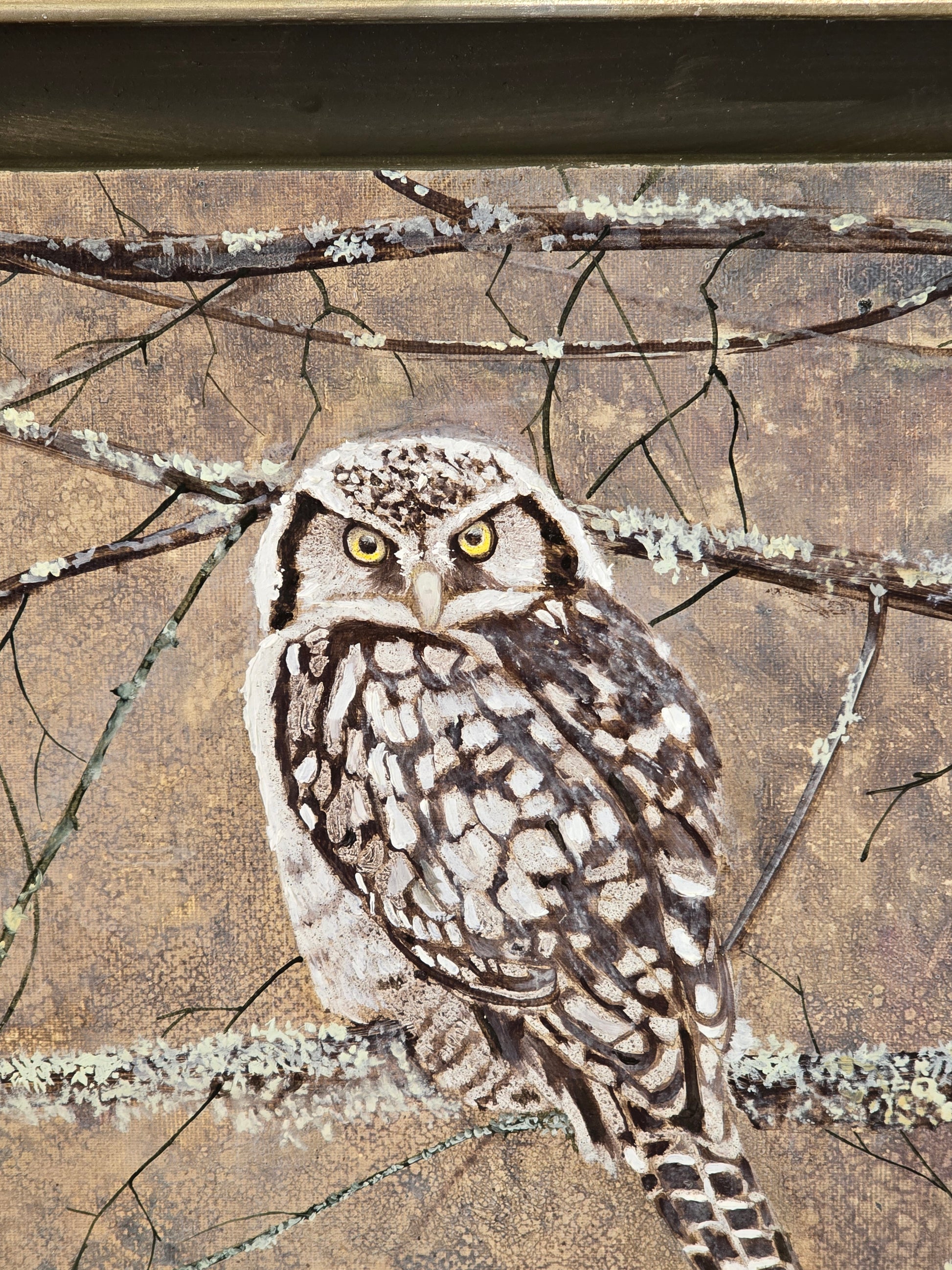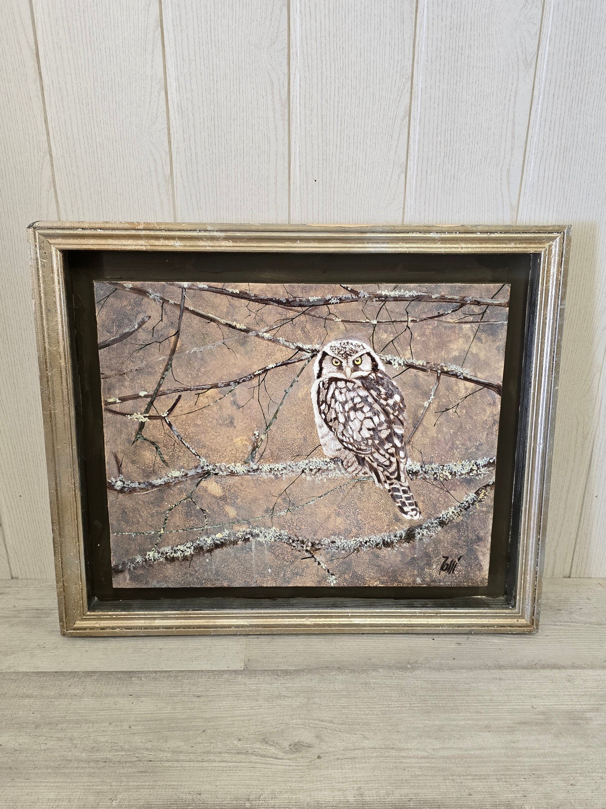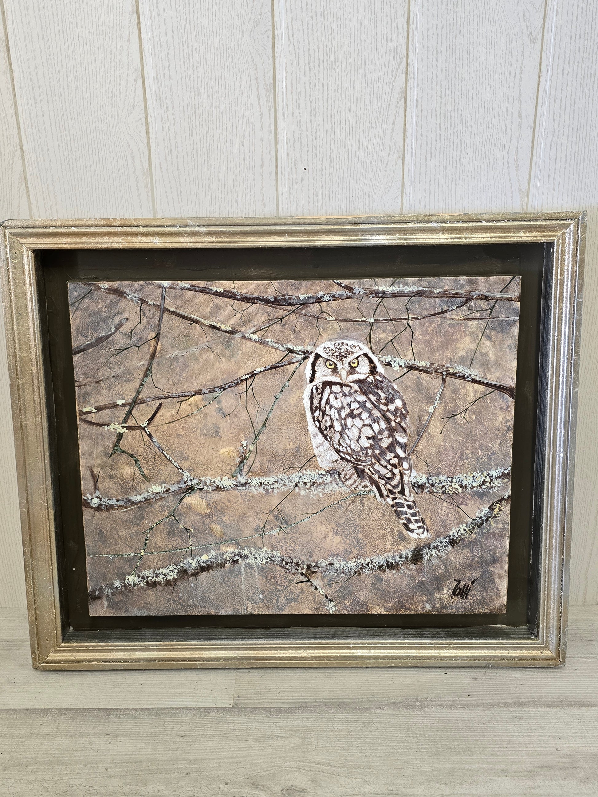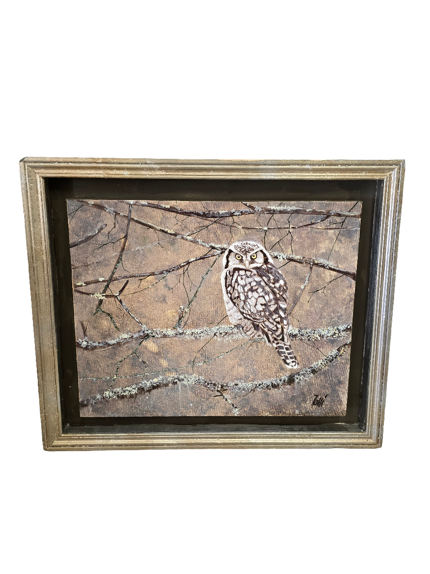 Œuvre représentant une chouette épervière sur une branche enneigée.