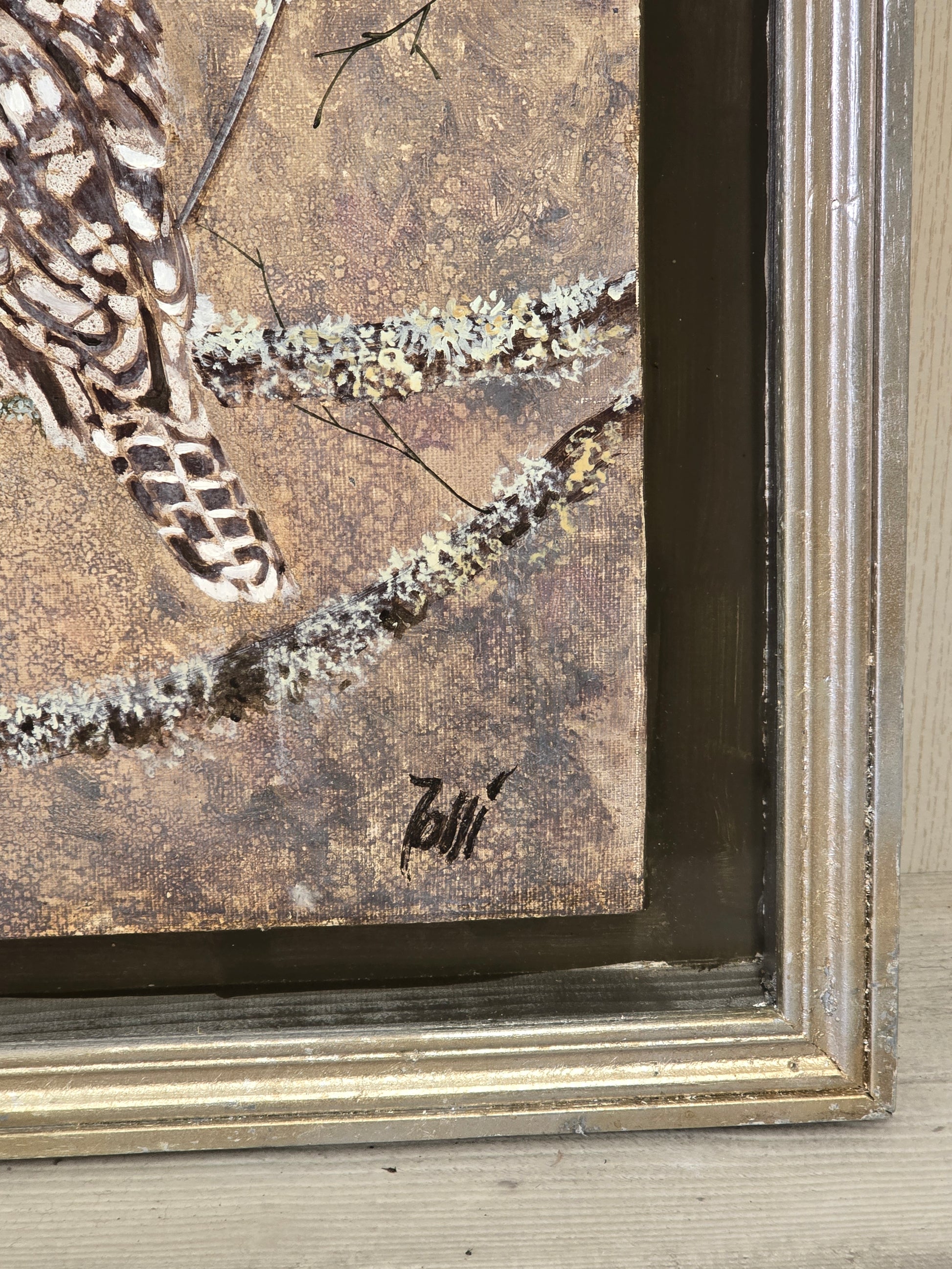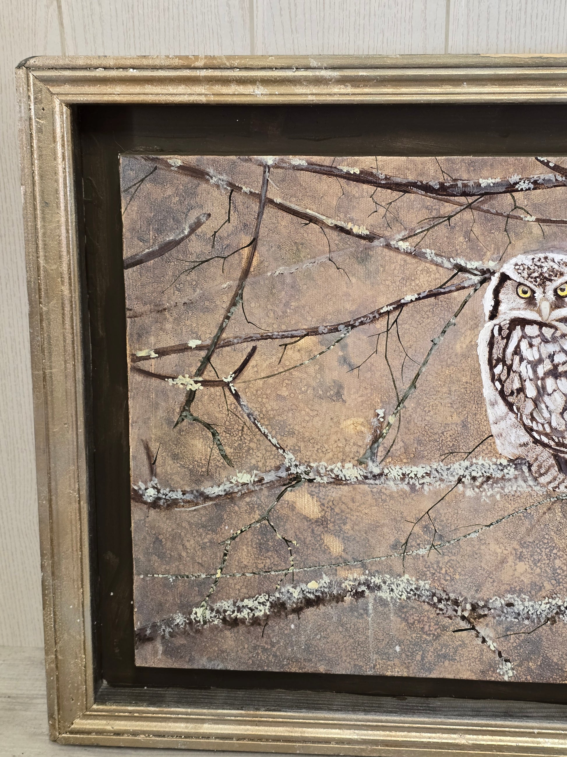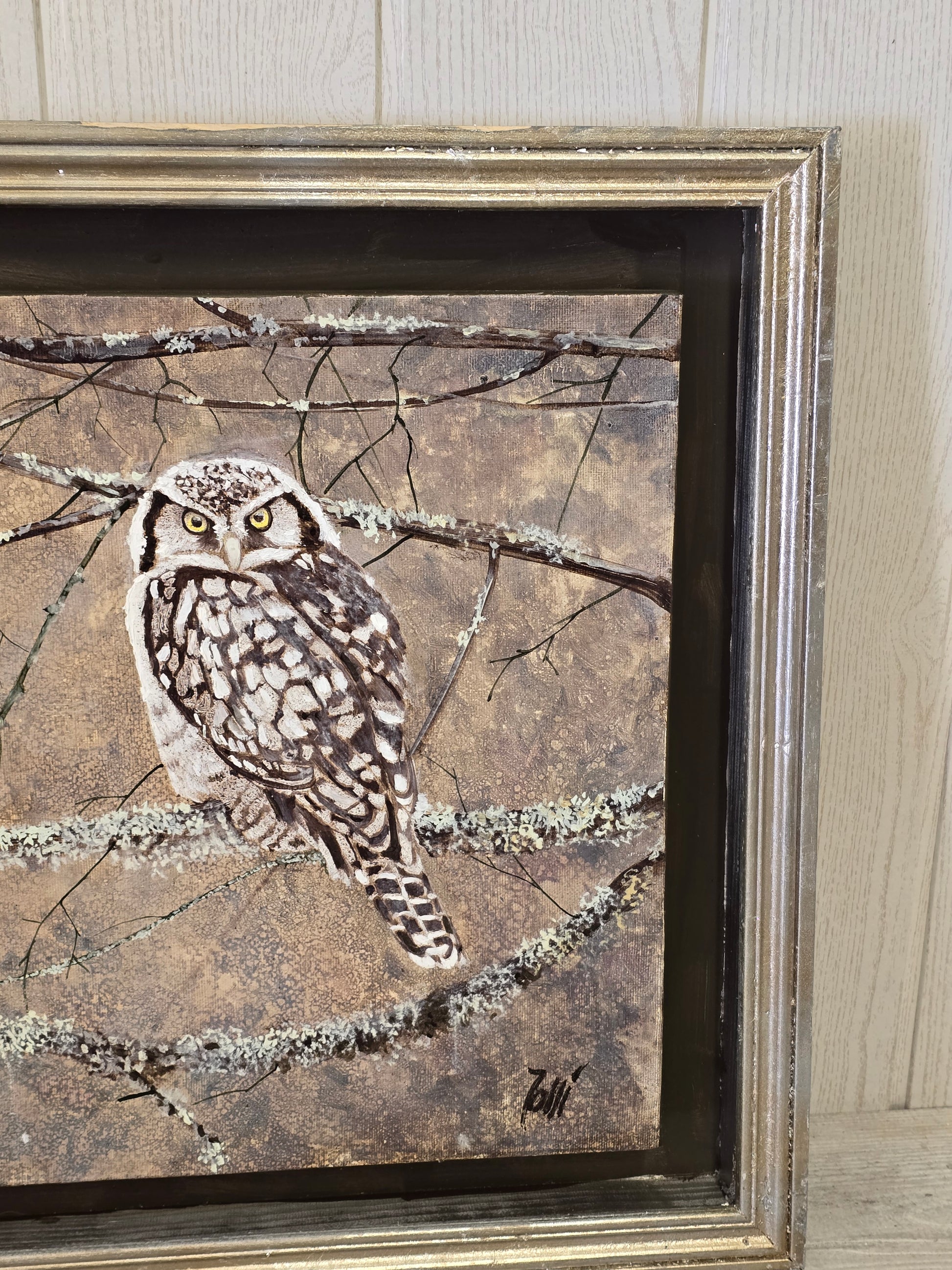 Œuvre représentant une chouette épervière sur une branche enneigée.