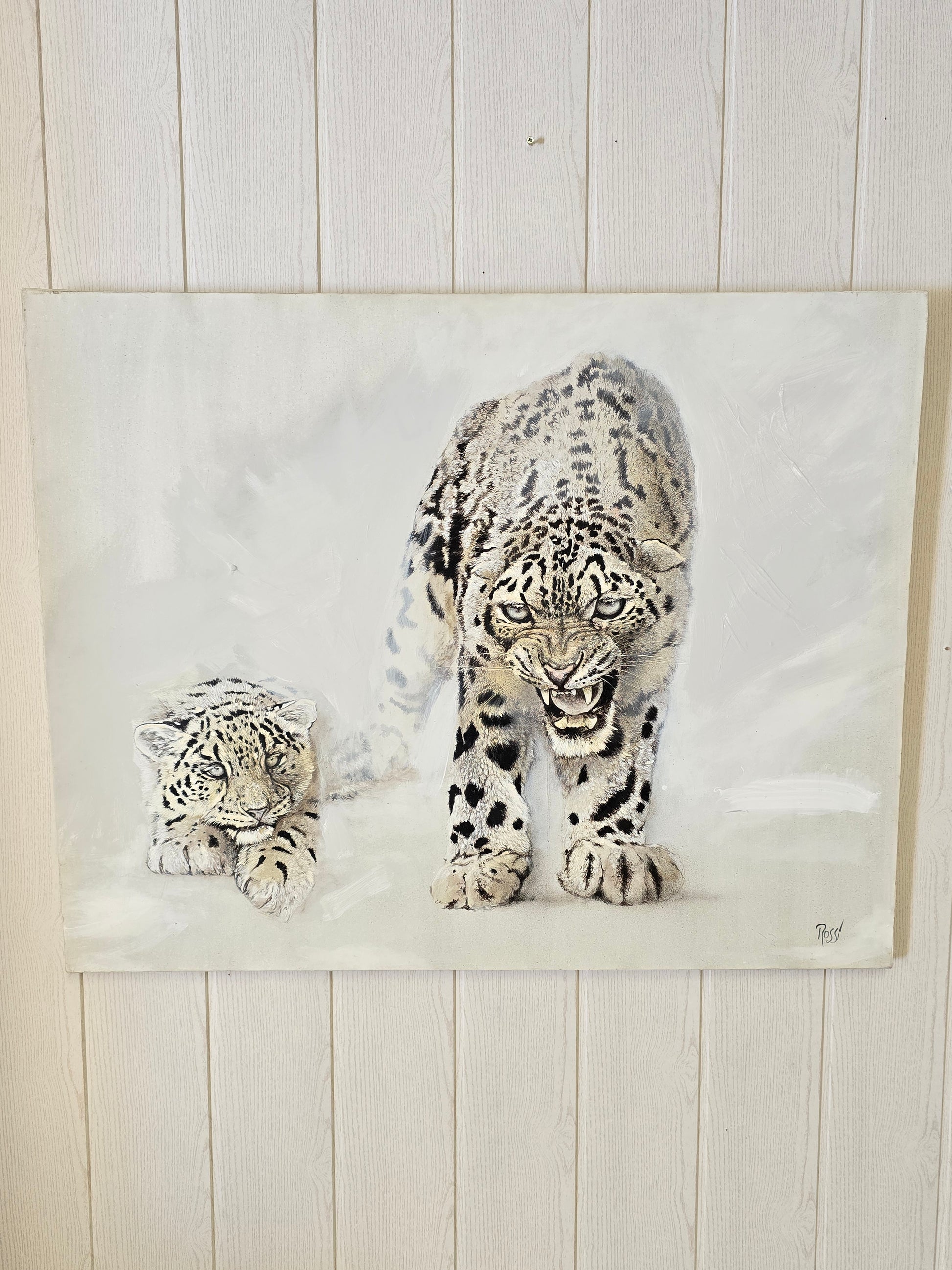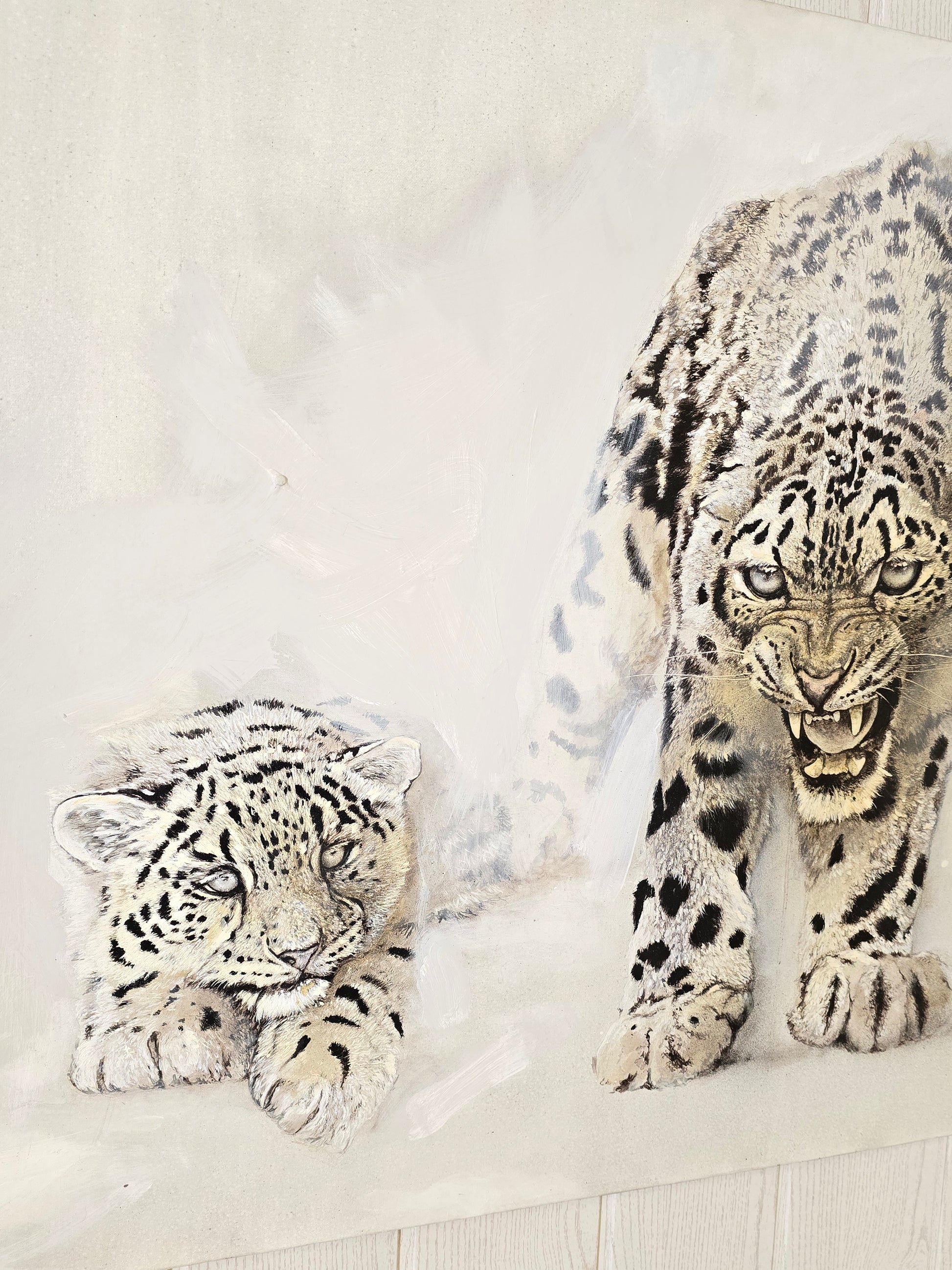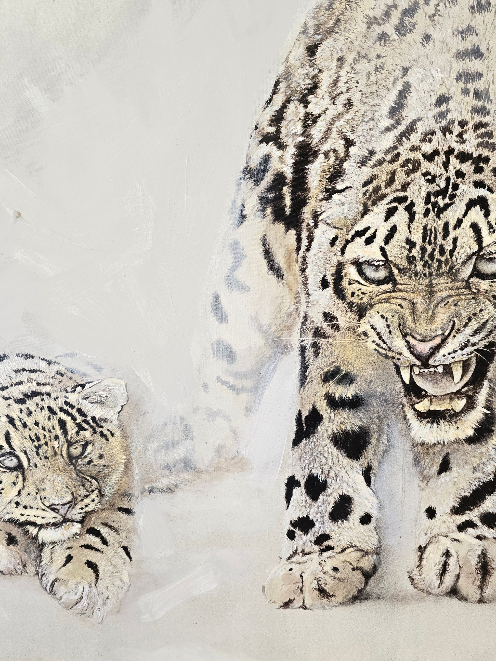 Œuvre représentant un léopard des neiges accompagné de son leopardeau.