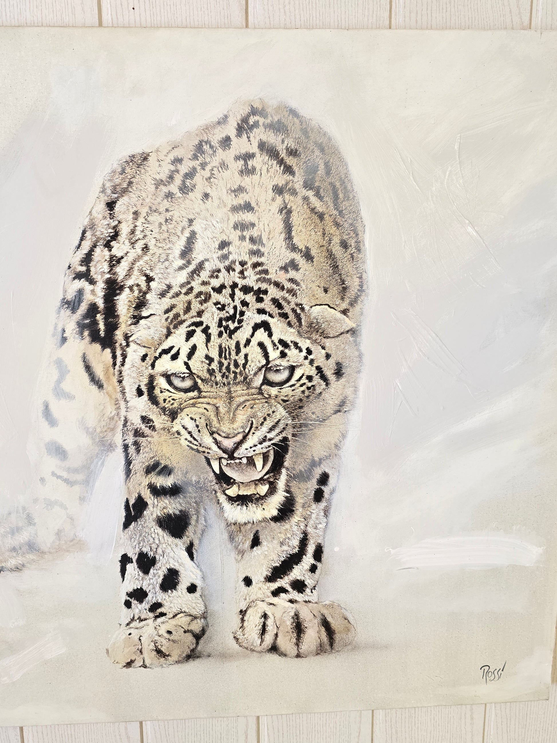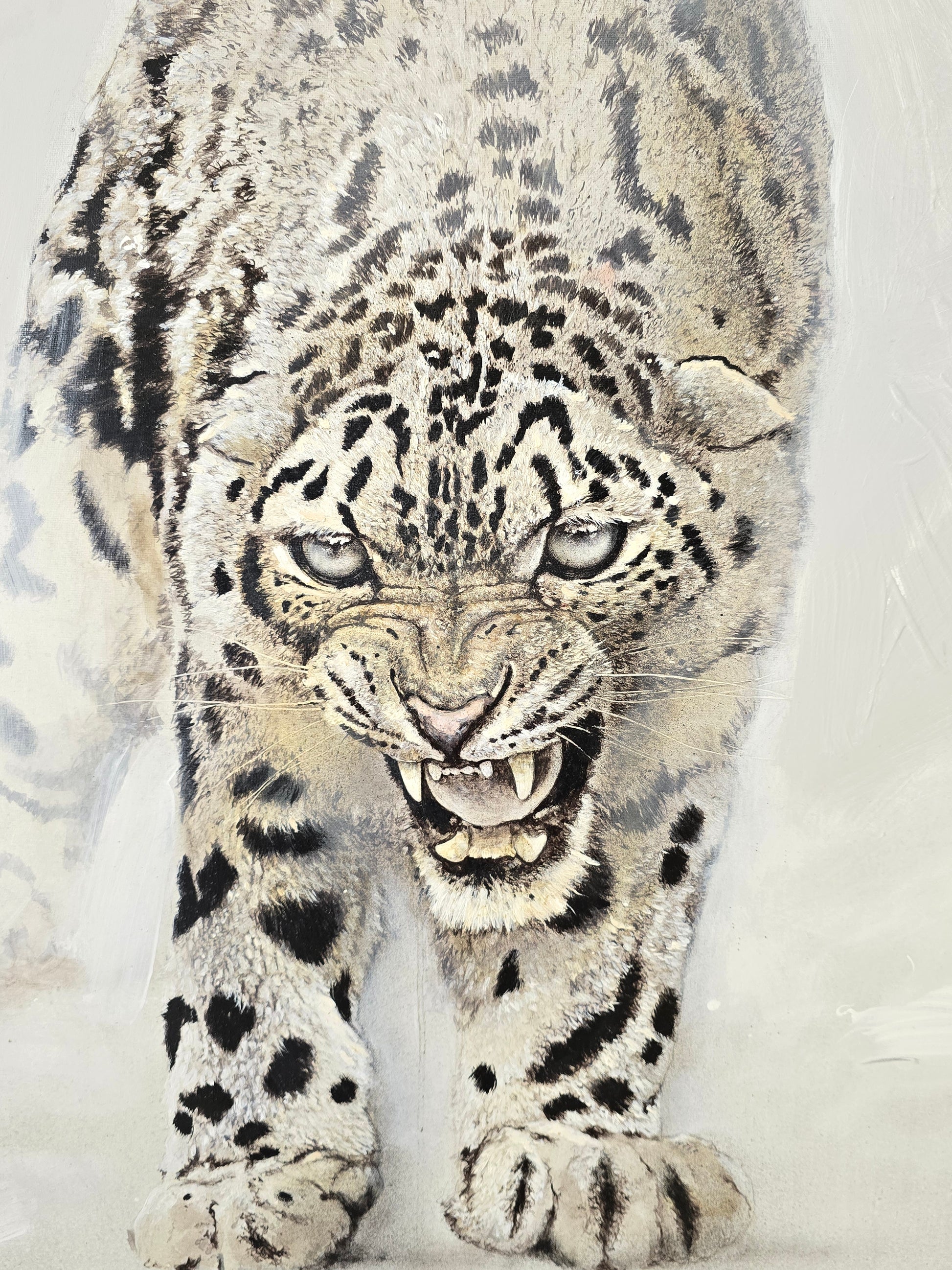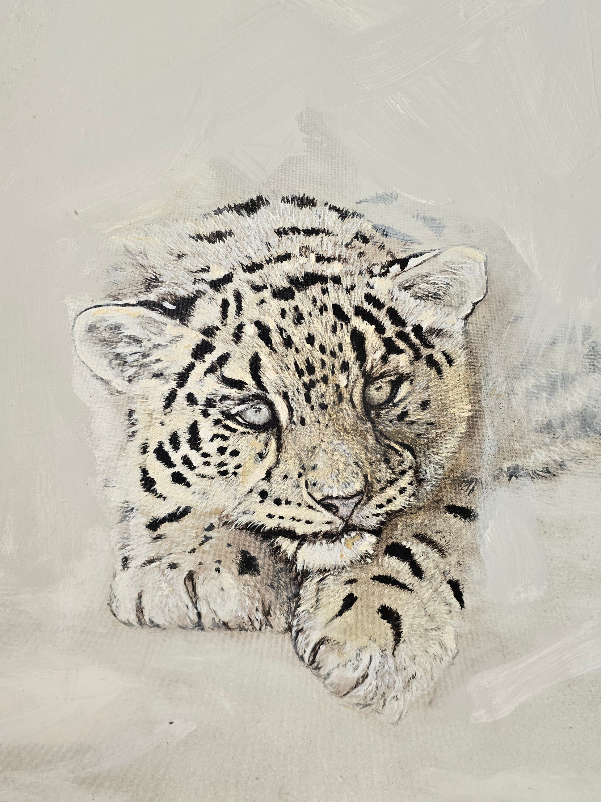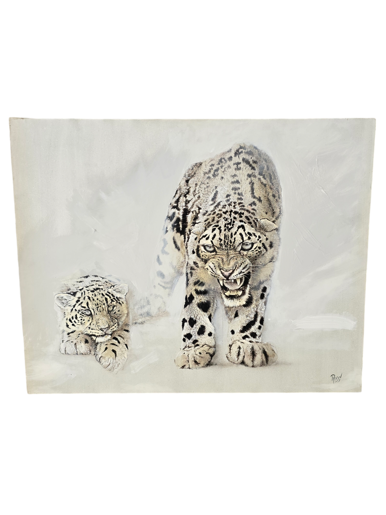 Œuvre représentant un léopard des neiges accompagné de son leopardeau.