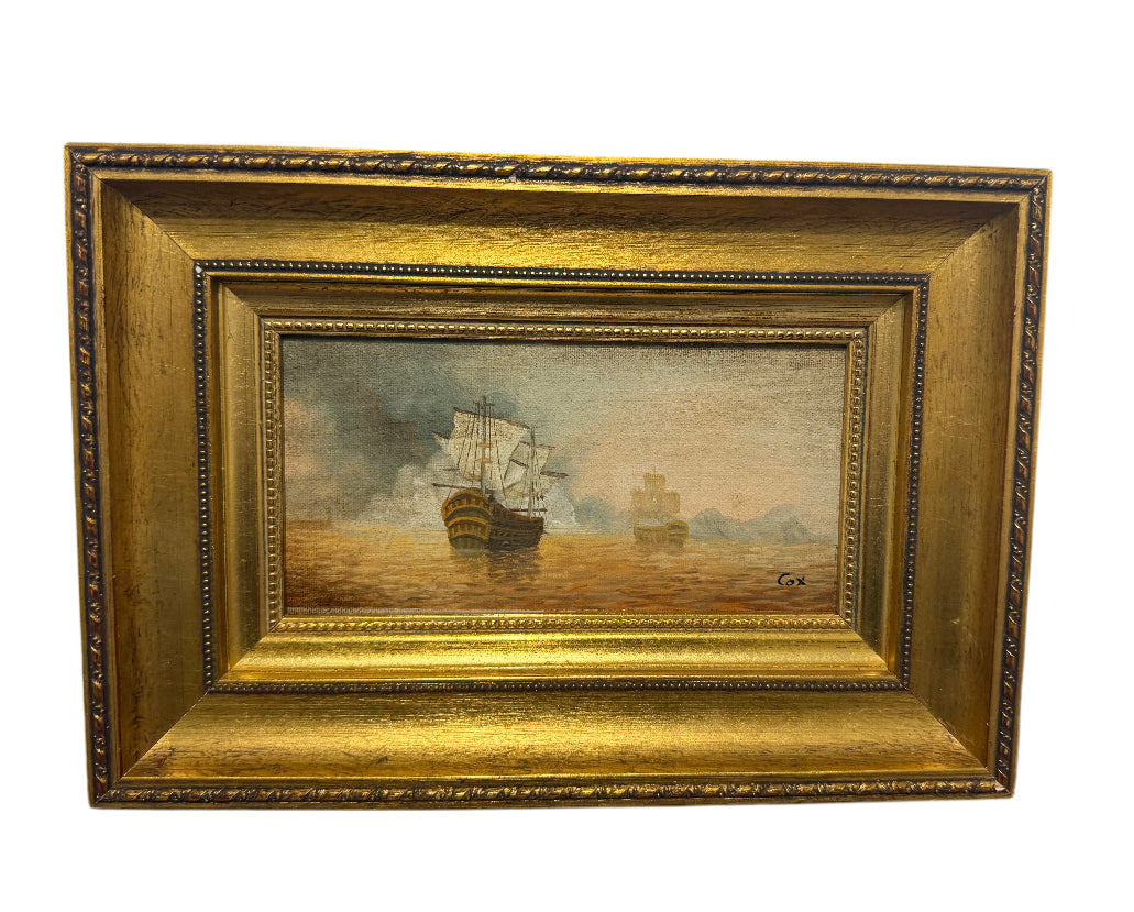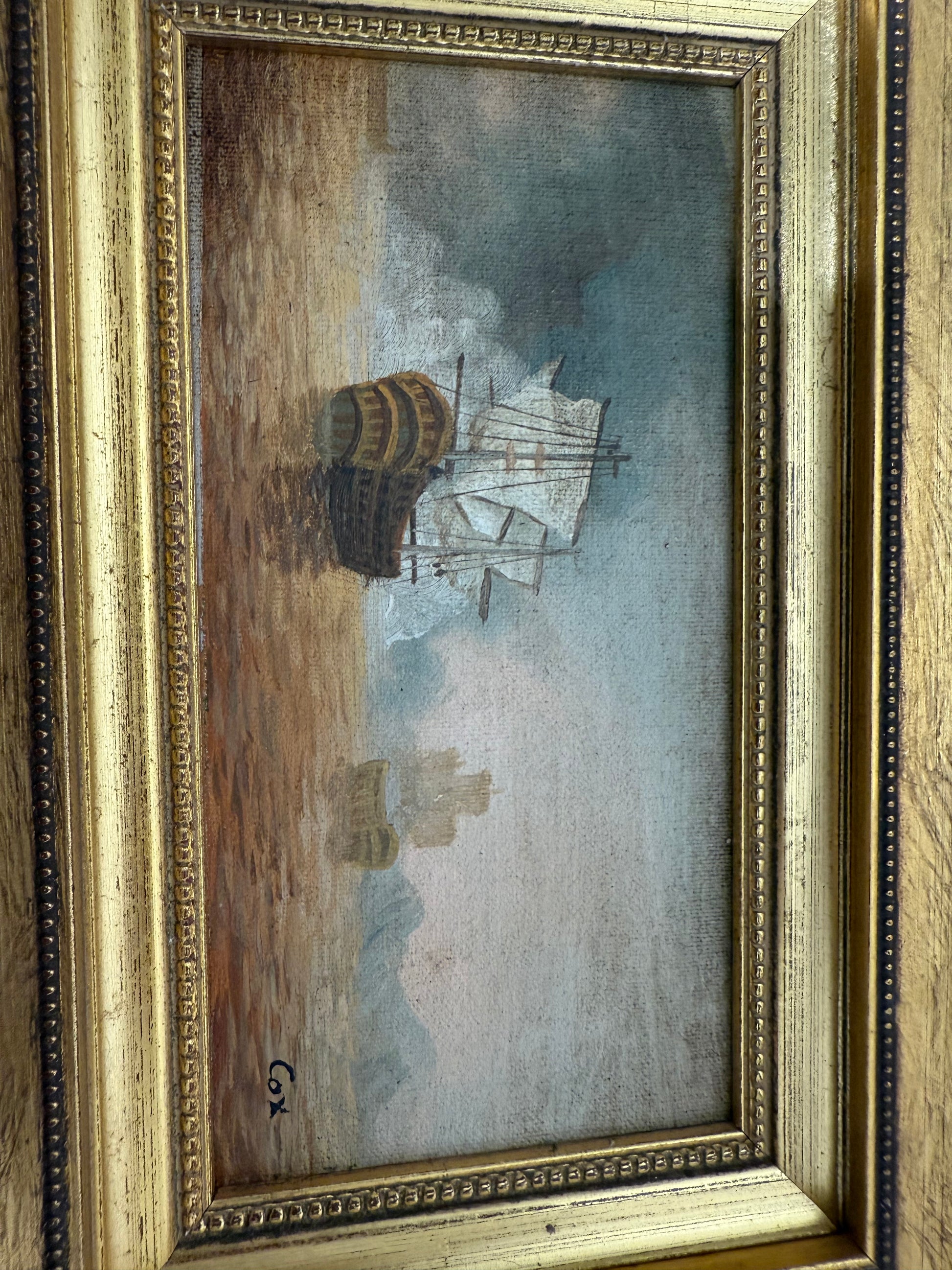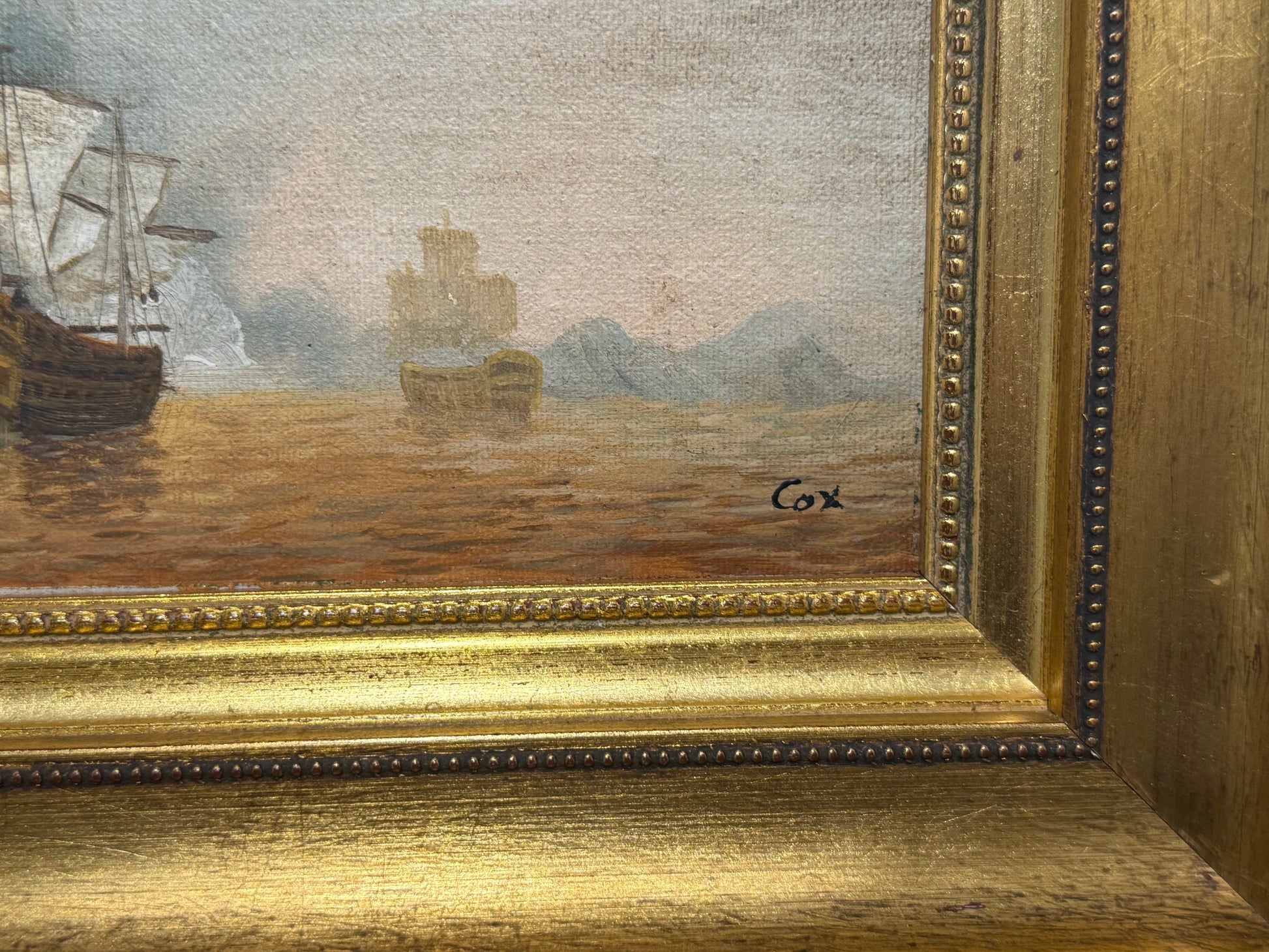 Charmant tableau représentant un voilier naviguant en bord de mer, signé par l’artiste “Cox”. La scène maritime est empreinte de sérénité, avec un voilier aux voiles déployées et un bateau plus petit flottant paisiblement sur l’eau. À l’arrière-plan, on distingue une architecture côtière et une tour s’élevant majestueusement, rappelant les paysages marins méditerranéens.