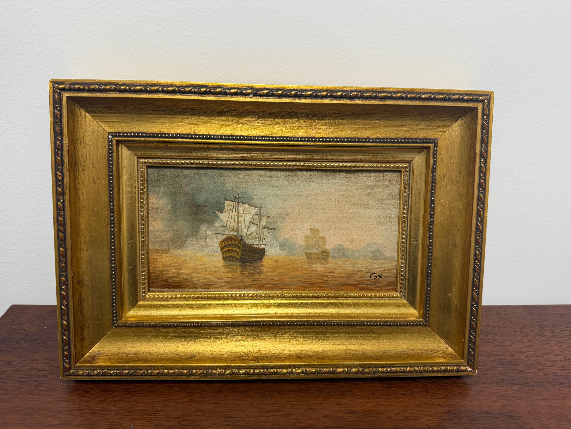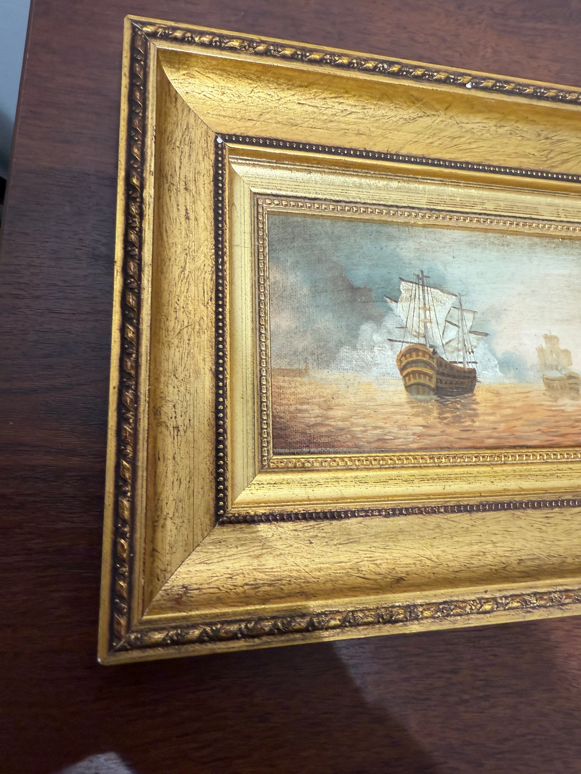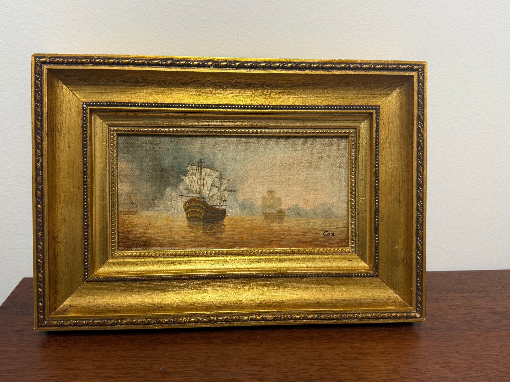 Charmant tableau représentant un voilier naviguant en bord de mer, signé par l’artiste “Cox”. La scène maritime est empreinte de sérénité, avec un voilier aux voiles déployées et un bateau plus petit flottant paisiblement sur l’eau. À l’arrière-plan, on distingue une architecture côtière et une tour s’élevant majestueusement, rappelant les paysages marins méditerranéens.