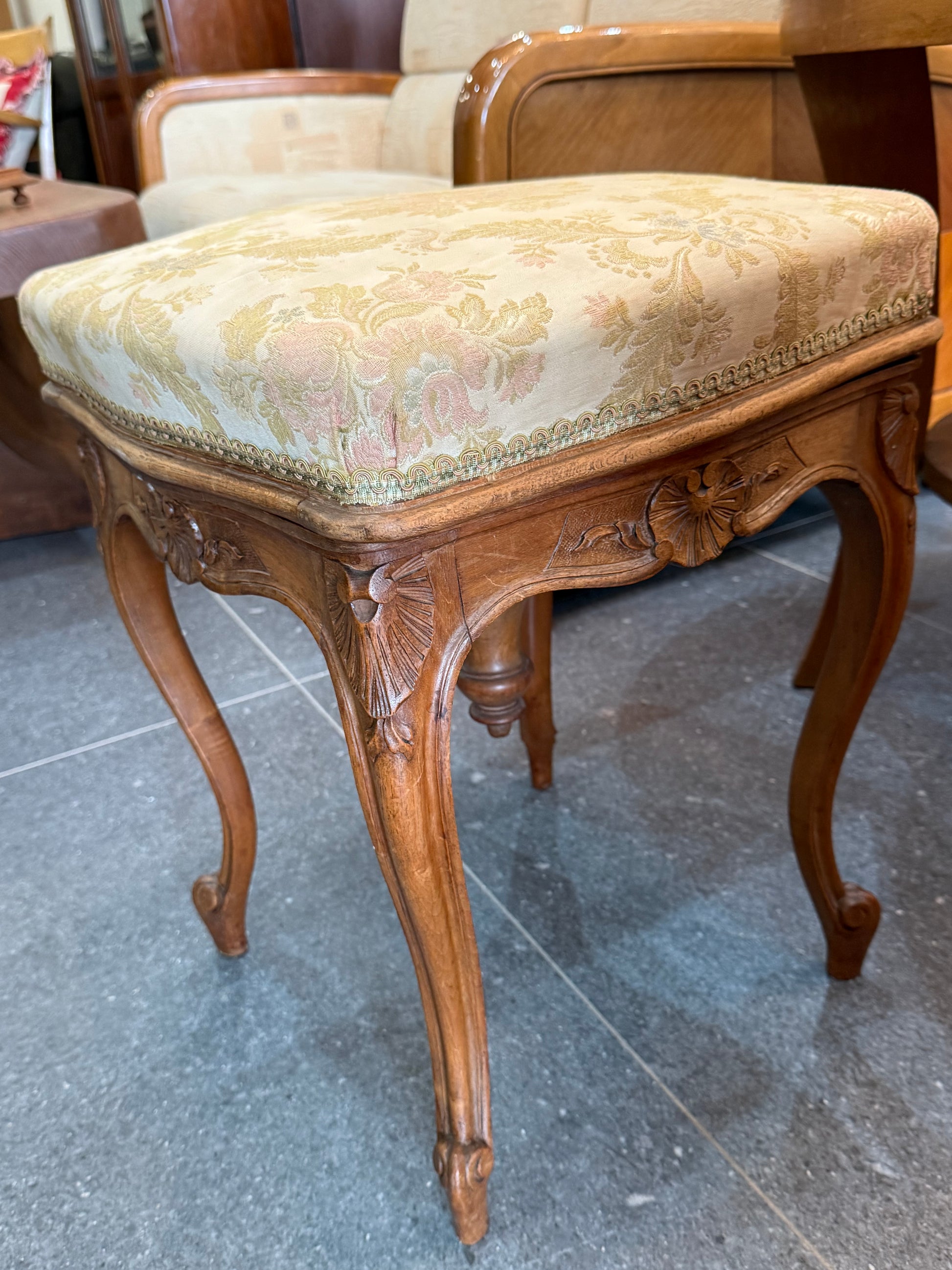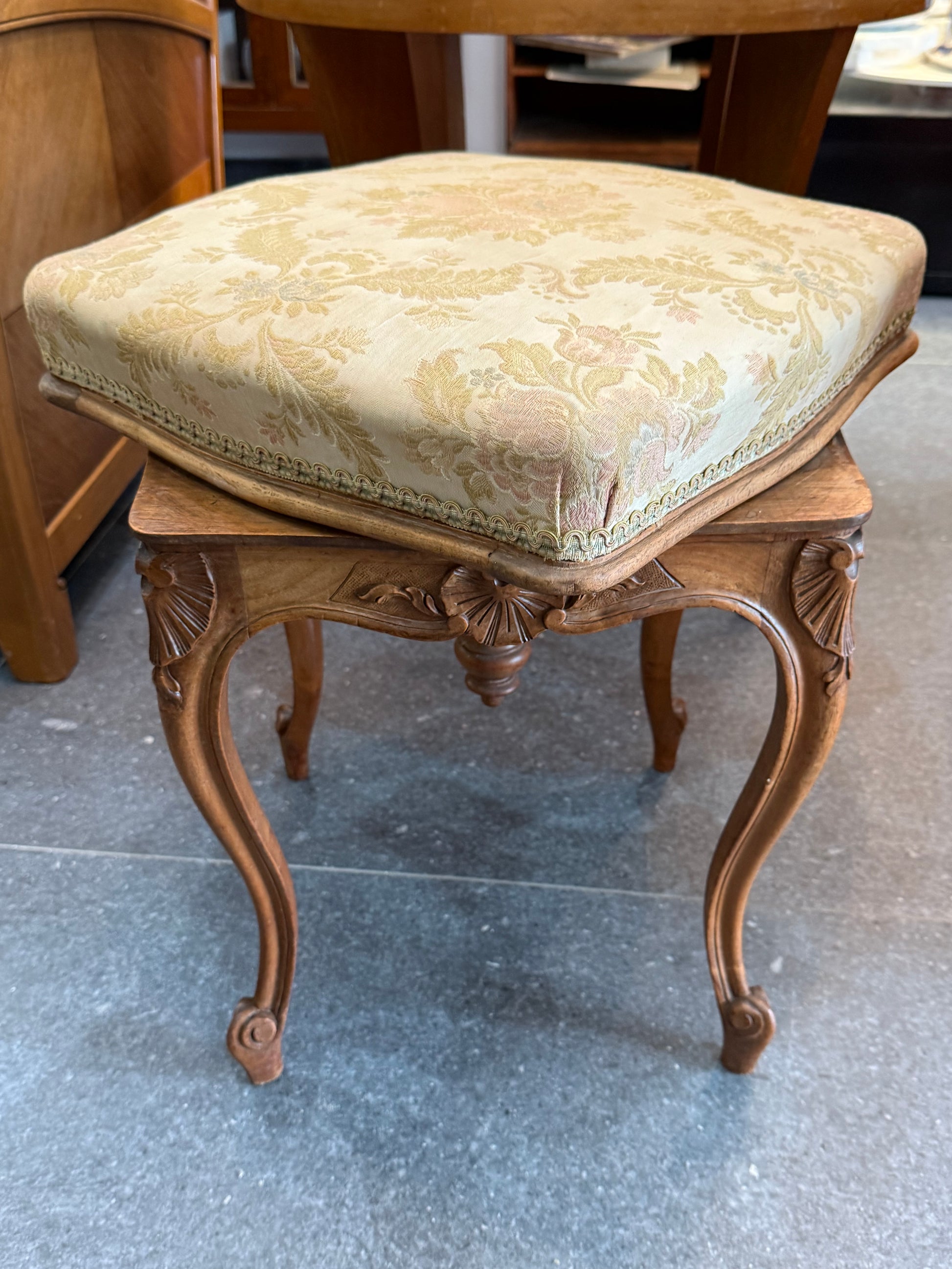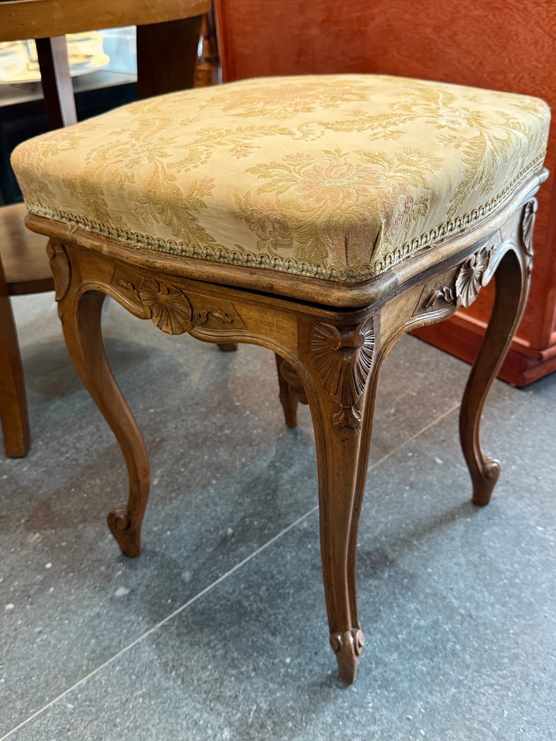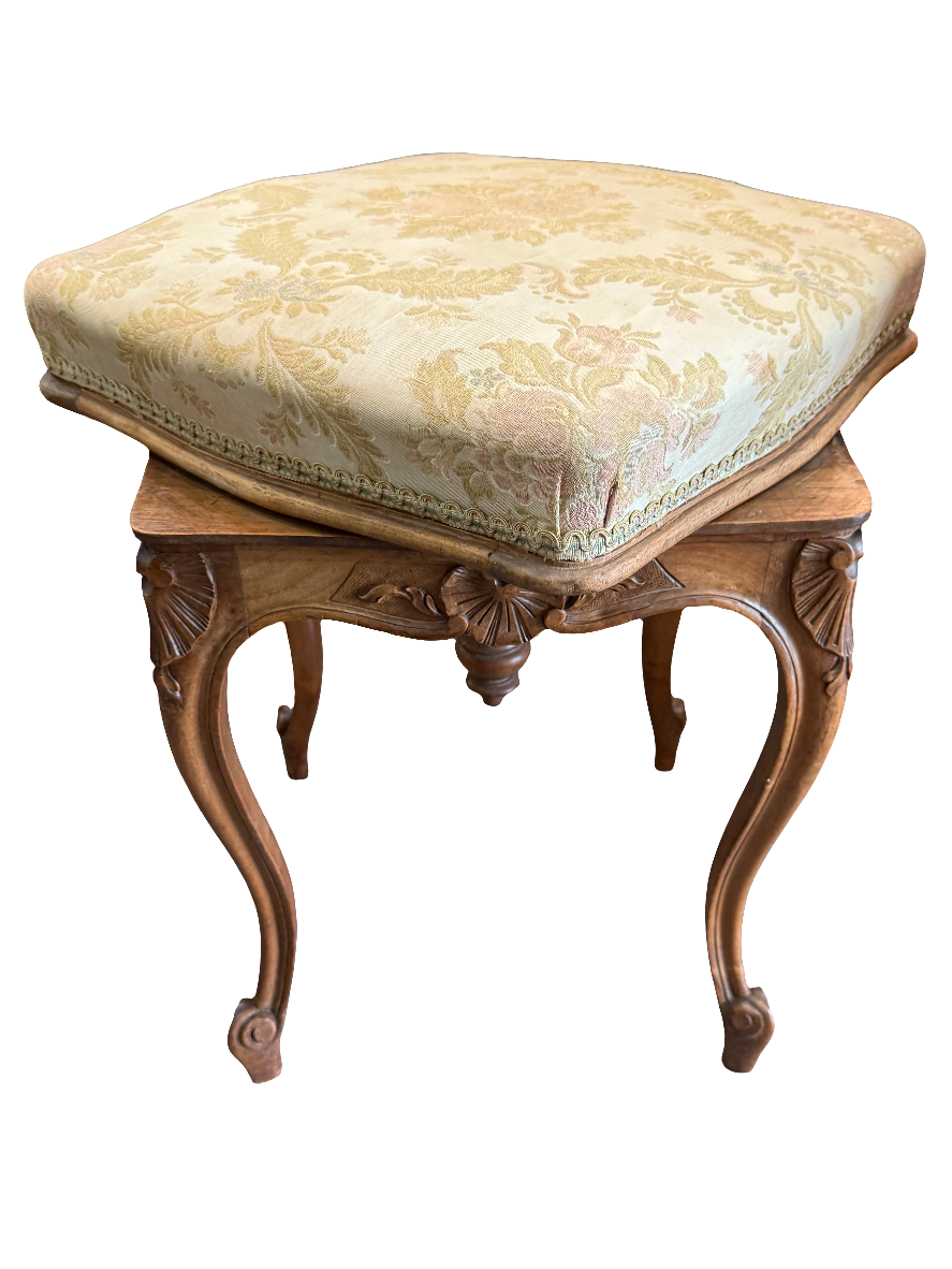 Élégant tabouret de piano de style Louis XV, doté d’une structure en bois massif finement sculptée de motifs coquilles et feuillages. Il repose sur quatre pieds galbés typiques du style et présente une assise confortable recouverte d’un tissu jacquard à motifs floraux (dans des tons doux de beige, rose poudré, vert et bleu pastel). Particularité appréciable : l’assise est pivotante, offrant une fonctionnalité supplémentaire idéale pour un usage devant une coiffeuse ou un bureau. Ce tabouret allie charme classique et praticité.