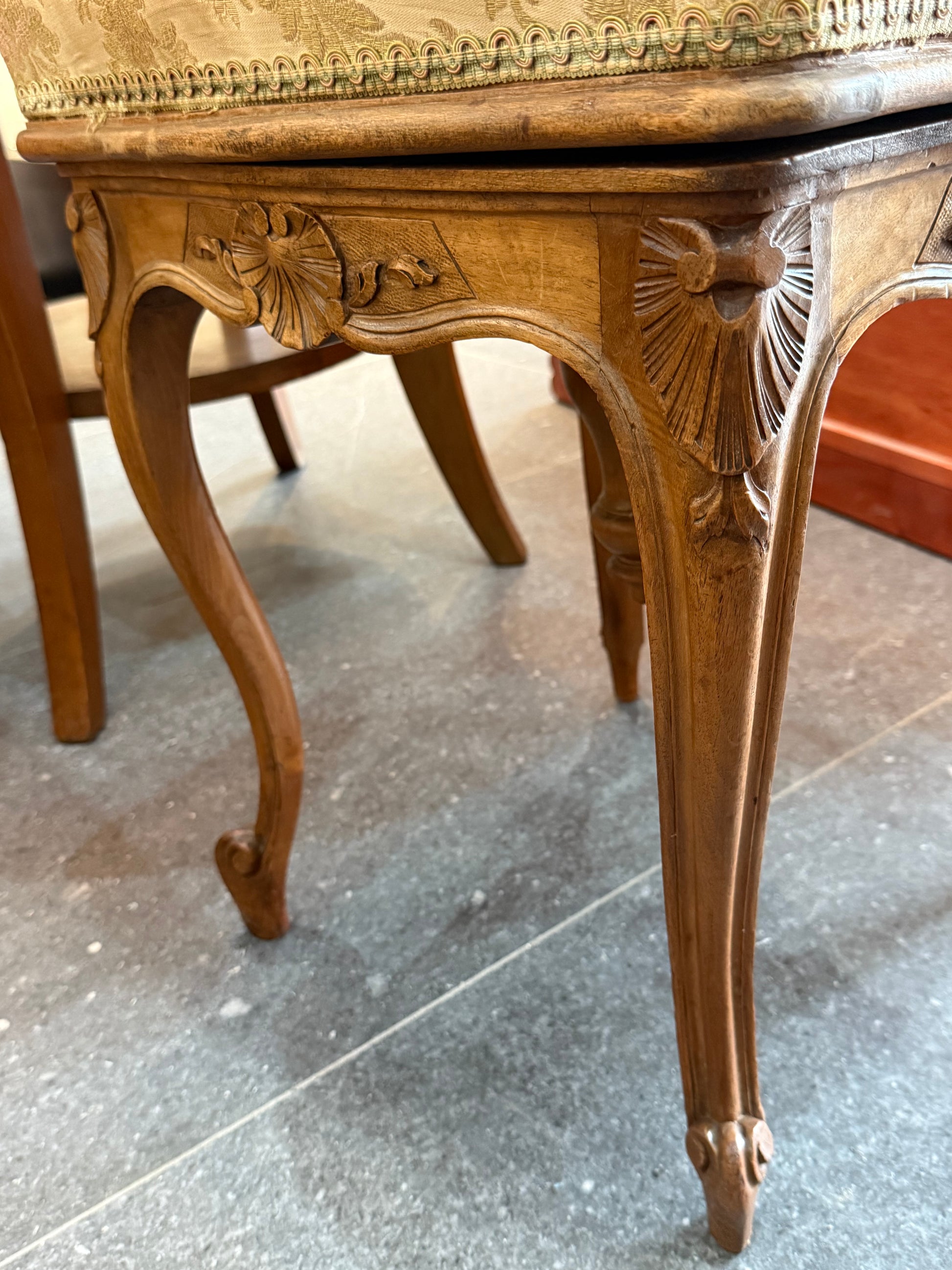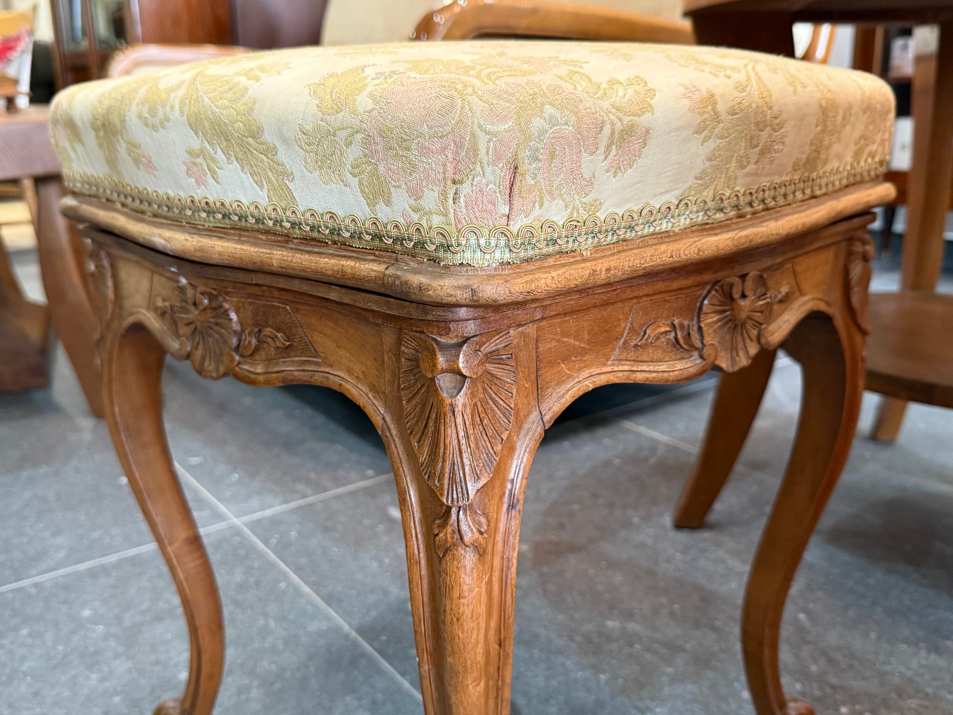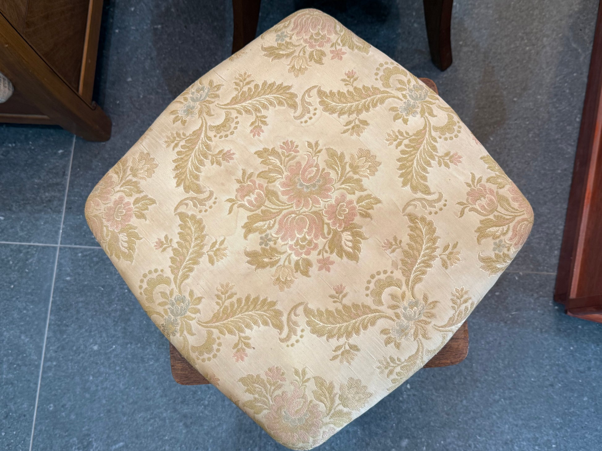 Élégant tabouret de piano de style Louis XV, doté d’une structure en bois massif finement sculptée de motifs coquilles et feuillages. Il repose sur quatre pieds galbés typiques du style et présente une assise confortable recouverte d’un tissu jacquard à motifs floraux (dans des tons doux de beige, rose poudré, vert et bleu pastel). Particularité appréciable : l’assise est pivotante, offrant une fonctionnalité supplémentaire idéale pour un usage devant une coiffeuse ou un bureau. Ce tabouret allie charme classique et praticité.