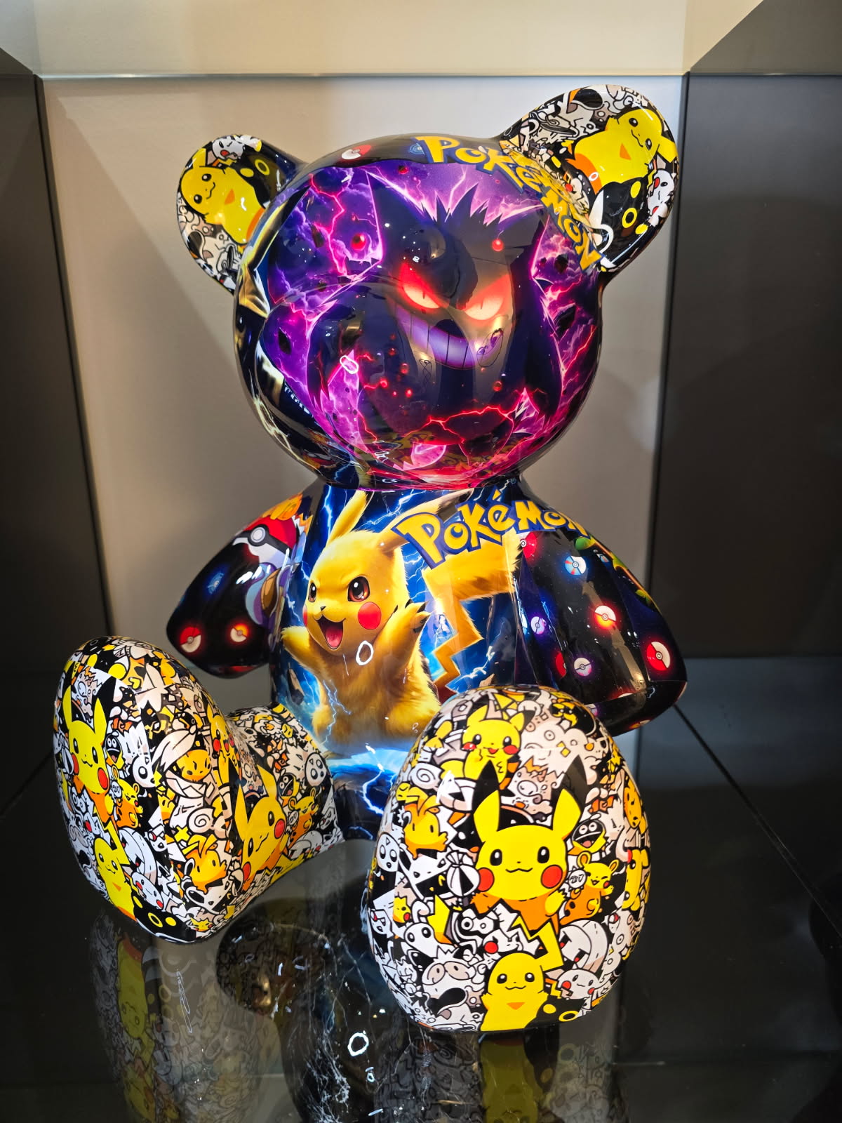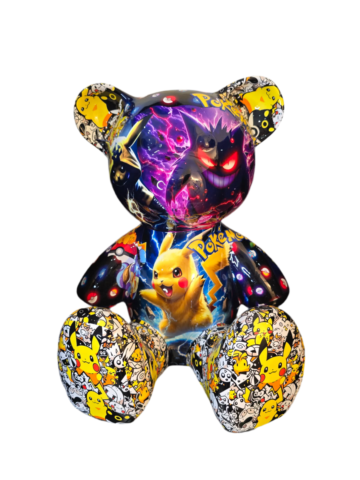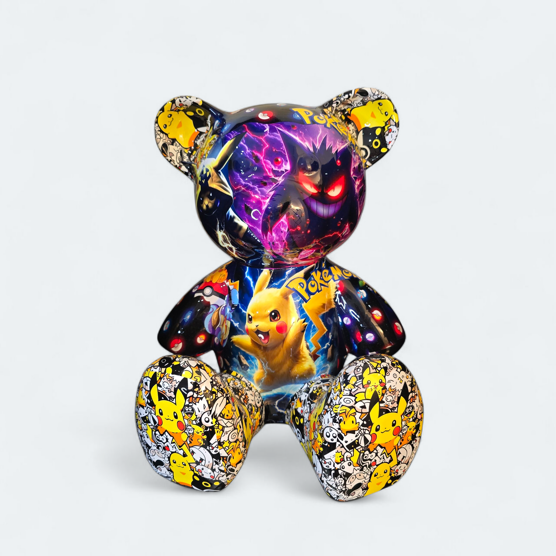 Cette sculpture Teddy Pokémon de 35 cm réinterprète l’iconique silhouette du Teddy Bear dans une version explosive, où se mêlent les héros emblématiques de la saga Pokémon : Pikachu, Mewtwo, Dracaufeu, Gengar, Lucario, Ninetales et bien d’autres.