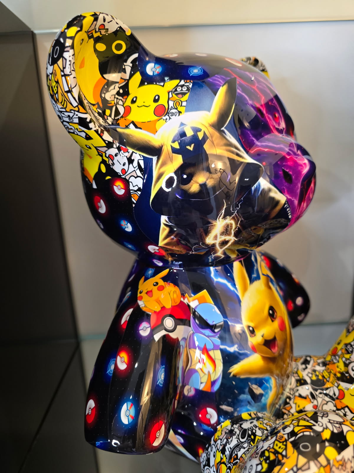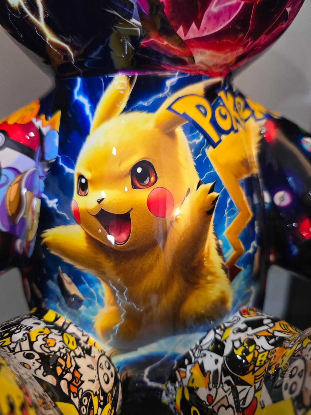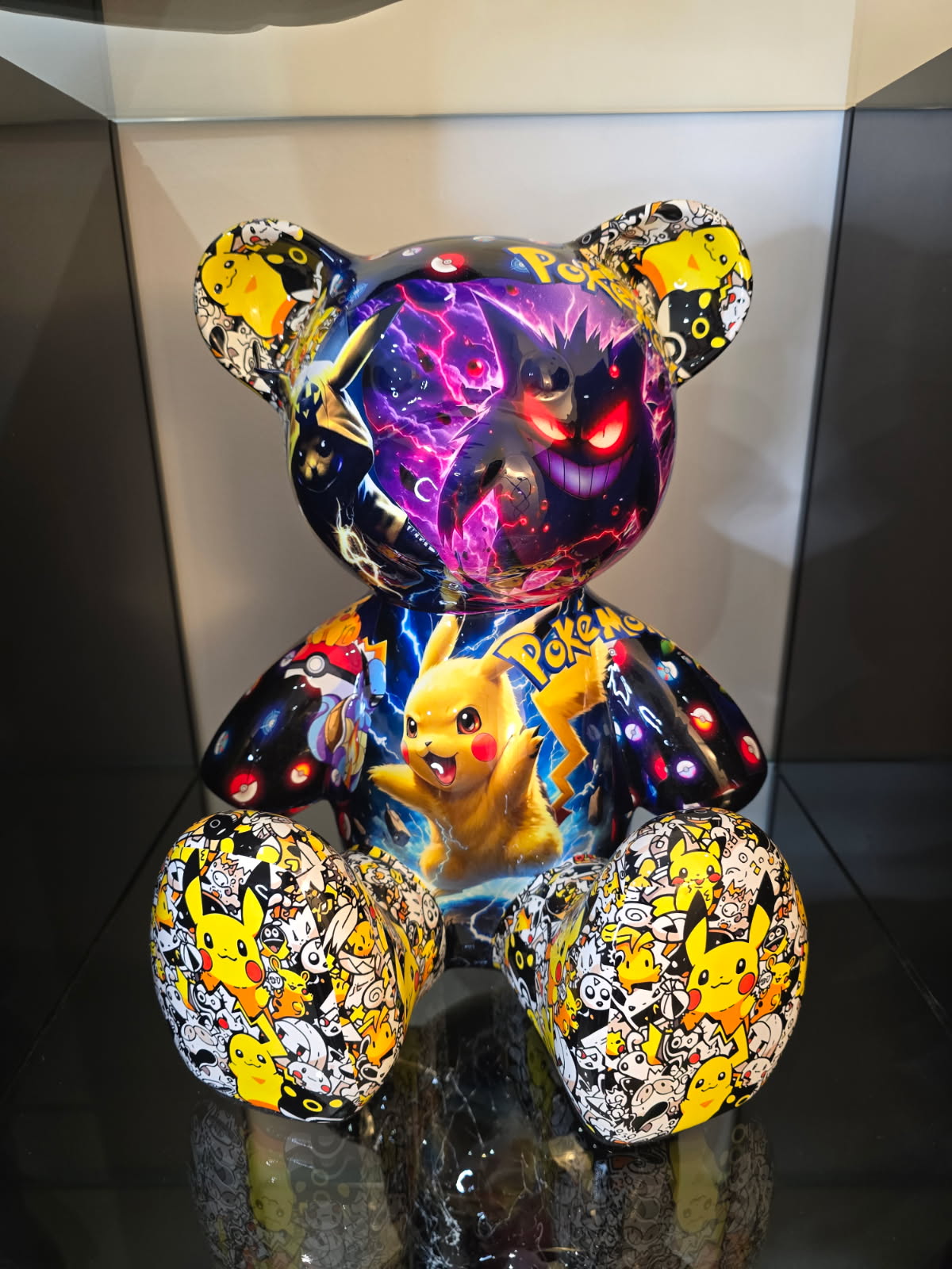 Cette sculpture Teddy Pokémon de 35 cm réinterprète l’iconique silhouette du Teddy Bear dans une version explosive, où se mêlent les héros emblématiques de la saga Pokémon : Pikachu, Mewtwo, Dracaufeu, Gengar, Lucario, Ninetales et bien d’autres.