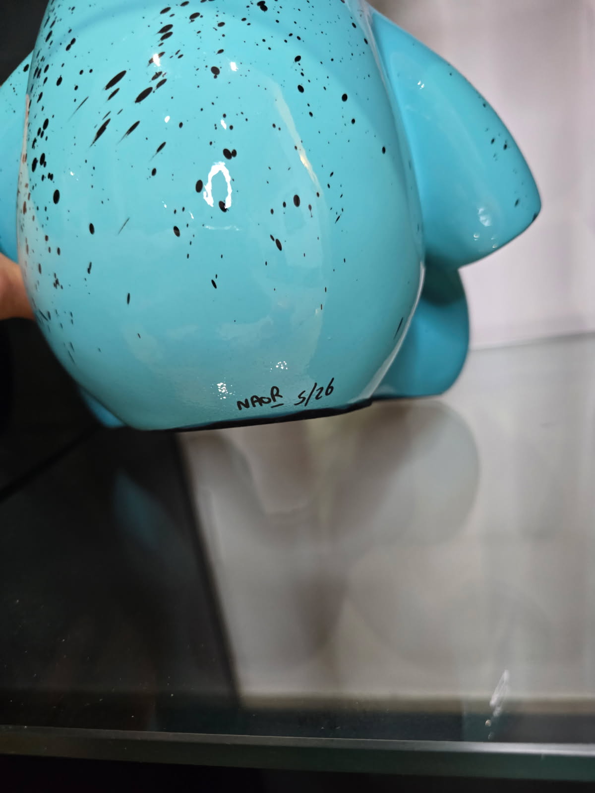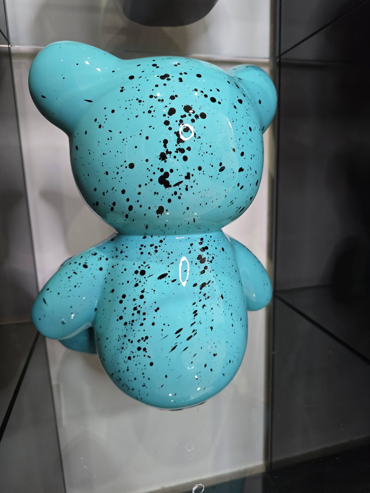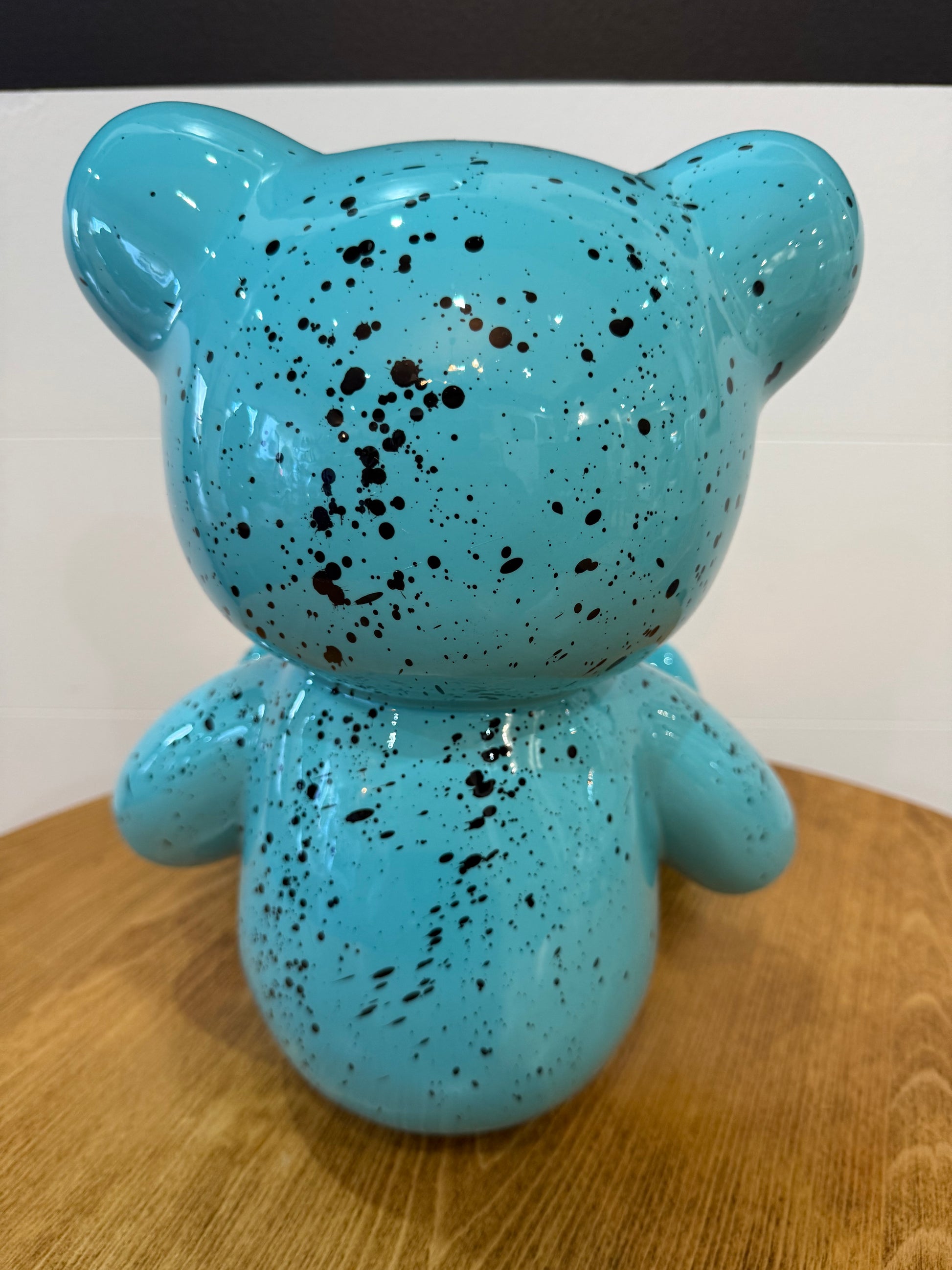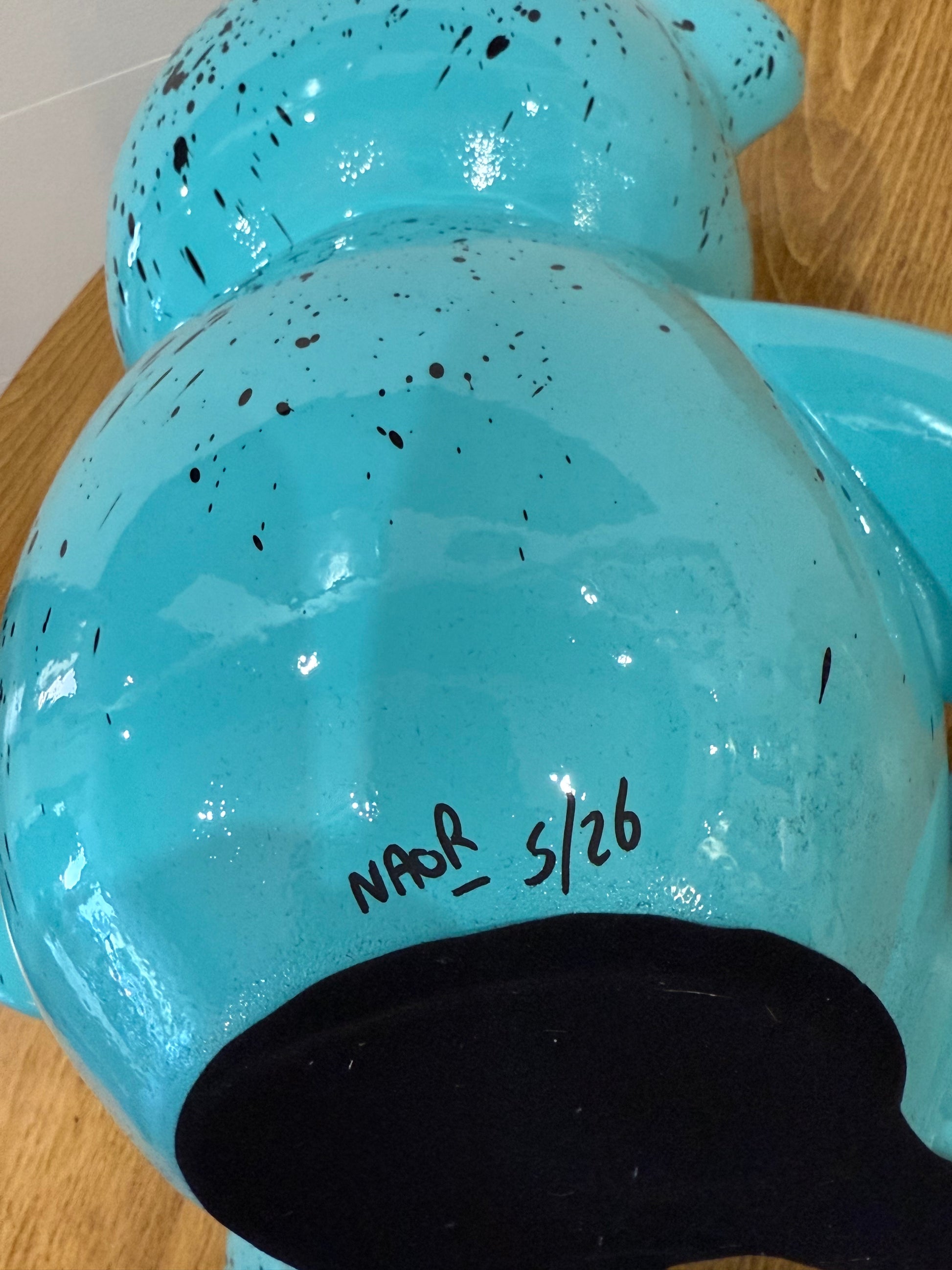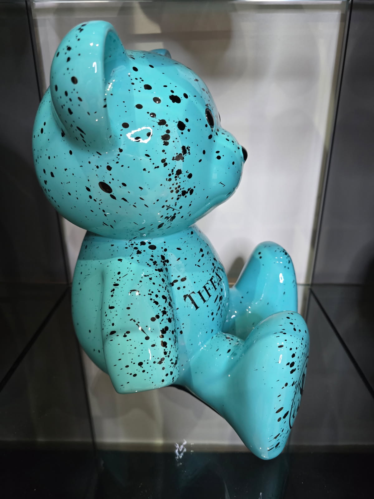 Réalisée dans le mythique bleu Tiffany, sublimé d’éclaboussures artistiques noires façon "dripping", cette sculpture en résine capture l’essence de l’iconique maison new-yorkaise tout en affirmant le style unique de l’artiste Naor.