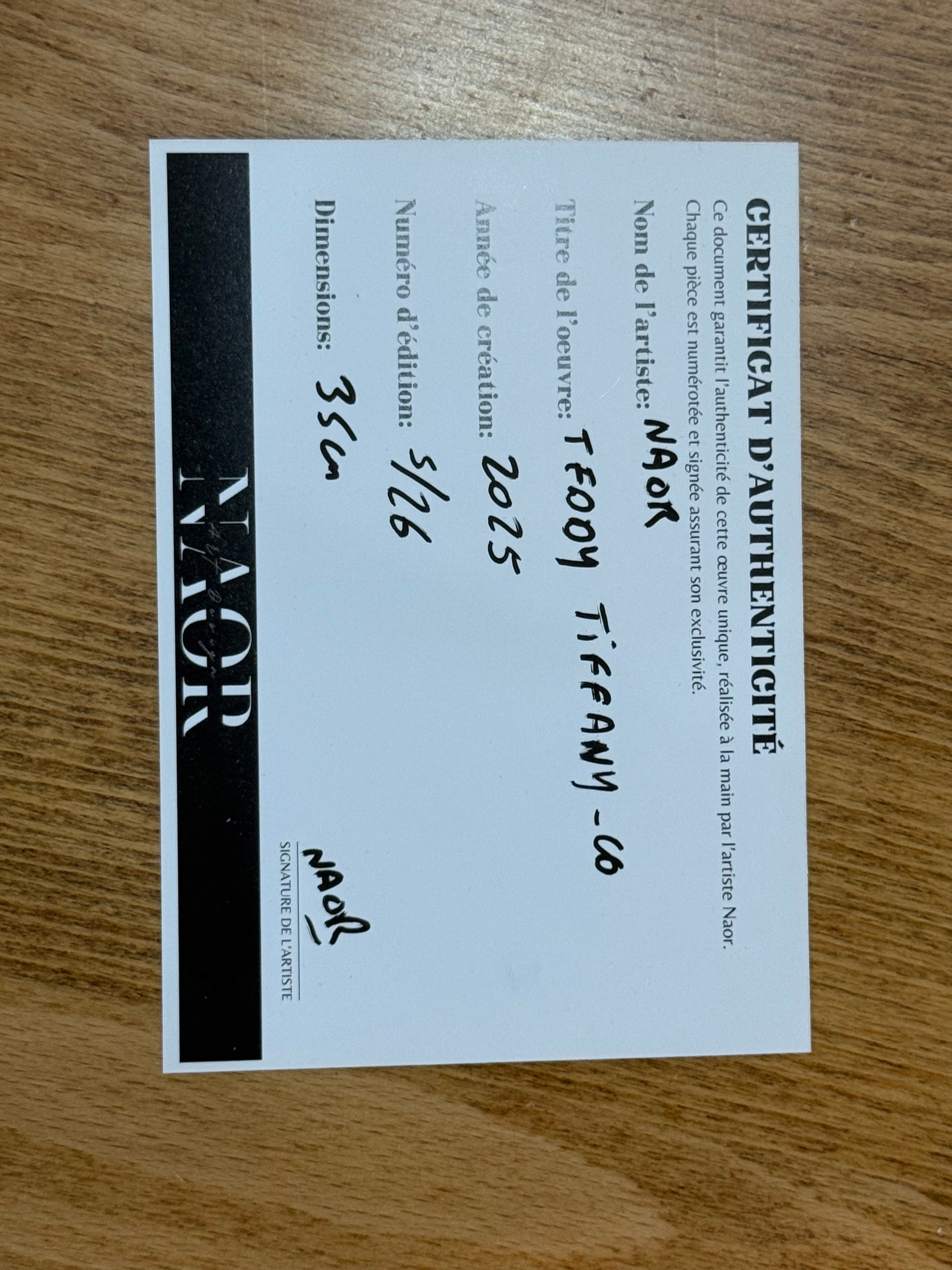 Alliance parfaite entre l’élégance joaillière de Tiffany & Co et l’audace du Pop Art contemporain, ce Teddy signé Naor est une pièce de collection exclusive qui magnifie le design et le luxe.