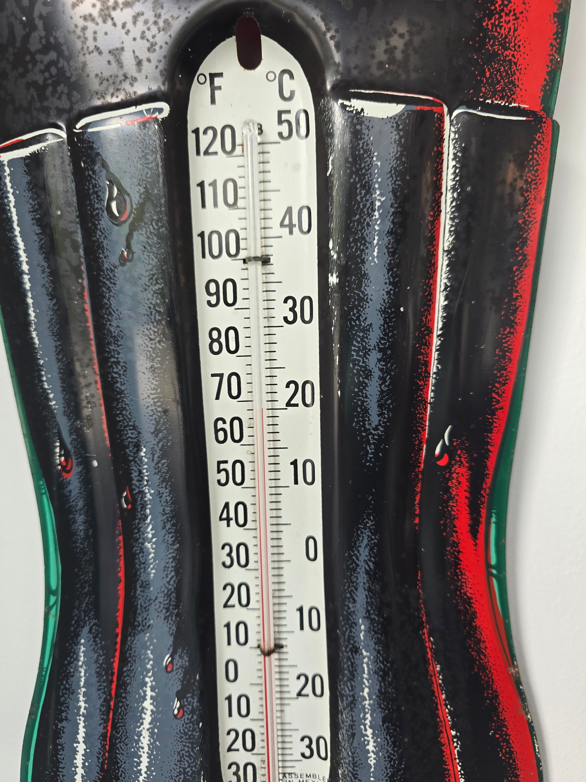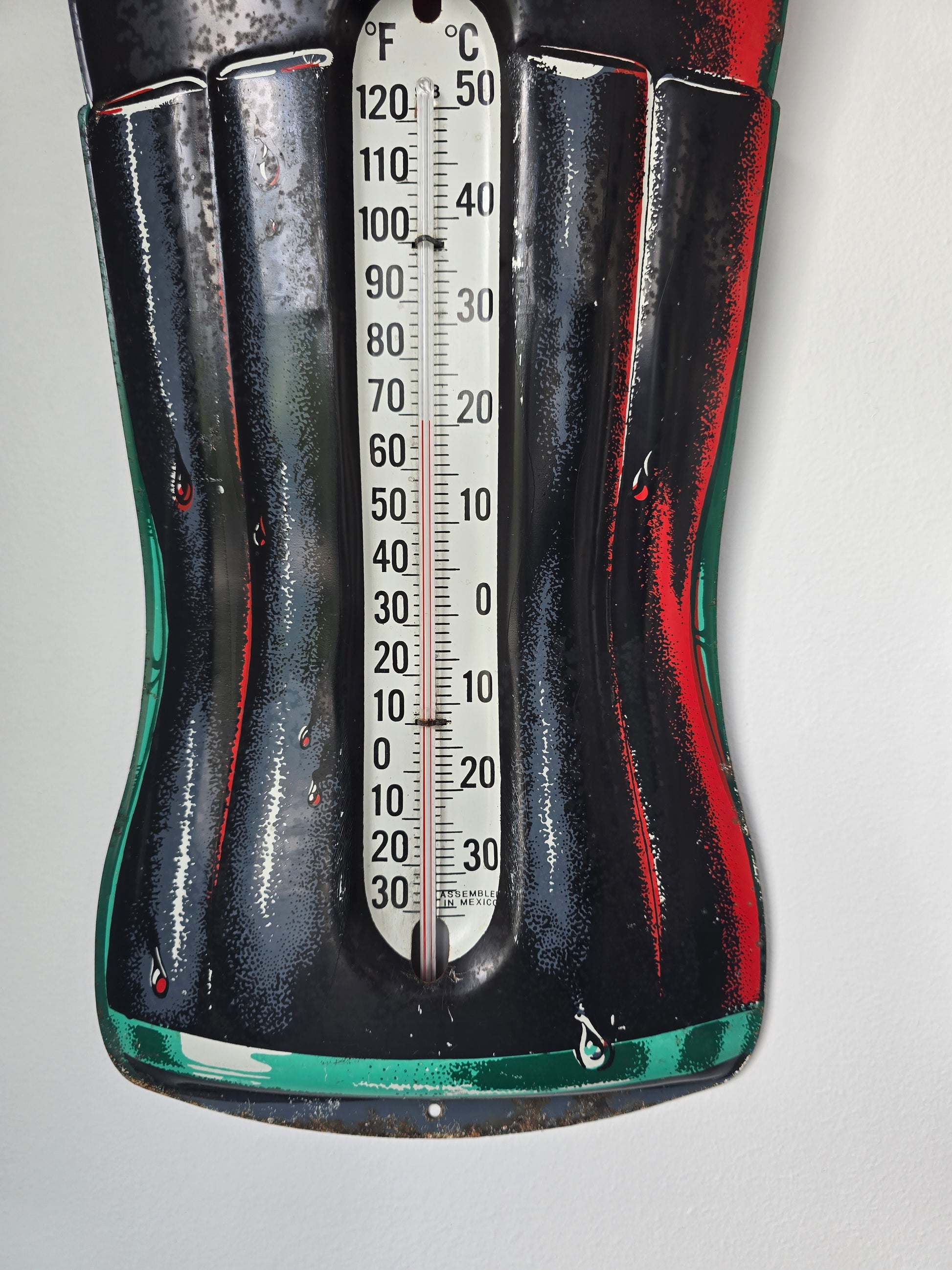 Superbe thermomètre publicitaire Coca-Cola en plaque métallique emboutie, représentant la célèbre bouteille contour de la marque américaine. Ce modèle associe esthétisme vintage et fonctionnalité, avec un thermomètre central gradué en Celsius et Fahrenheit.