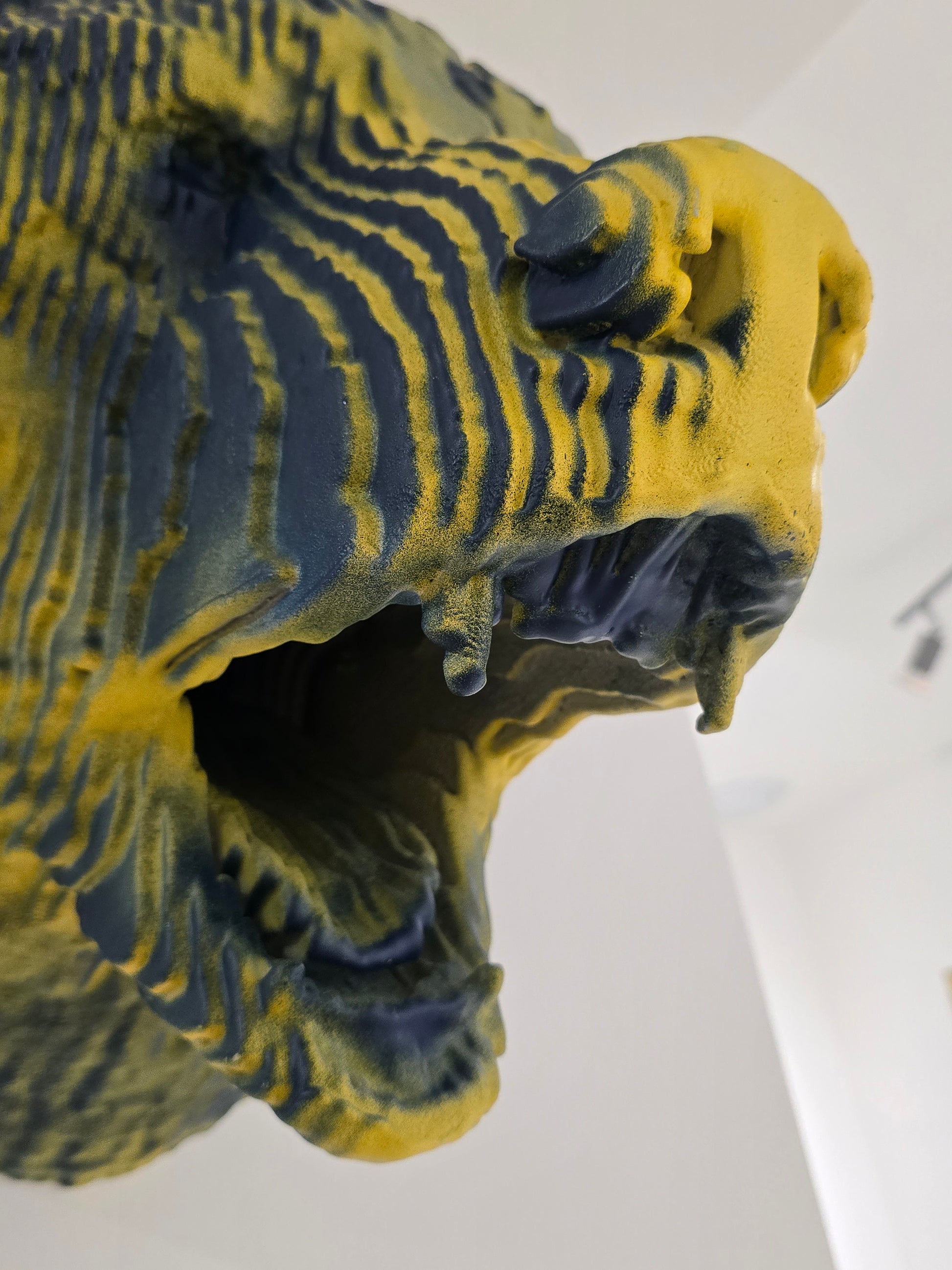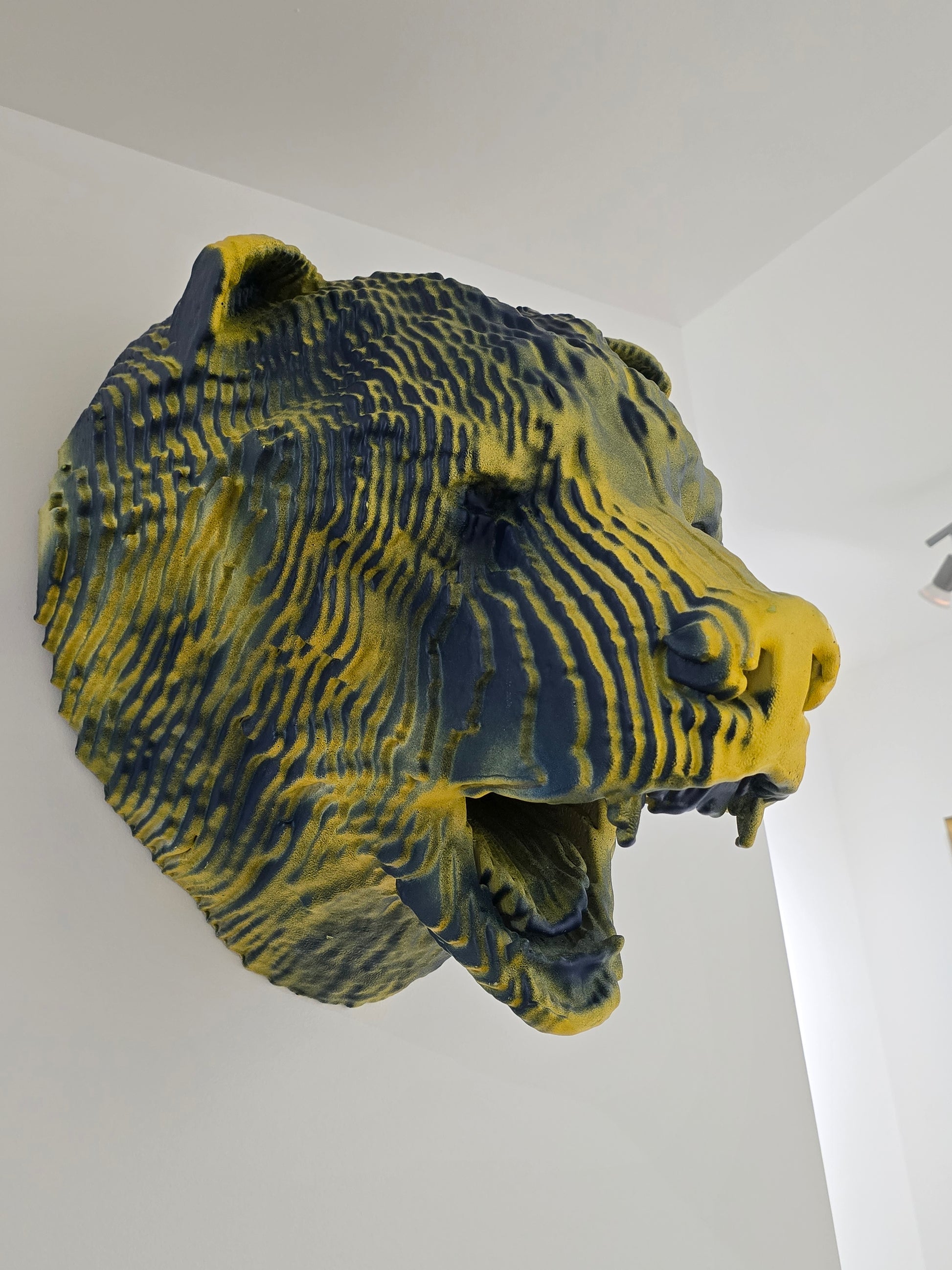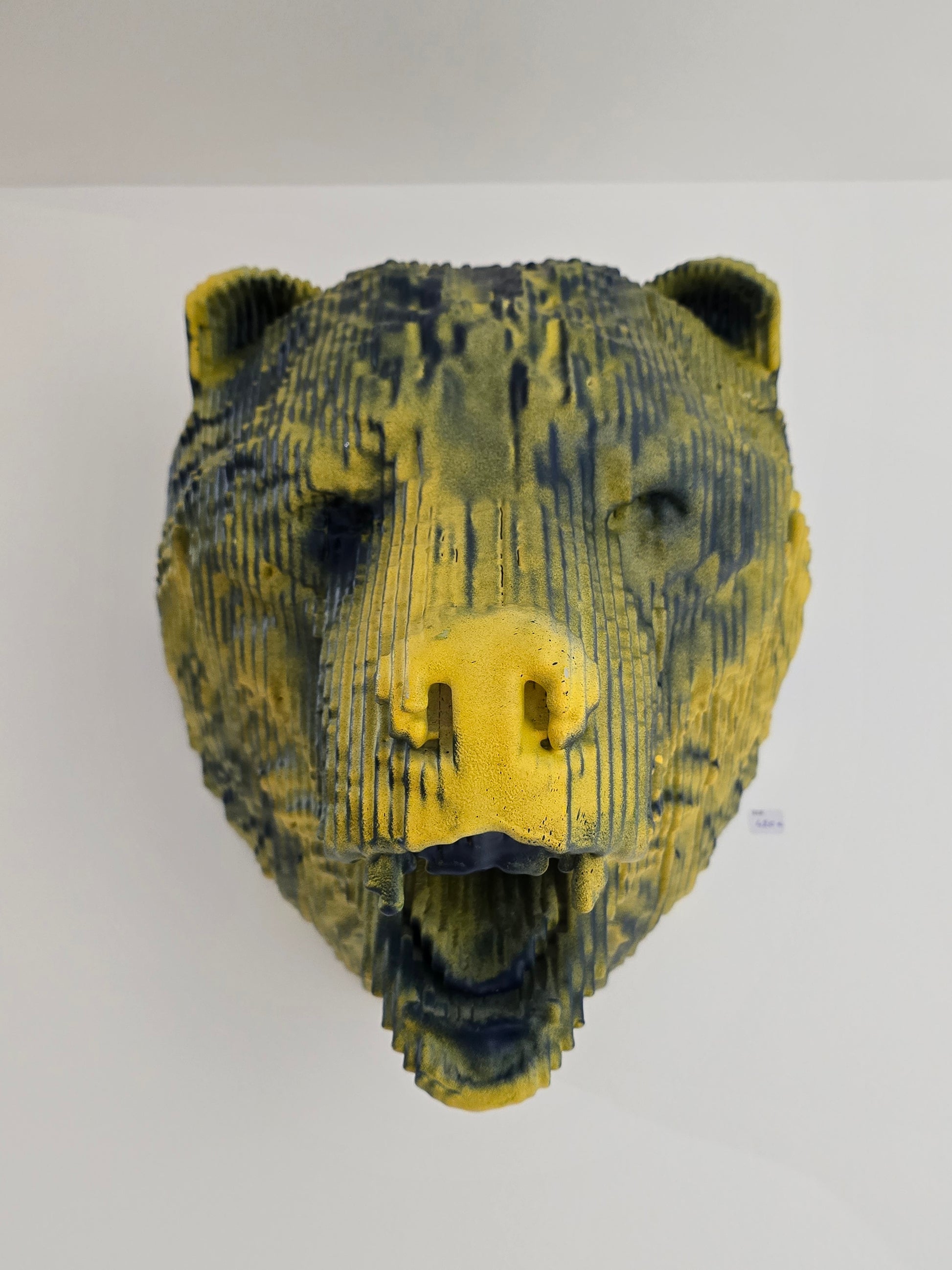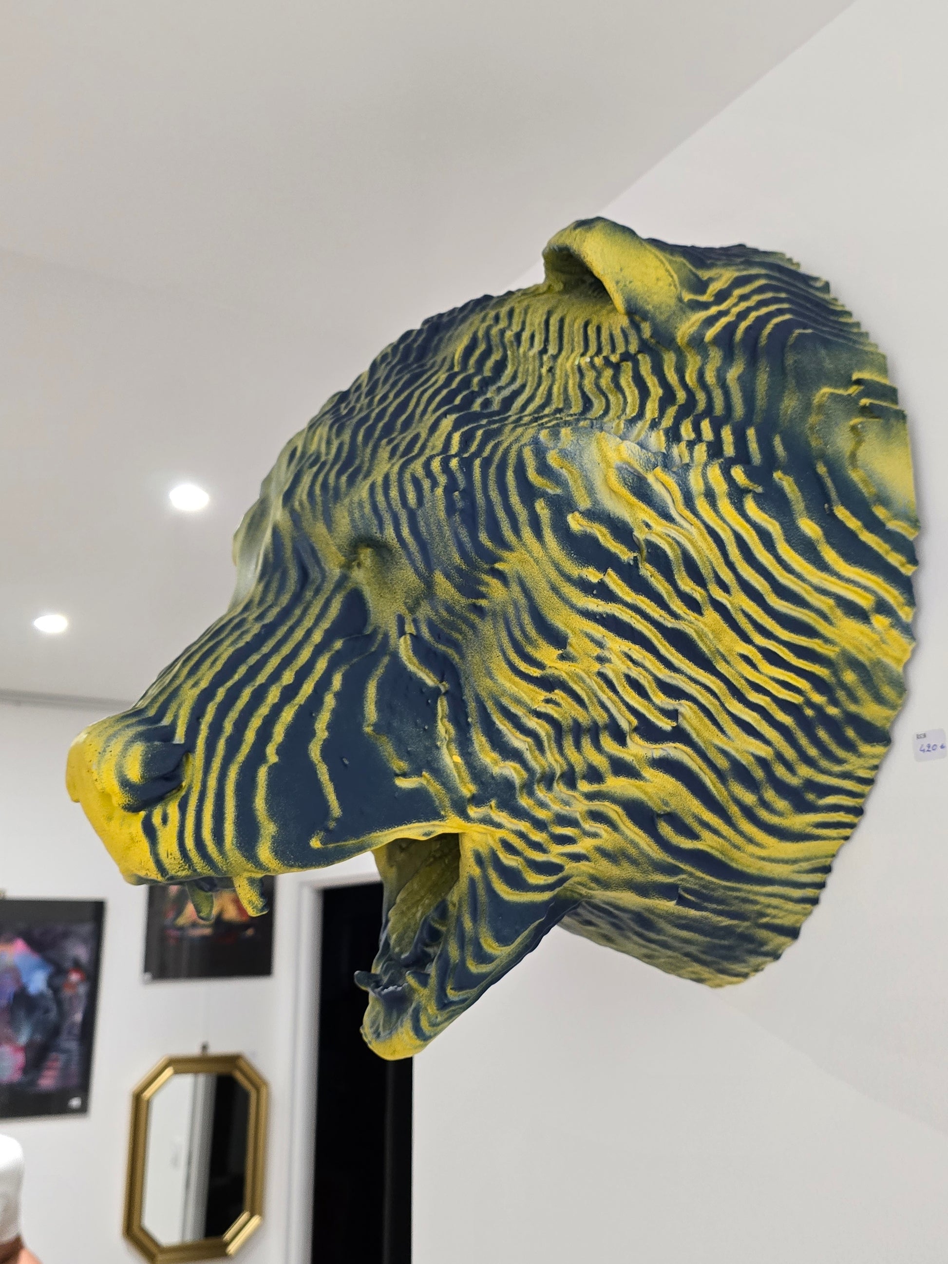 Ce trophée tête d'ours 3D jaune et bleu est une véritable oeuvre d'art. La beauté de son design allie l'esthétique à l'originalité, offrant une décoration unique pour tout espace intérieur. Ajoutez une touche élégante et puissante à votre maison ou à votre bureau avec ce magnifique trophée. Sculpture en carton solidifier, ce rapprochant de la résine