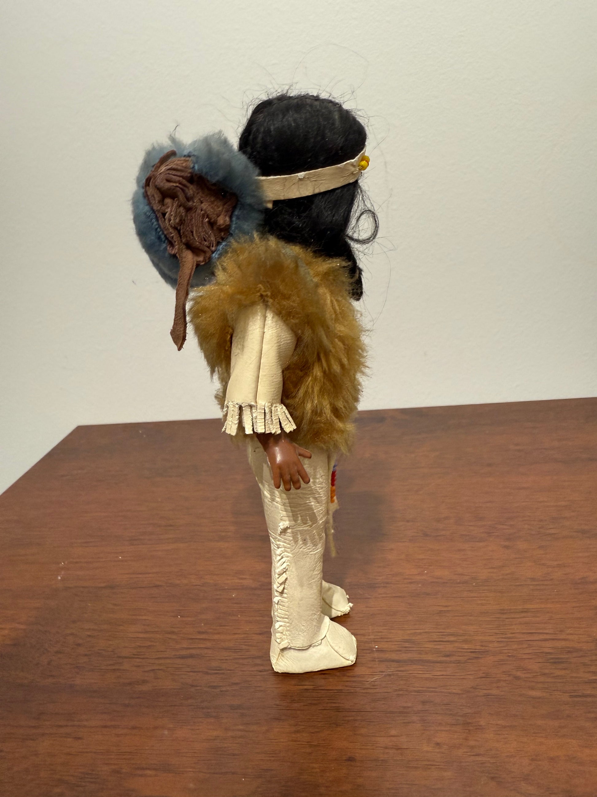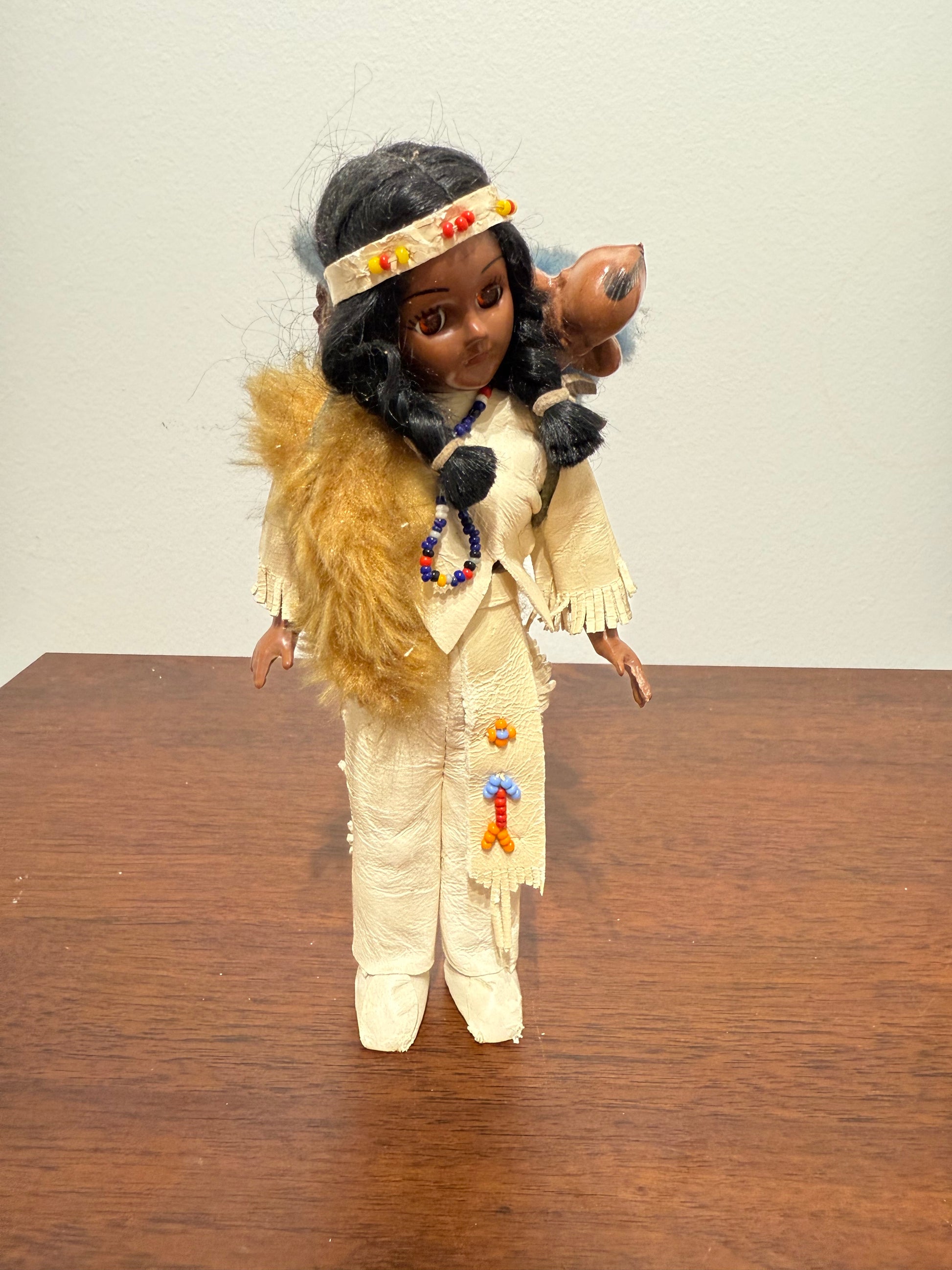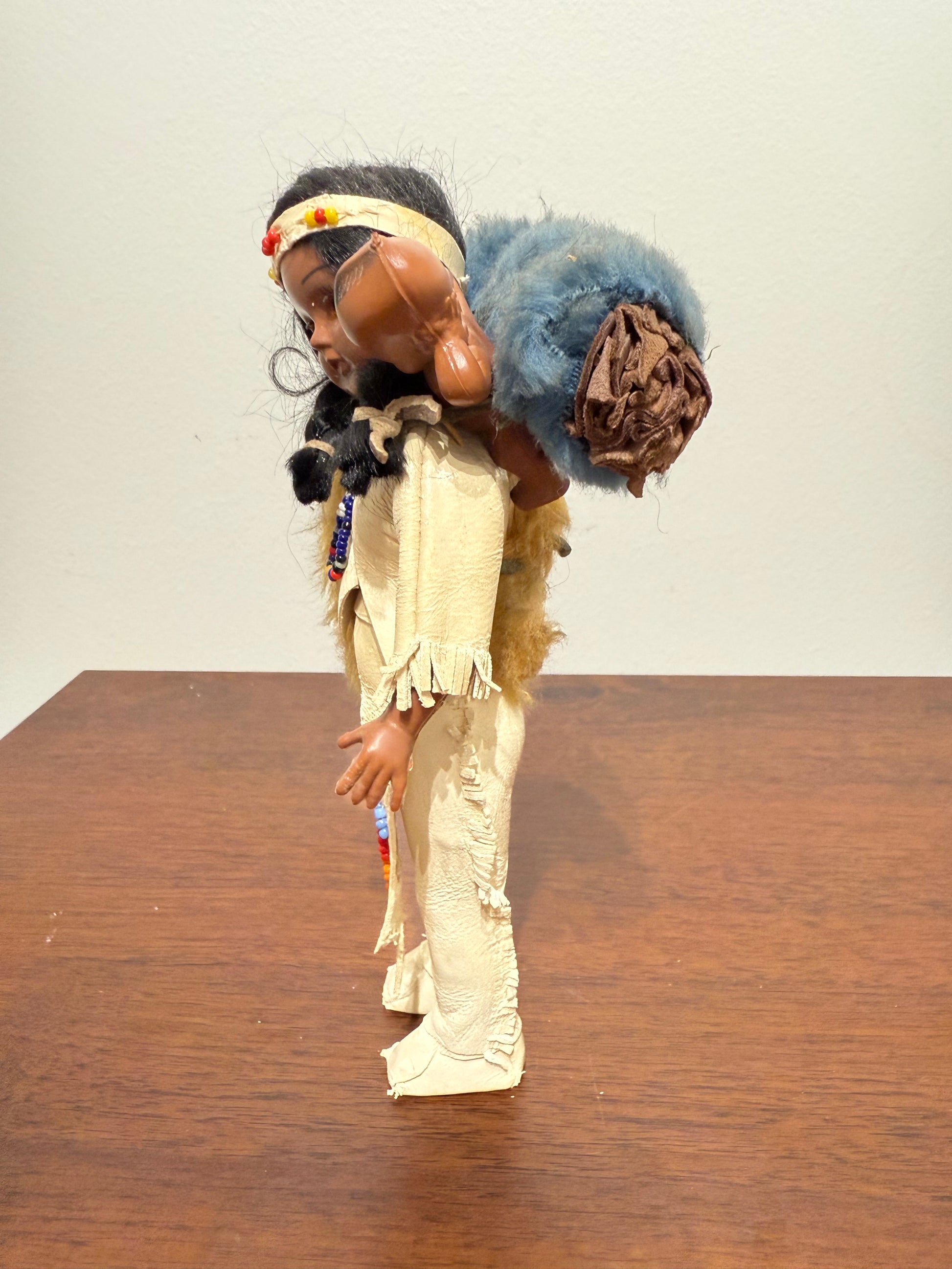 Ces belles poupées artisanales représentent un holé amérindienne en tenue traditionnelle, portant un bébé dans le dos, enveloppé dans une couverture bleue. Son costume à franges est complété par des perles, une fausse fourrure et des mocassins assortis. Chaque détail reflète un soin particulier apporté à la représentation de la culture autochtone nord-américaine.