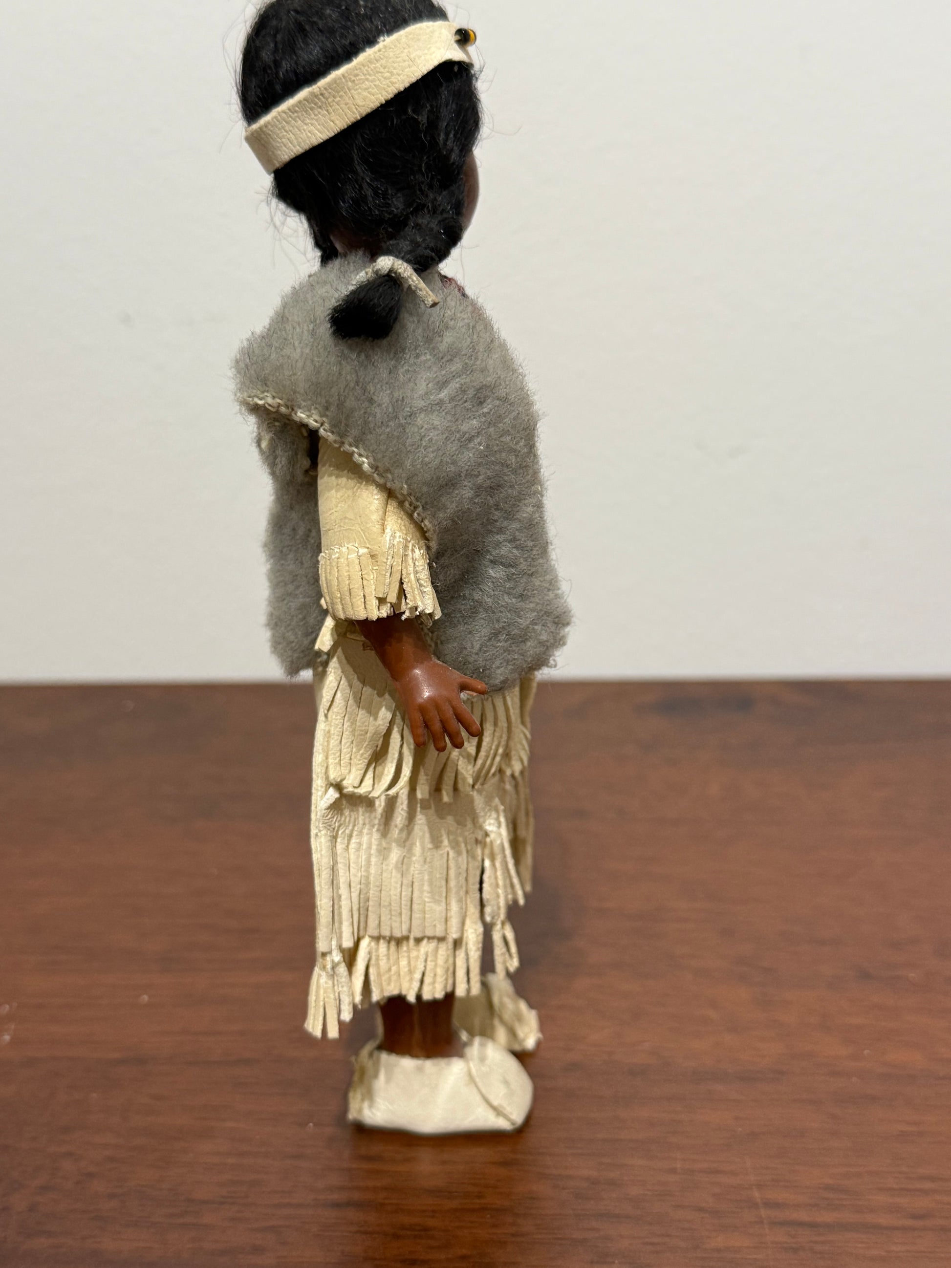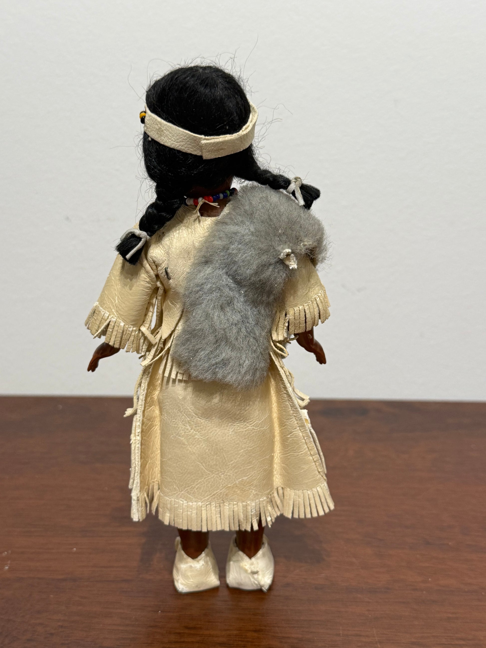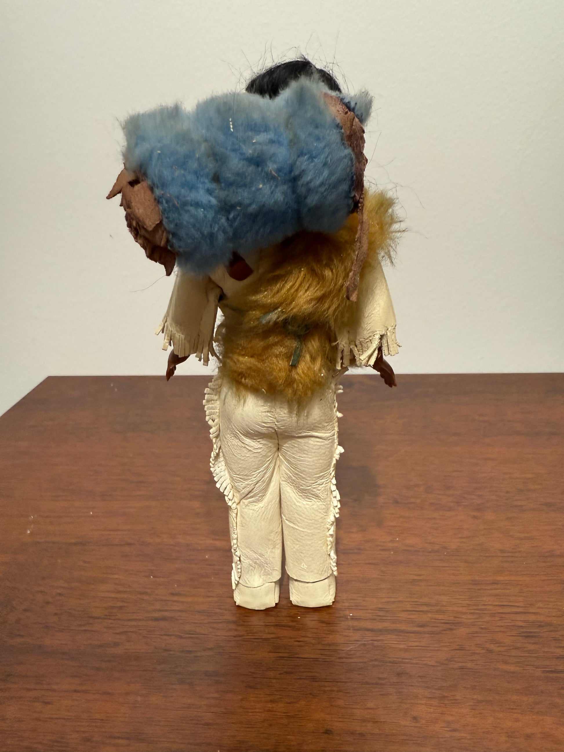 Ces belles poupées artisanales représentent un holé amérindienne en tenue traditionnelle, portant un bébé dans le dos, enveloppé dans une couverture bleue. Son costume à franges est complété par des perles, une fausse fourrure et des mocassins assortis. Chaque détail reflète un soin particulier apporté à la représentation de la culture autochtone nord-américaine.