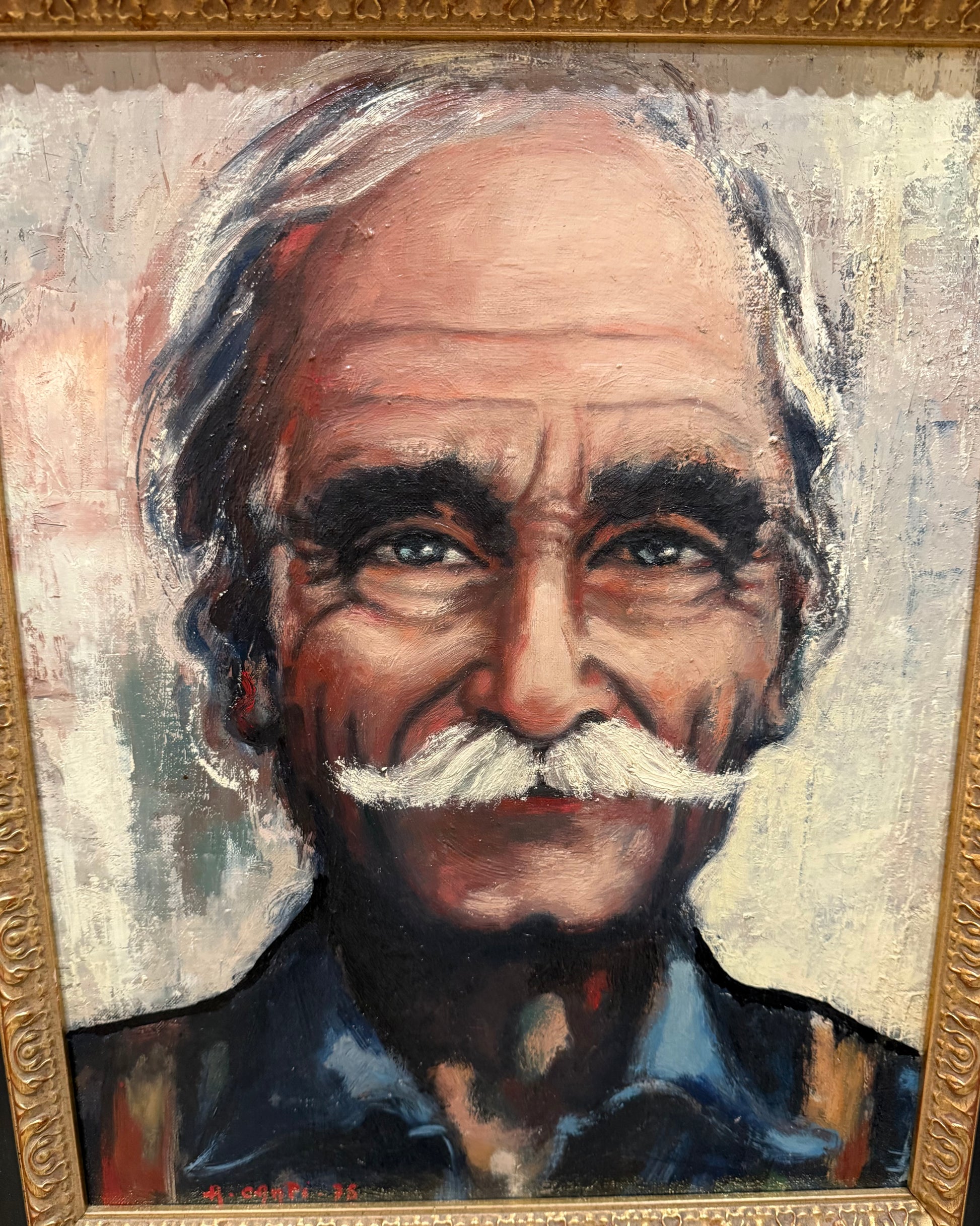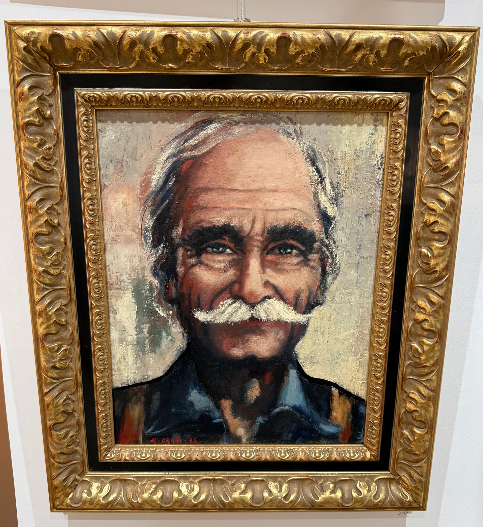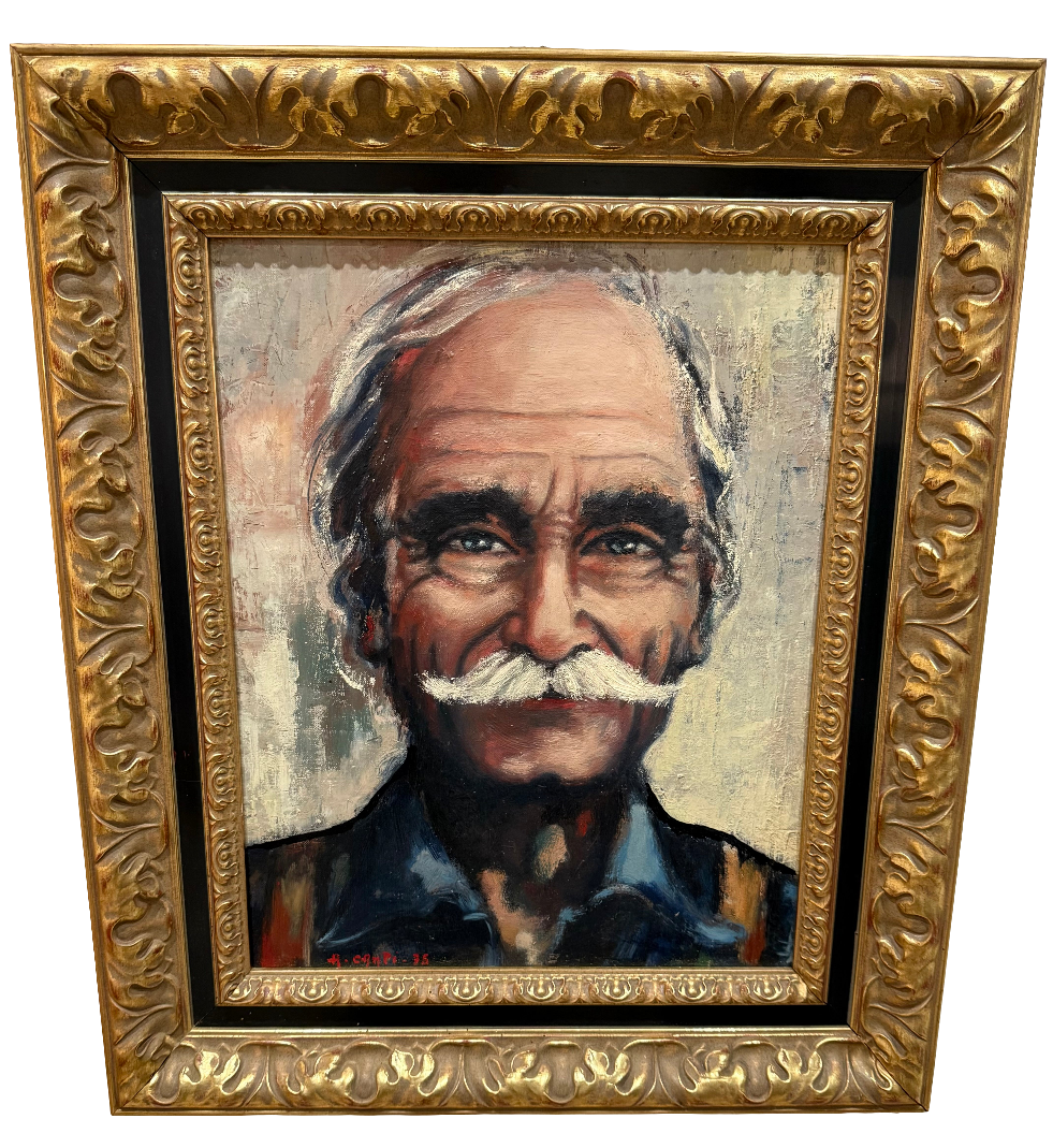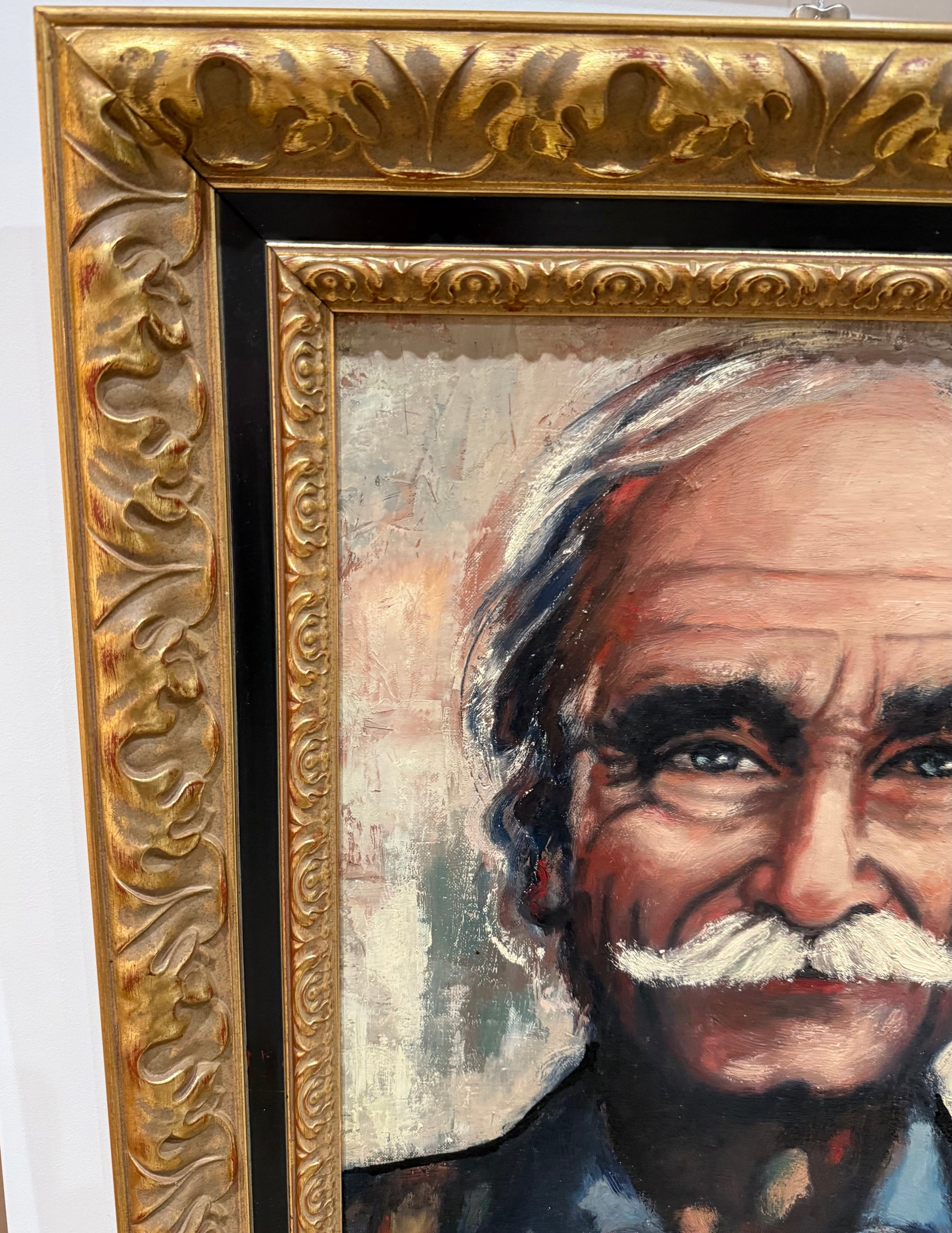 Ce portrait représente un homme âgé au visage expressif, au regard vif et à la grande moustache blanche. L’expression dégage de la sagesse, de la bonté et une forme de fierté. C’est un portrait réaliste, avec un style légèrement brossé dans les fonds, mais très détaillé dans le visage. Il y a une vraie présence, presque photographique, mais avec la chaleur de la matière picturale.