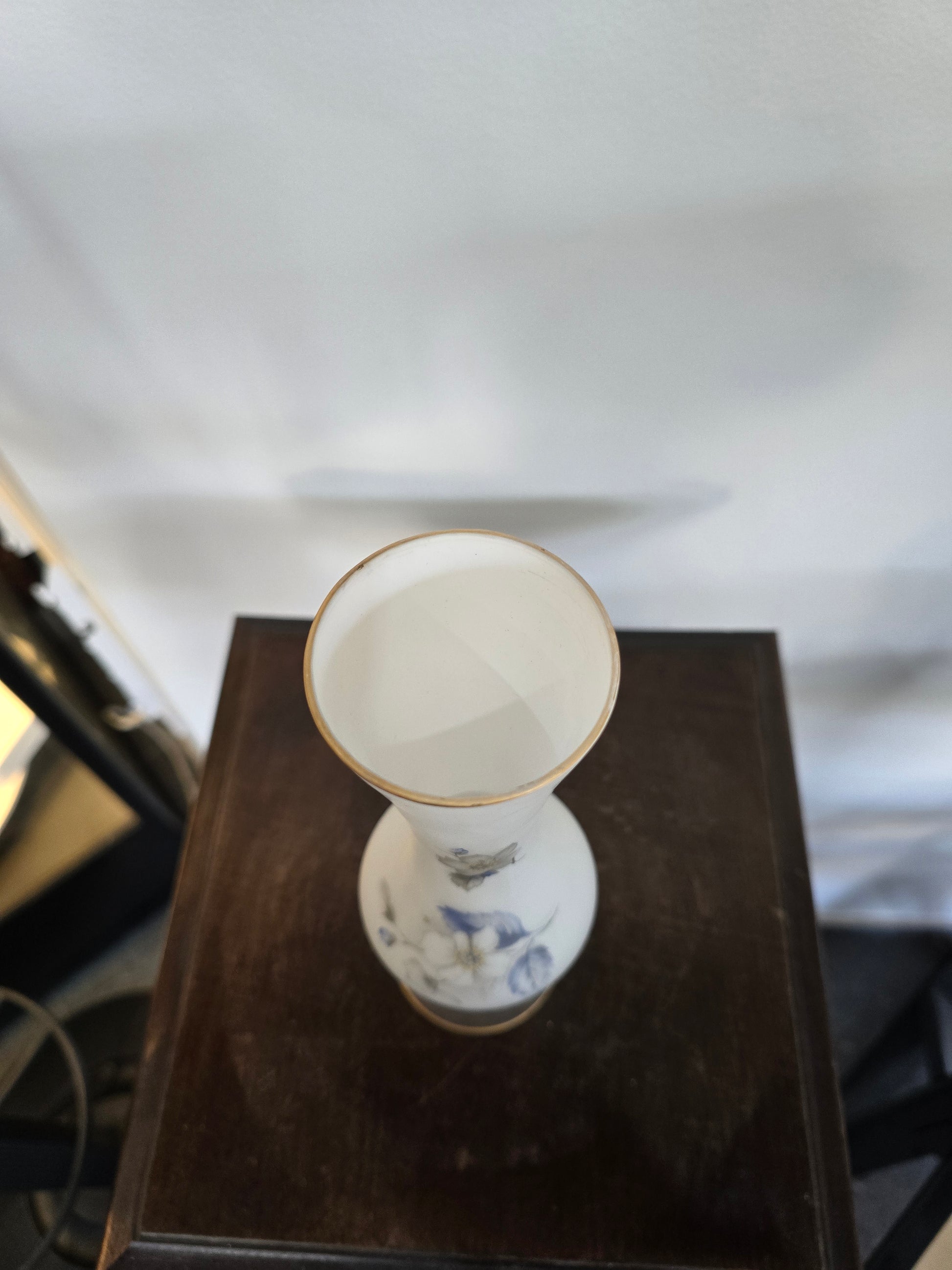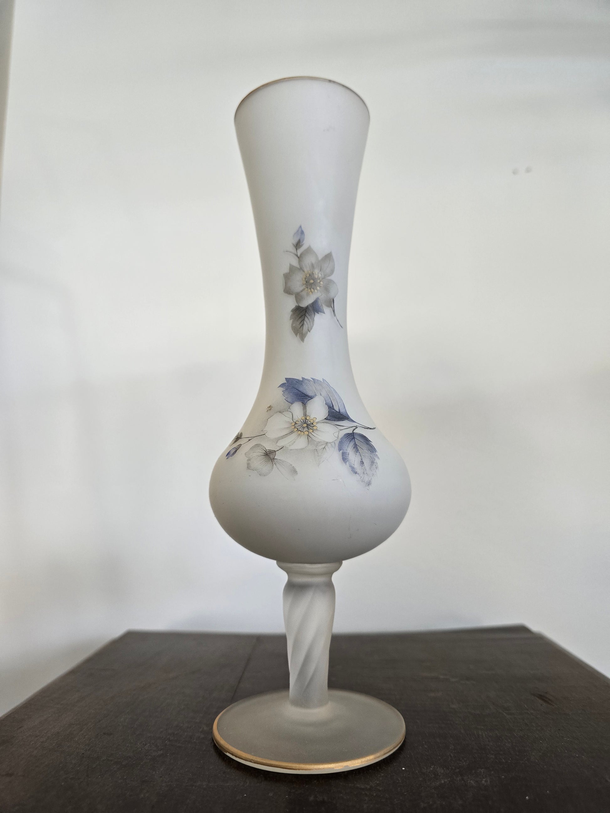 Élégant soliflore ancien en verre dépoli, à la silhouette élancée et raffinée. Il est orné d’un délicat décor floral peint dans des tons bleu et gris, offrant une esthétique douce et intemporelle.