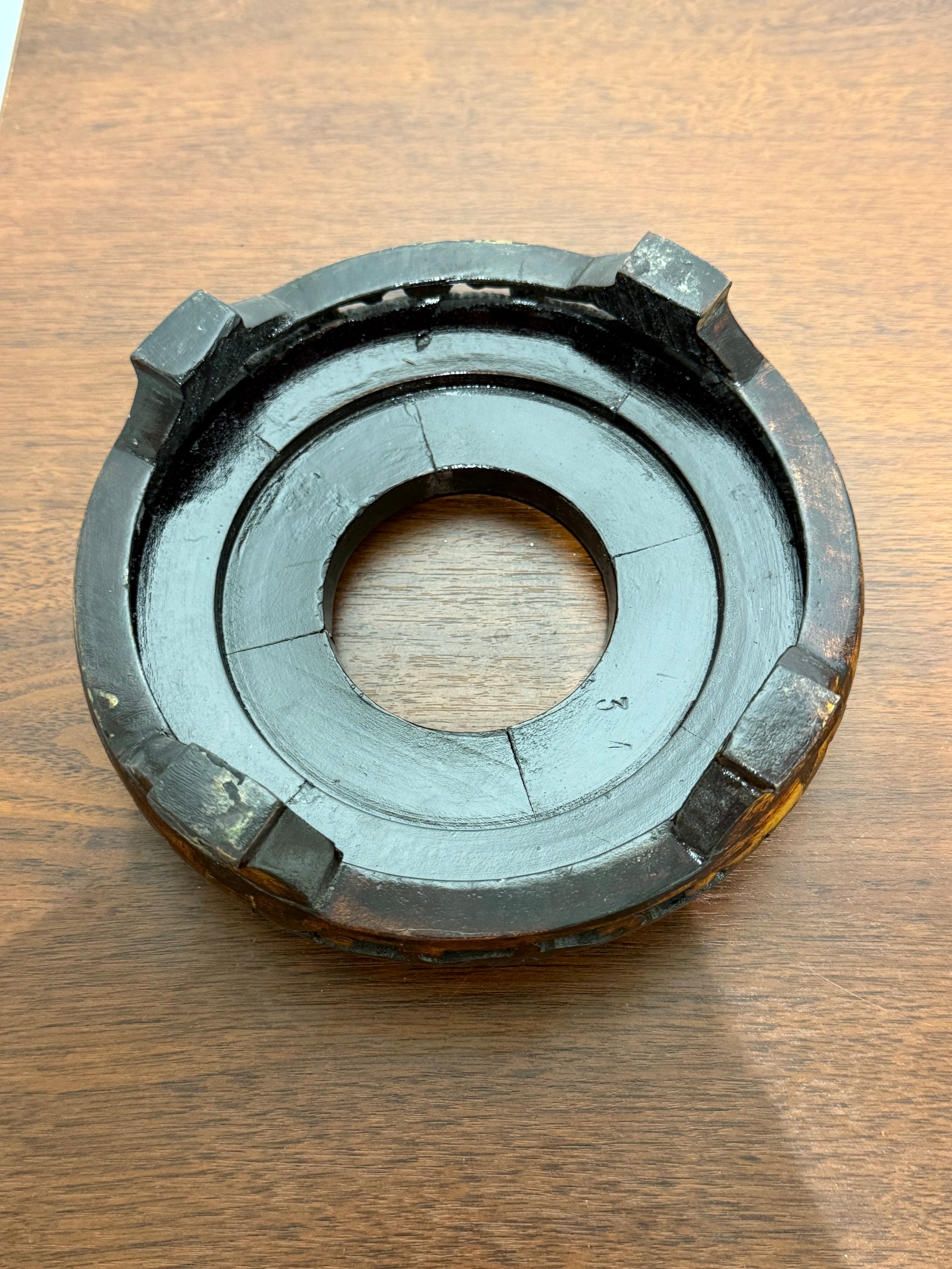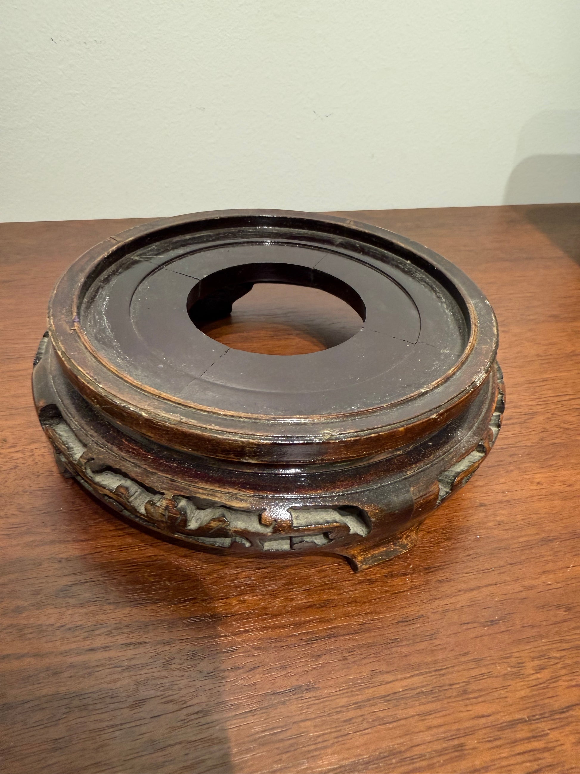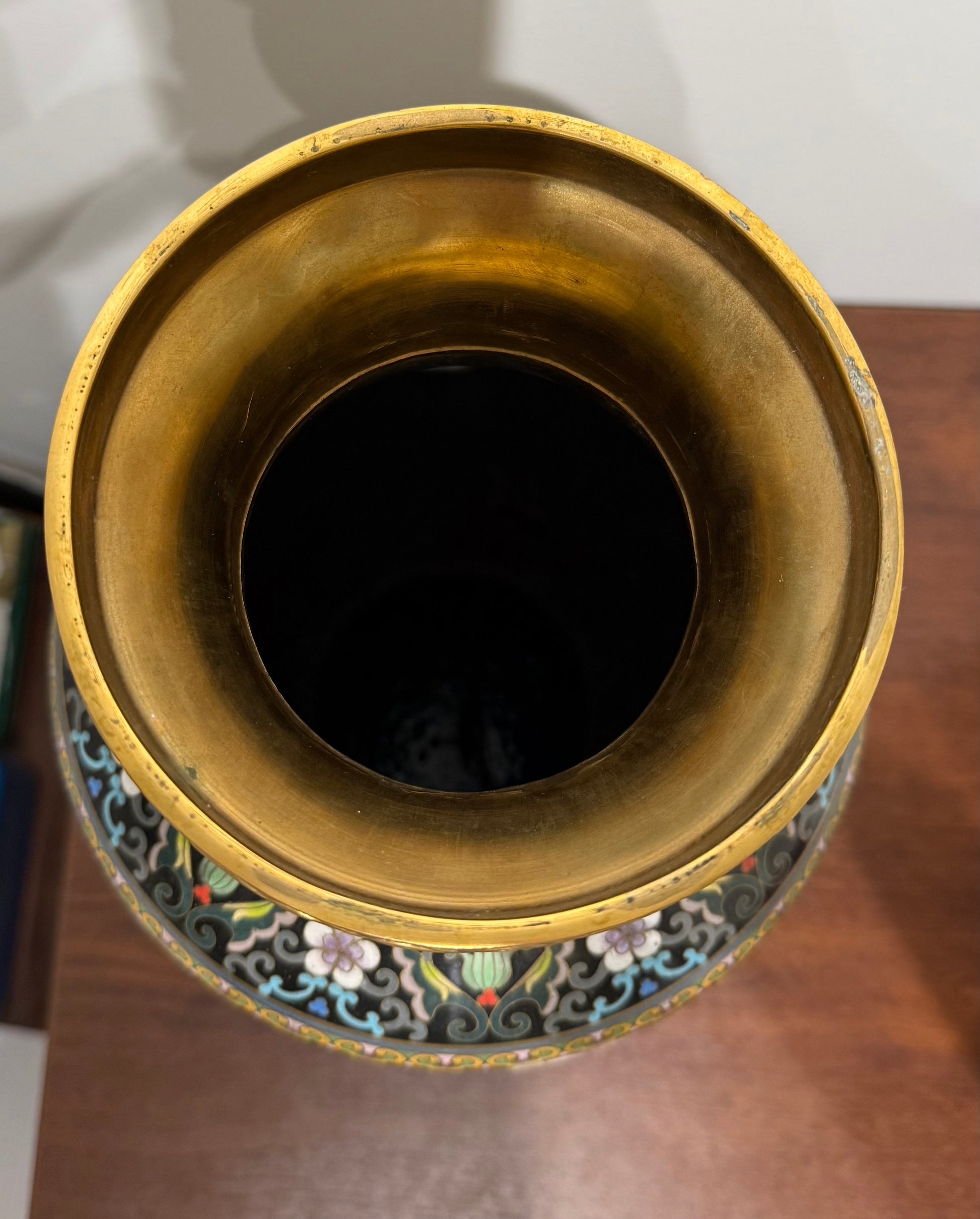 Vase en émail cloisonné sur cuivre, décoré d’un motif floral détaillé avec pivoines, magnolias et oiseaux sur fond noir. Bordure et base ornées de frises dorées finement travaillées. Présenté sur un socle en bois sculpté, ajoutant à son élégance et à son authenticité. Intérieur émaillé bleu, typique des pièces d’époque.