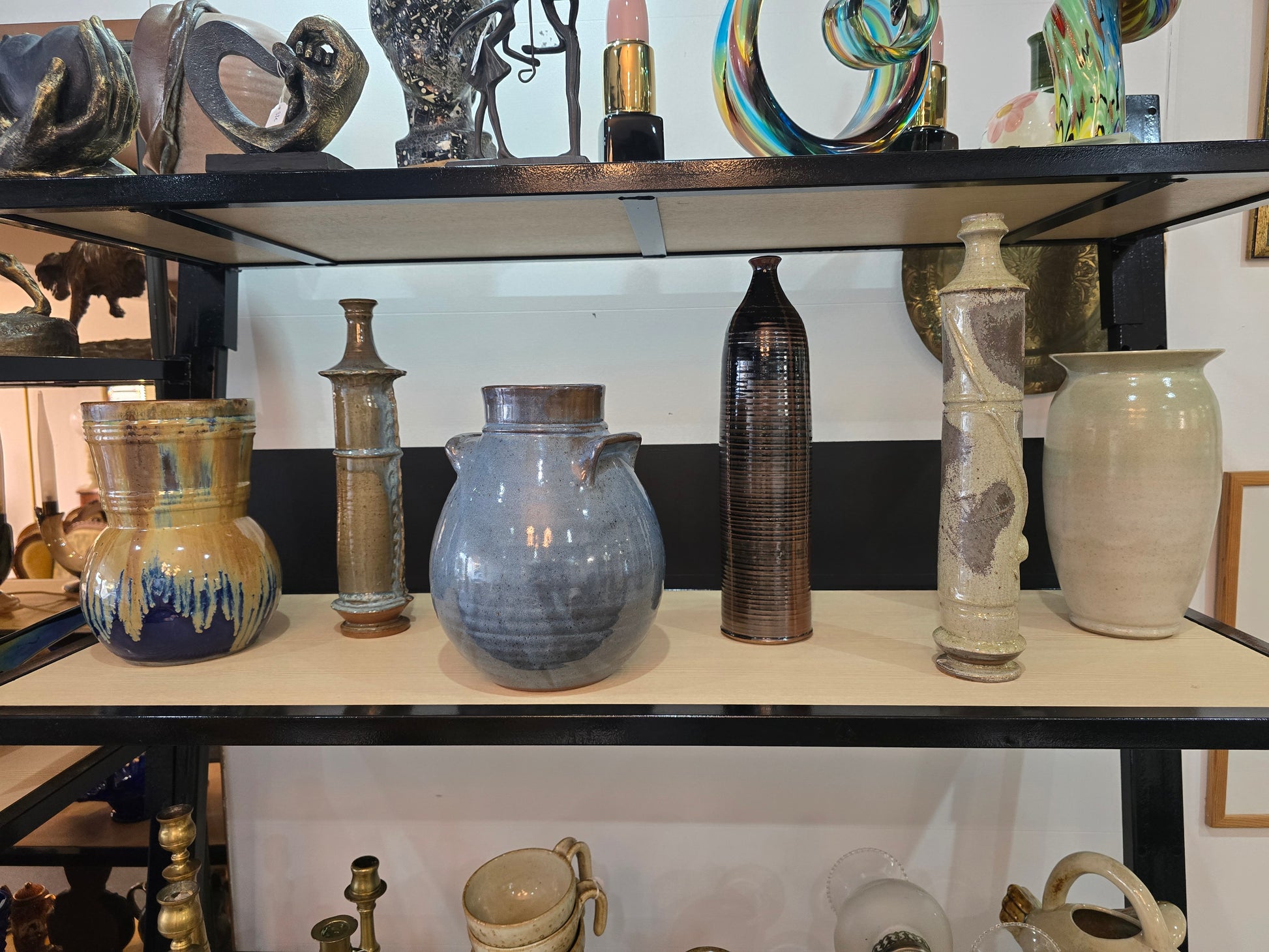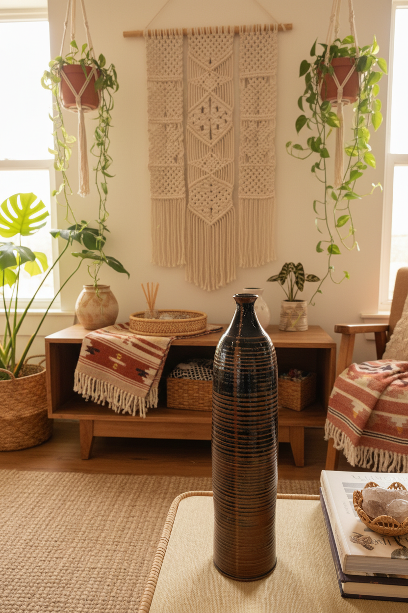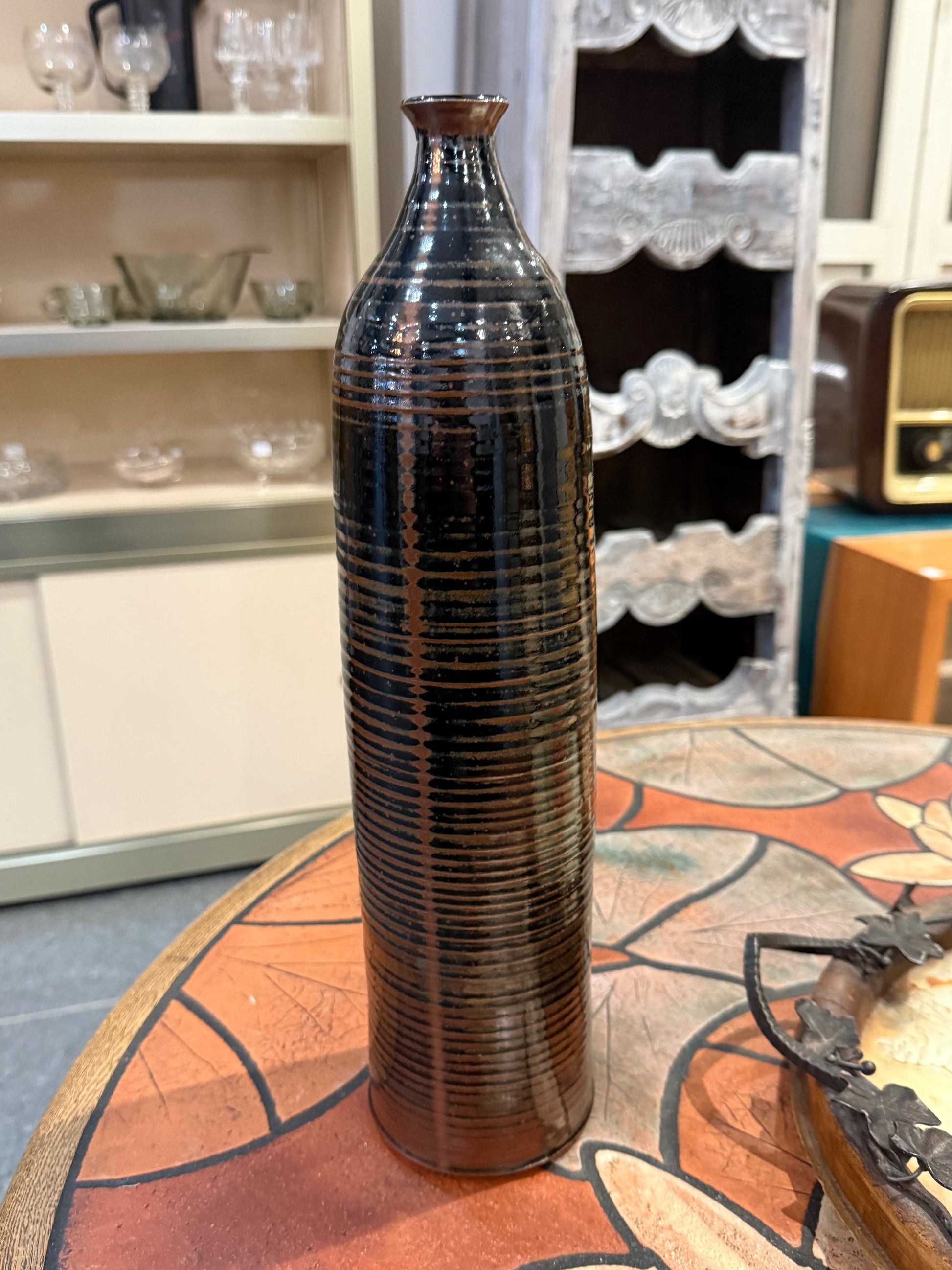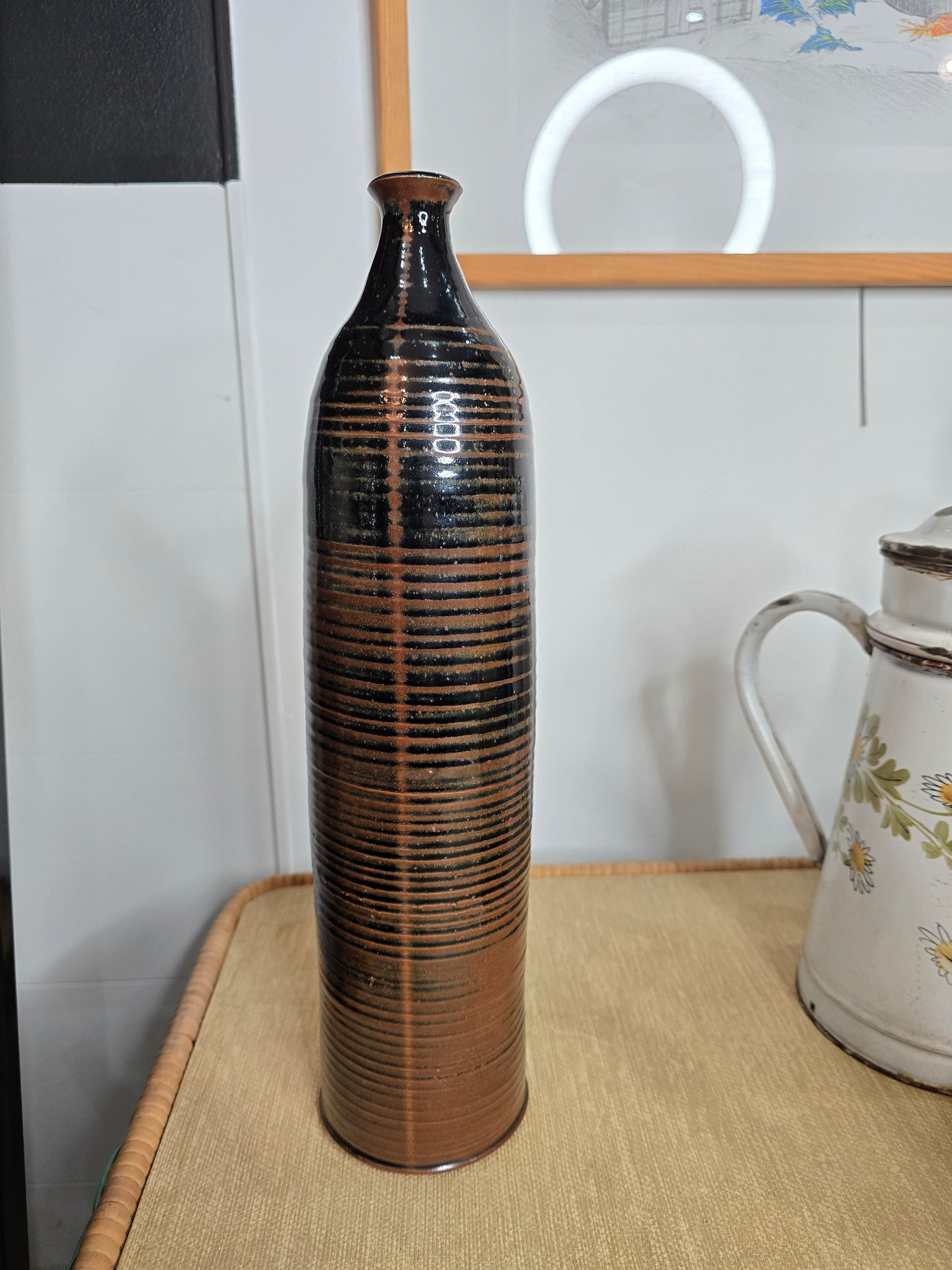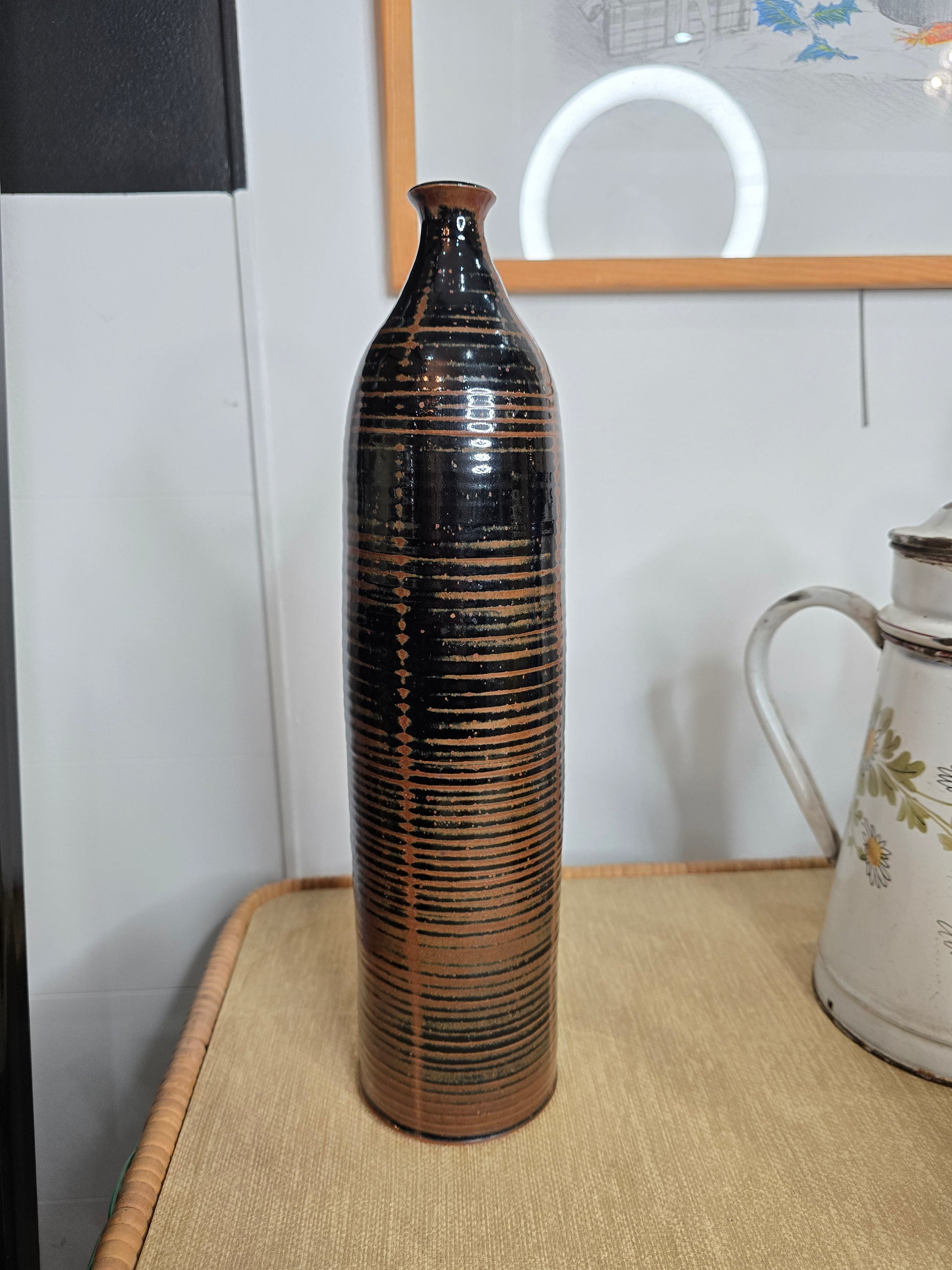 La silhouette fine et la texture marquée en font une pièce à la présence graphique forte, idéale en objet décoratif seul, sur une console, une table ou dans une bibliothèque. Un bel exemple de céramique artisanale des années 70, à l’esthétique brute et intemporelle.