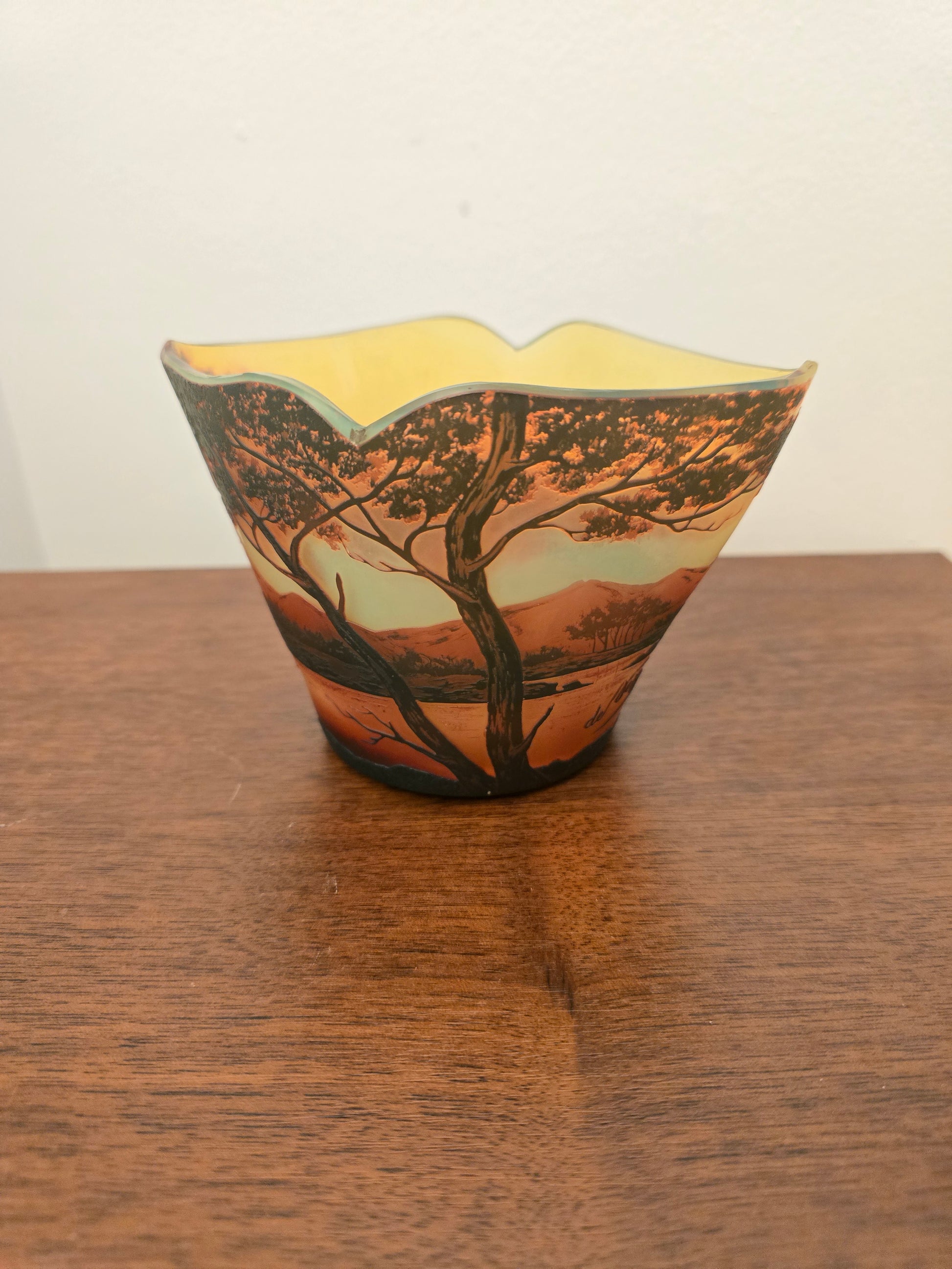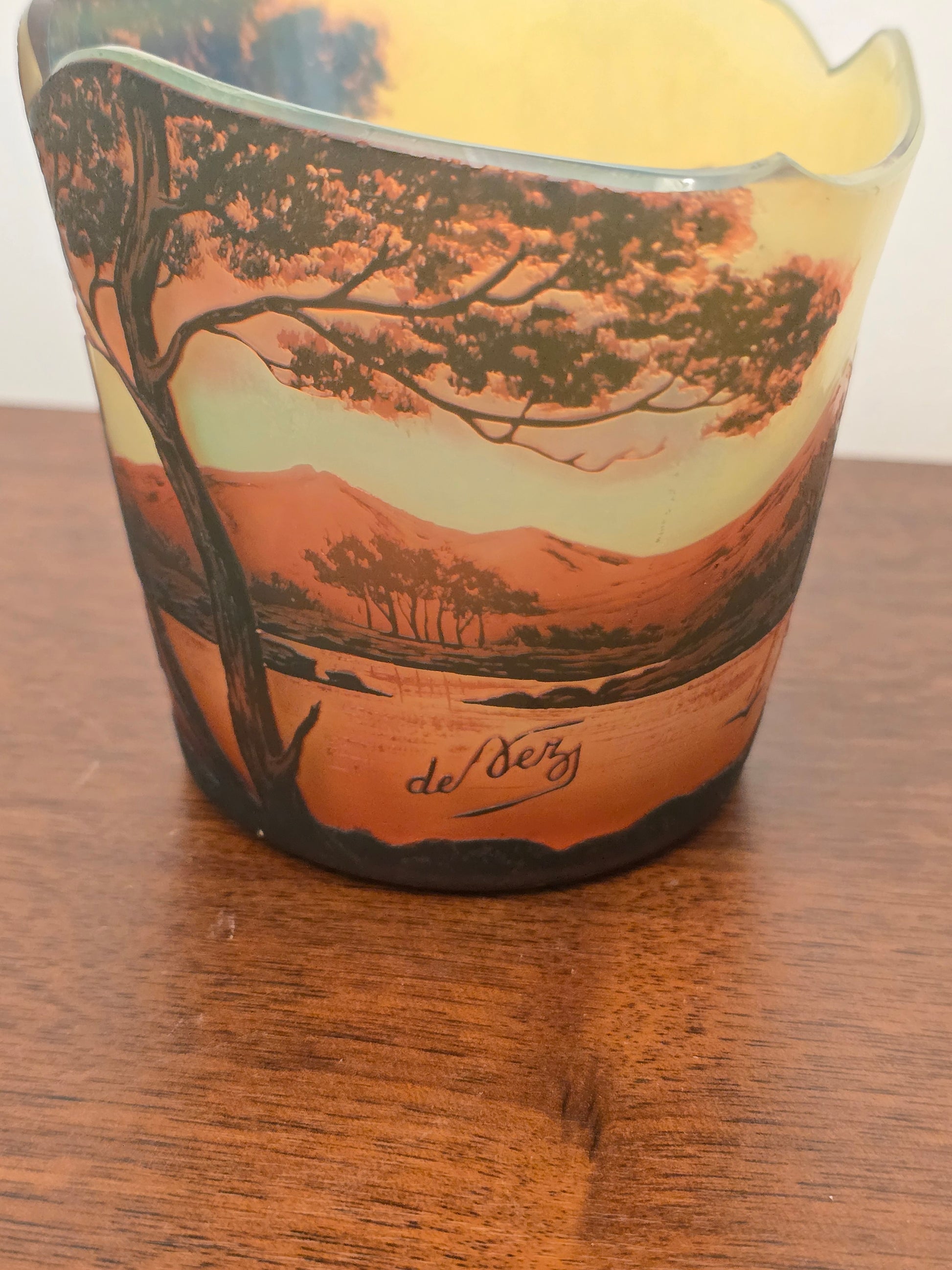 Ce petit vase en pâte de verre est orné d'un magnifique décor lacustre aux nuances de coucher de soleil. Fabriqué par l’experts 'DEVEZ, il apportera une touche d'élégance et de sophistication à votre intérieur. Avec sa signature authentique, c'est une pièce unique.