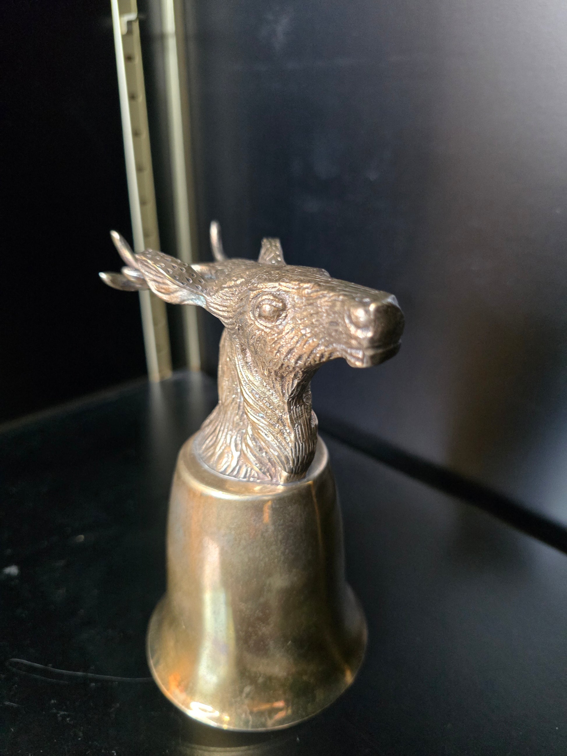 Superbe petit verre à liqueur ou gobelet à liqueur en laiton, reposant sur une base sculptée en forme de tête de cerf aux bois ramifiés. Ce type de verre, souvent appelé chasse gobelet ou stirrup cup, était traditionnellement utilisé lors des chasses ou pour les toasts de fin de battue.