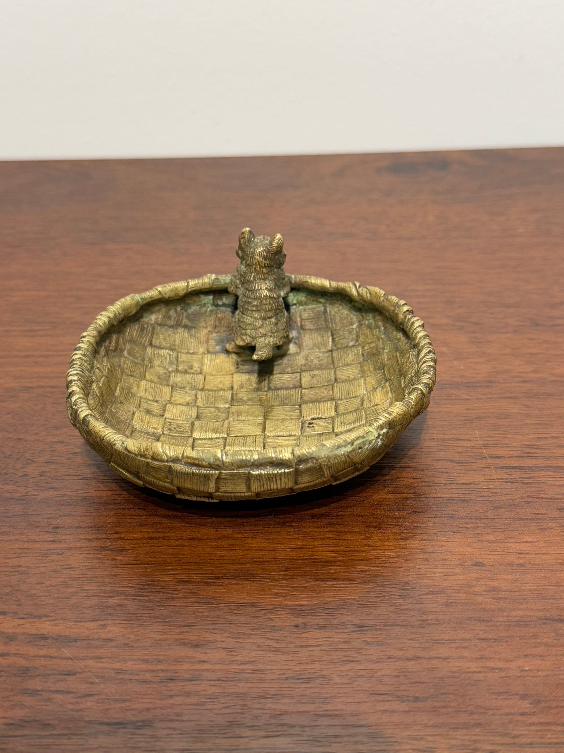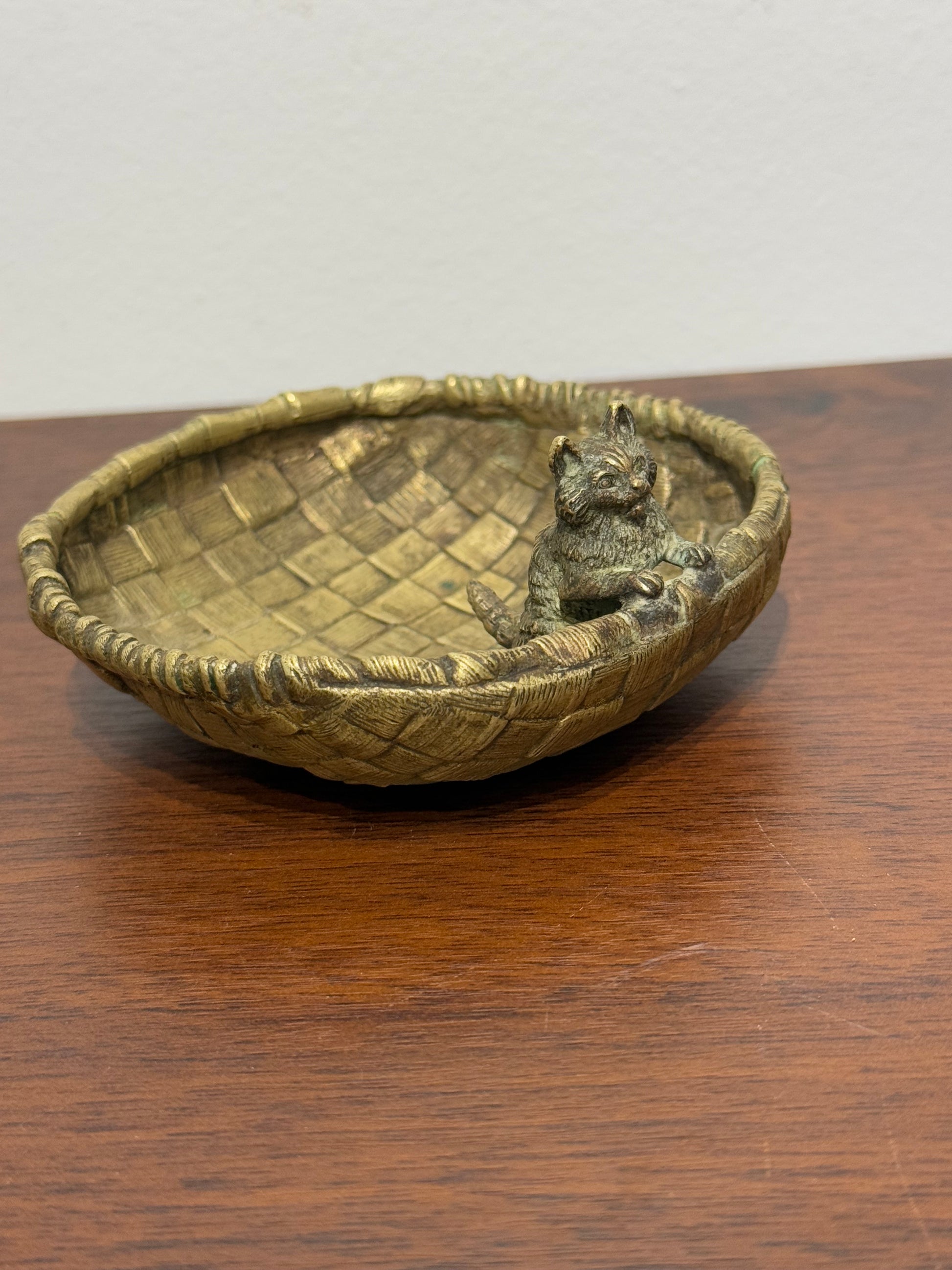 Vide-poche en Bronze de vienne tressé avec figurine de chat vintage