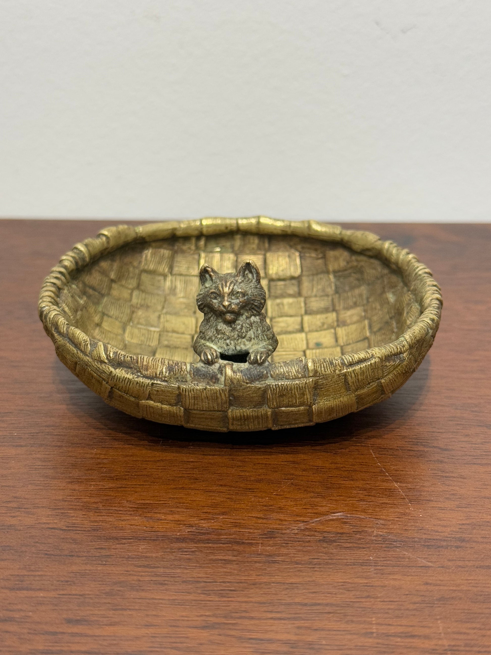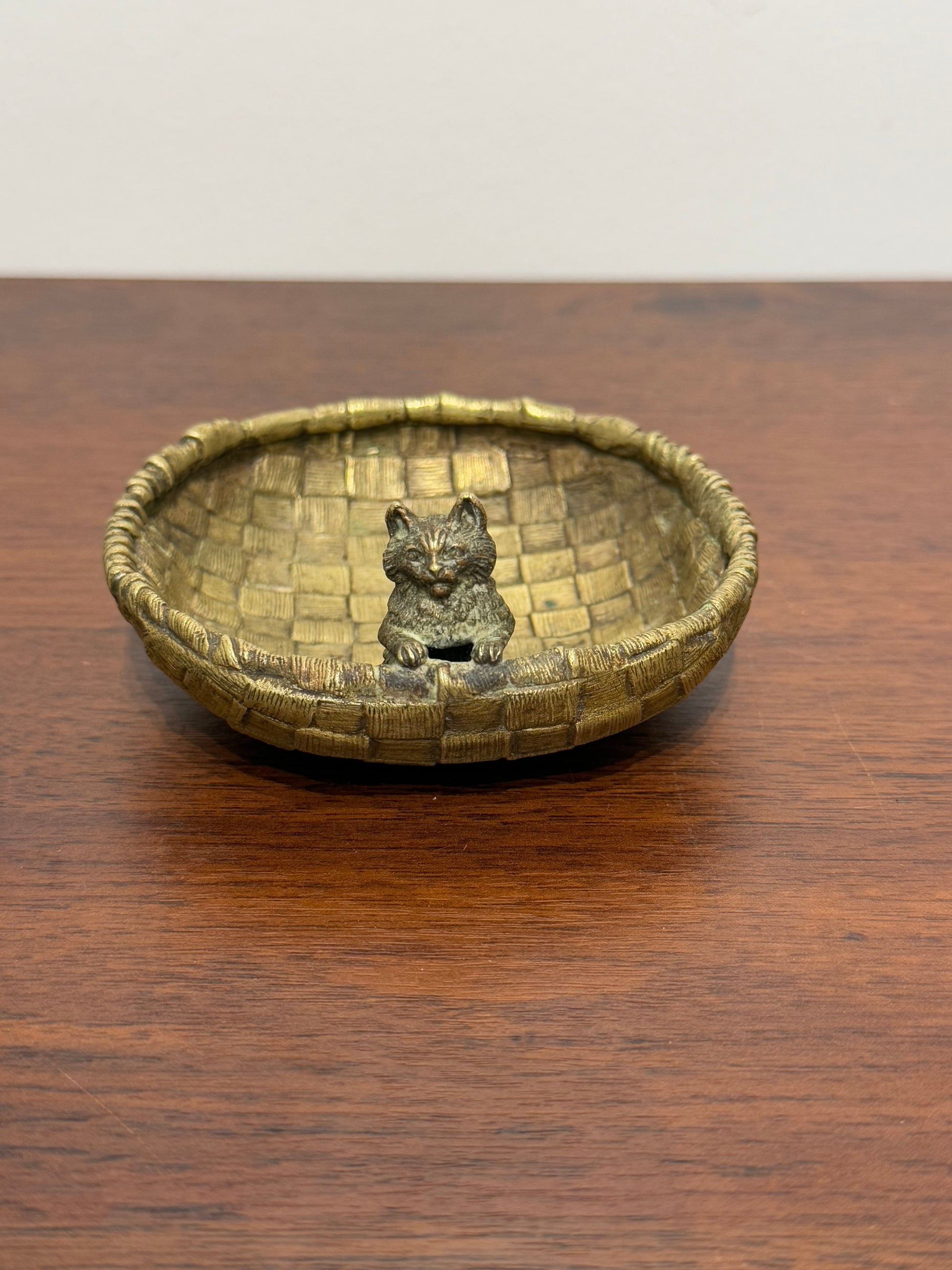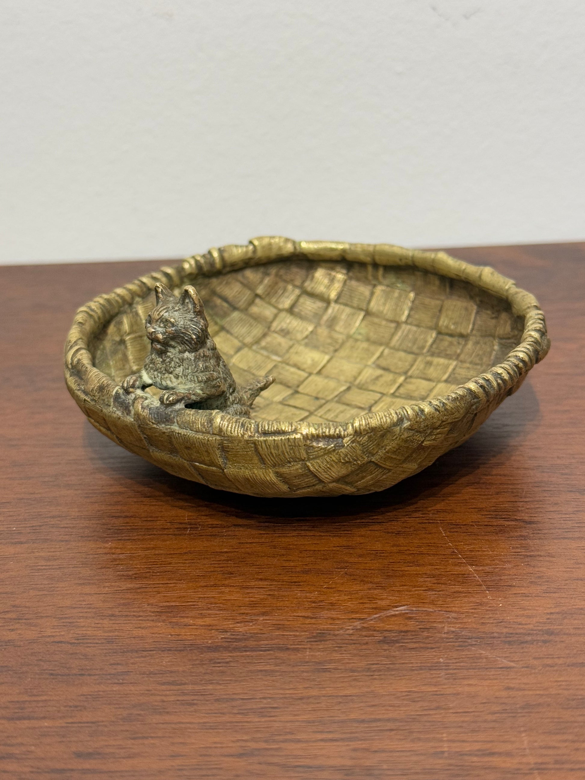 • Vide-poche en bronze de vienne au design tressé, avec une petite figurine de chat en relief sur le bord intérieur.