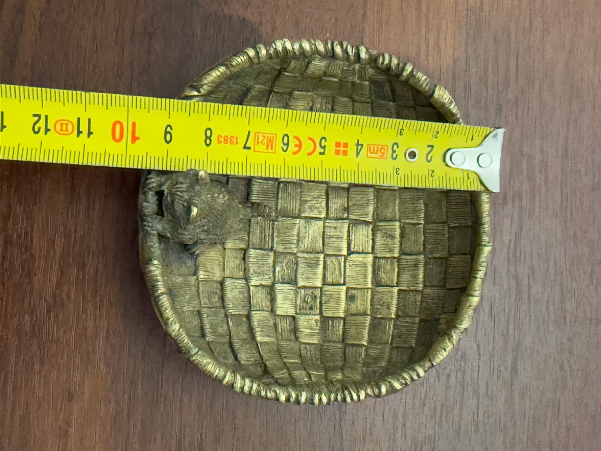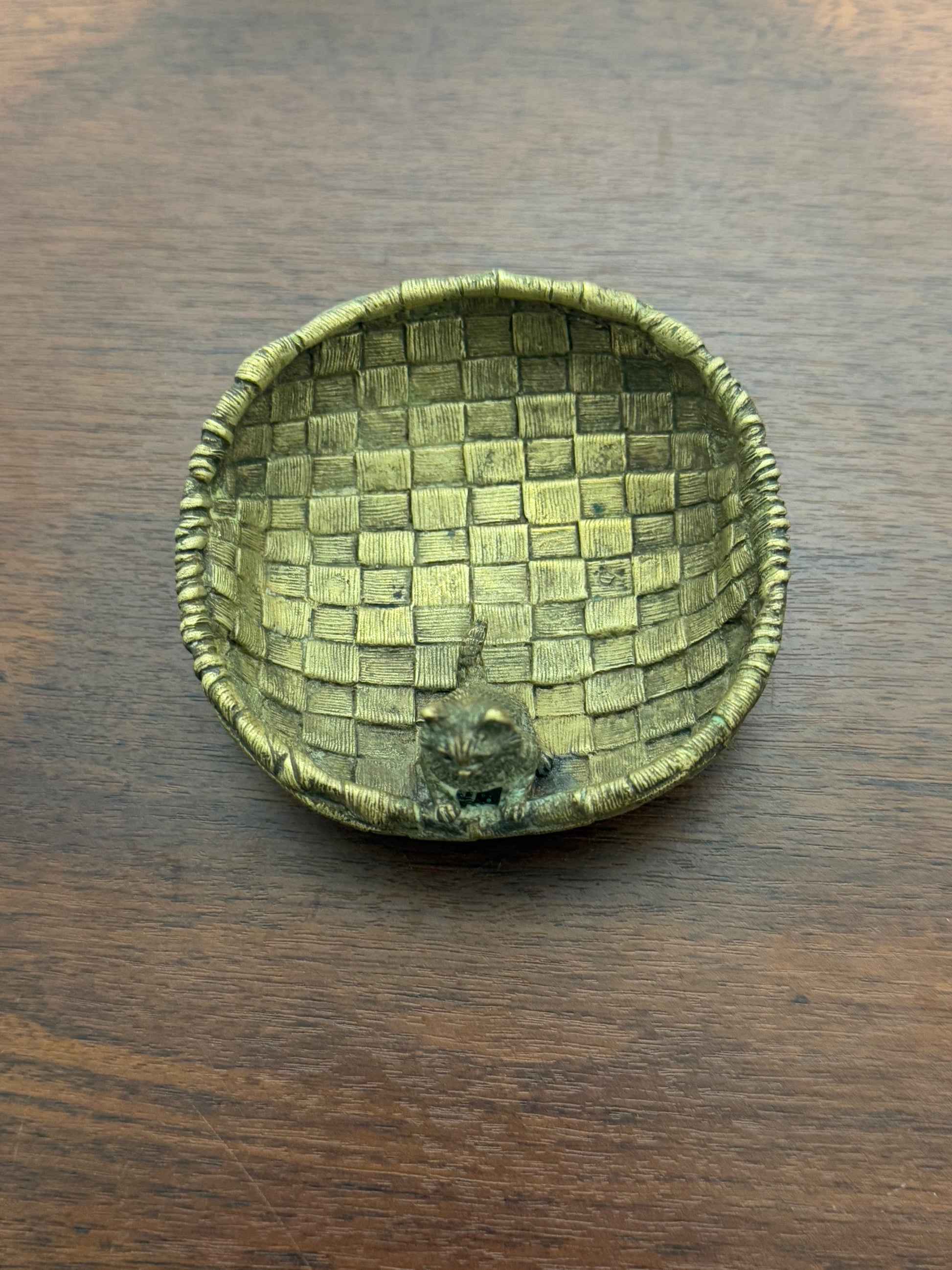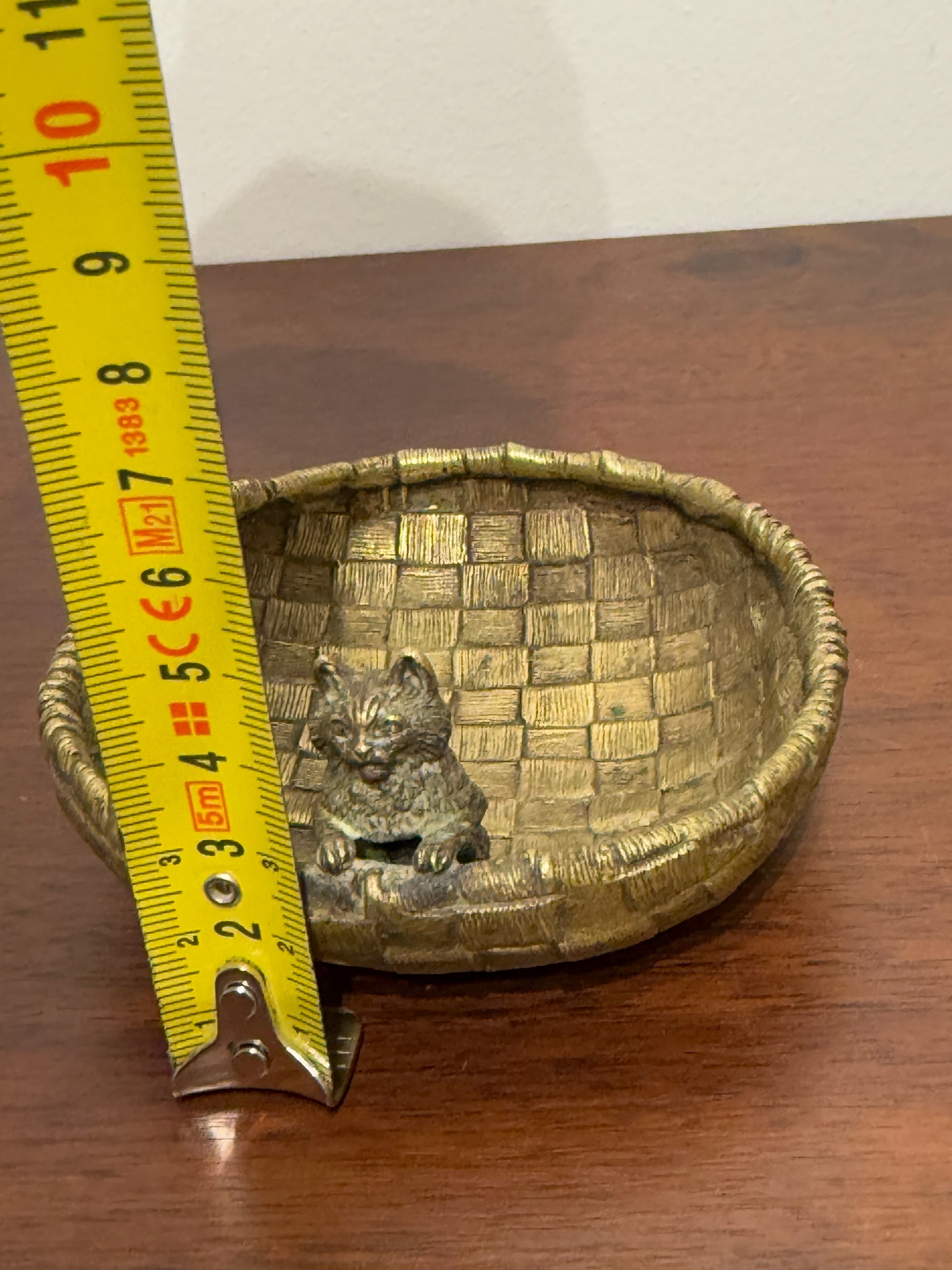 • Vide-poche en bronze de vienne au design tressé, avec une petite figurine de chat en relief sur le bord intérieur.