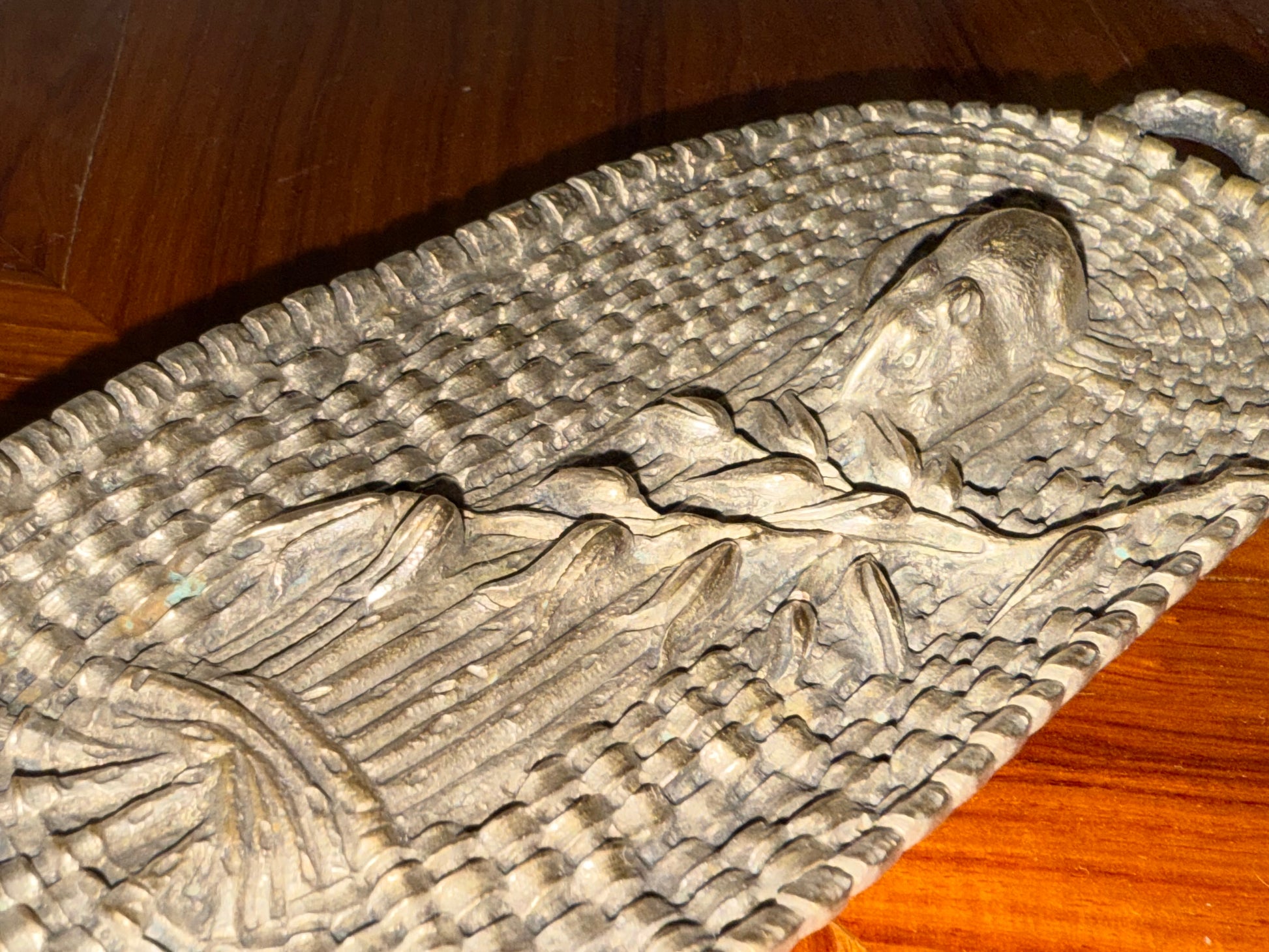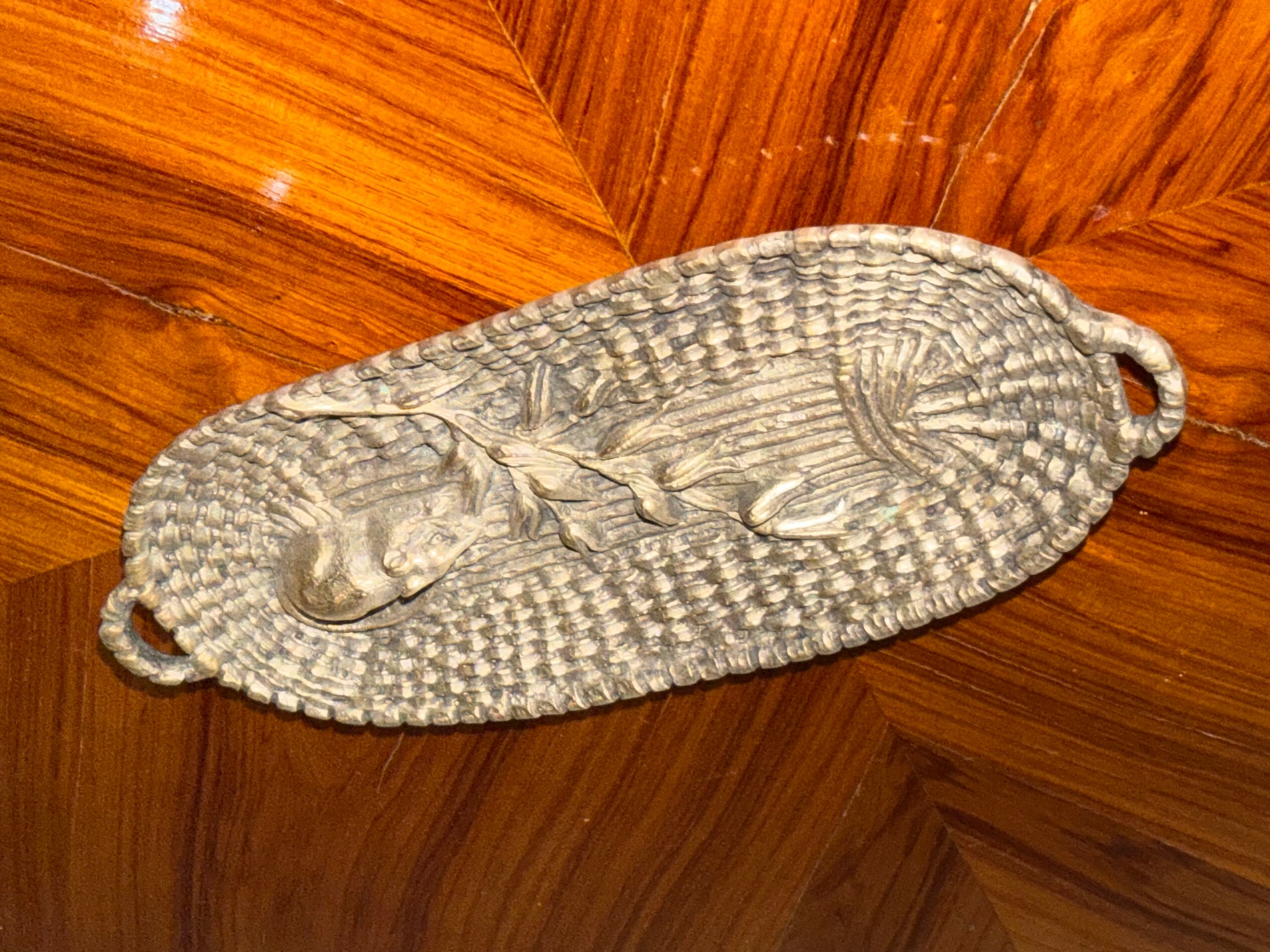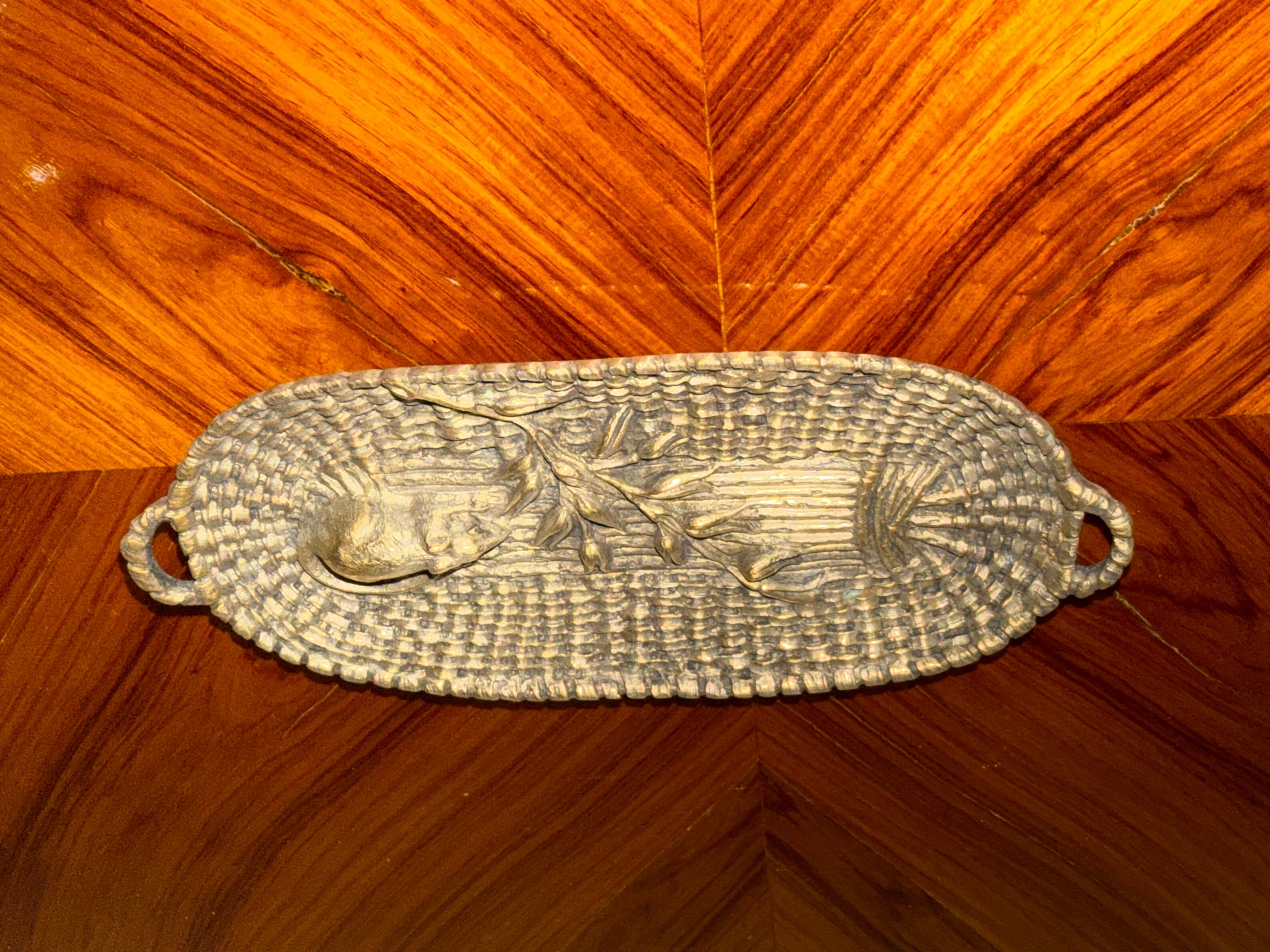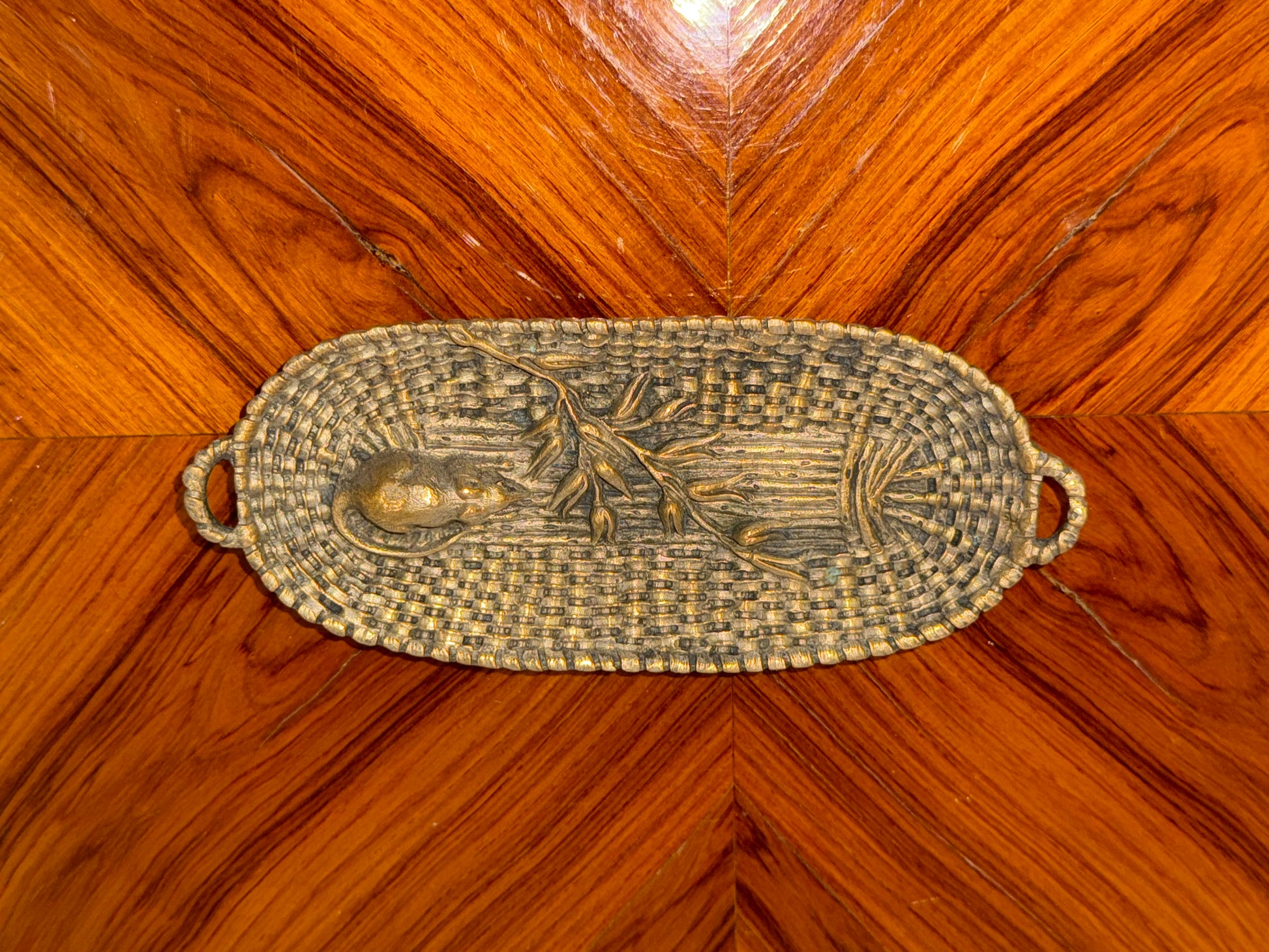 Charmant vide-poche en bronze argenté représentant un panier tressé en relief, sur lequel sont délicatement posés un épi de blé et une souris finement sculptée. L’ensemble évoque une scène champêtre naturaliste pleine de poésie, entre art populaire et objet décoratif raffiné.