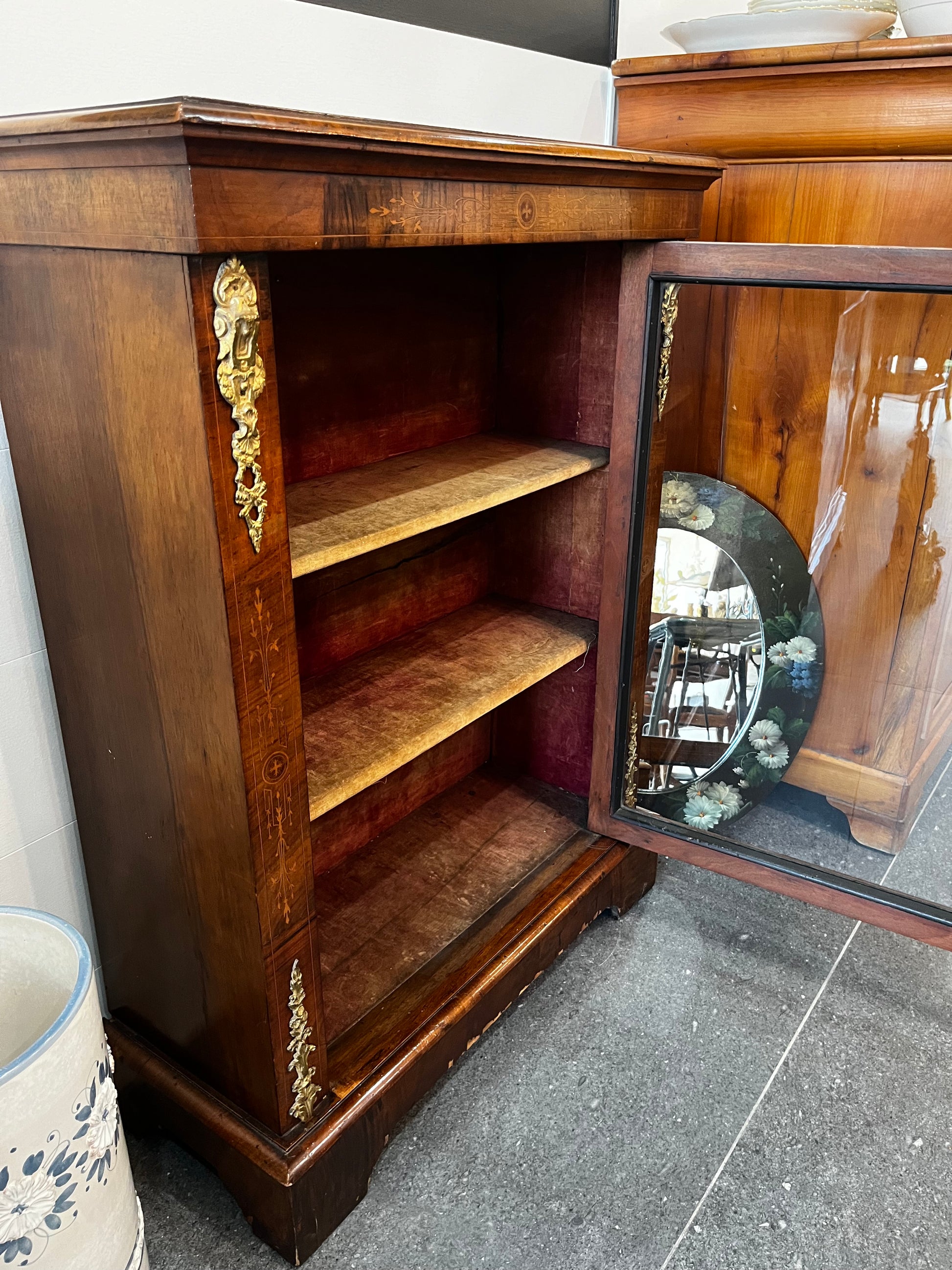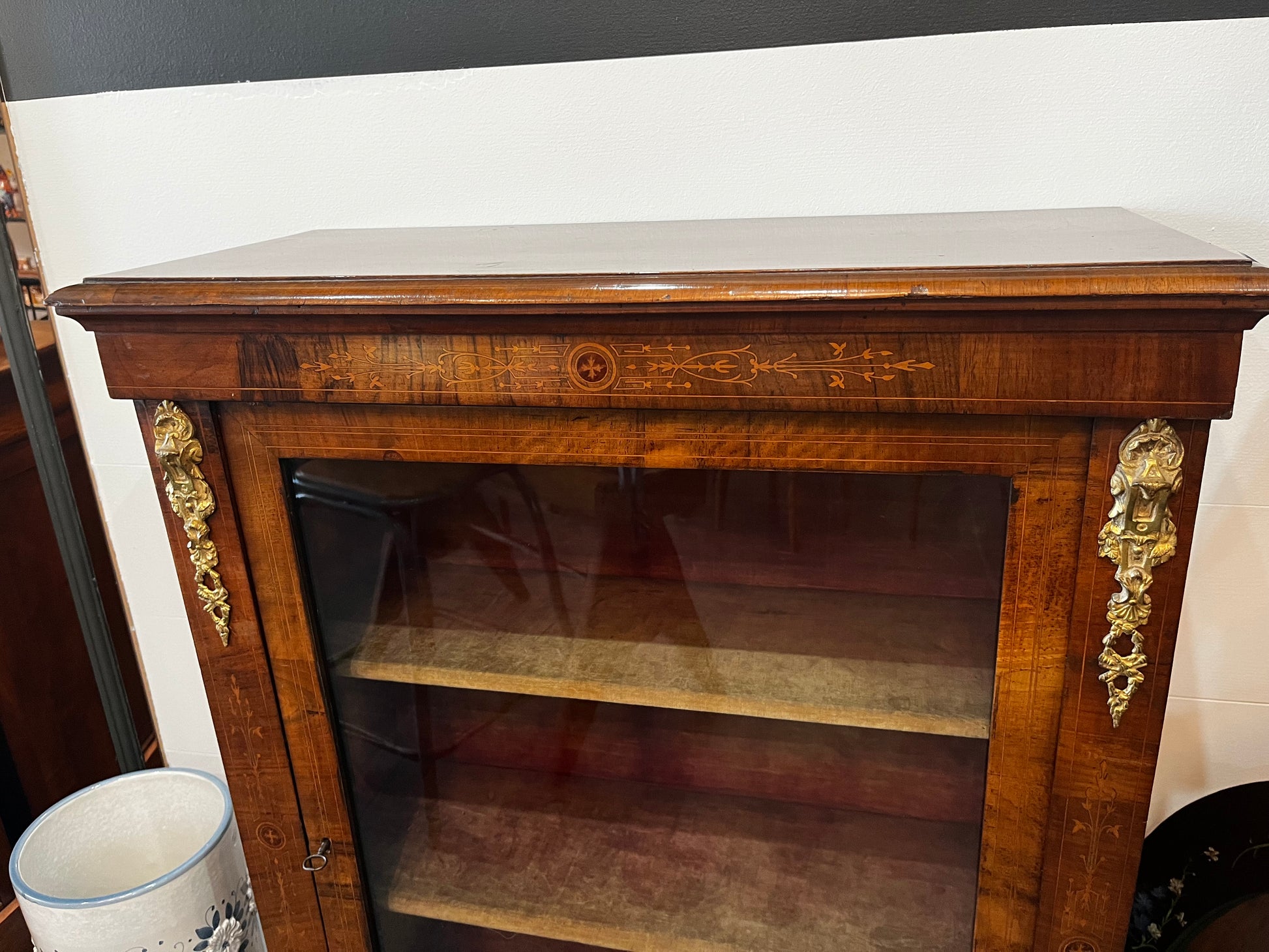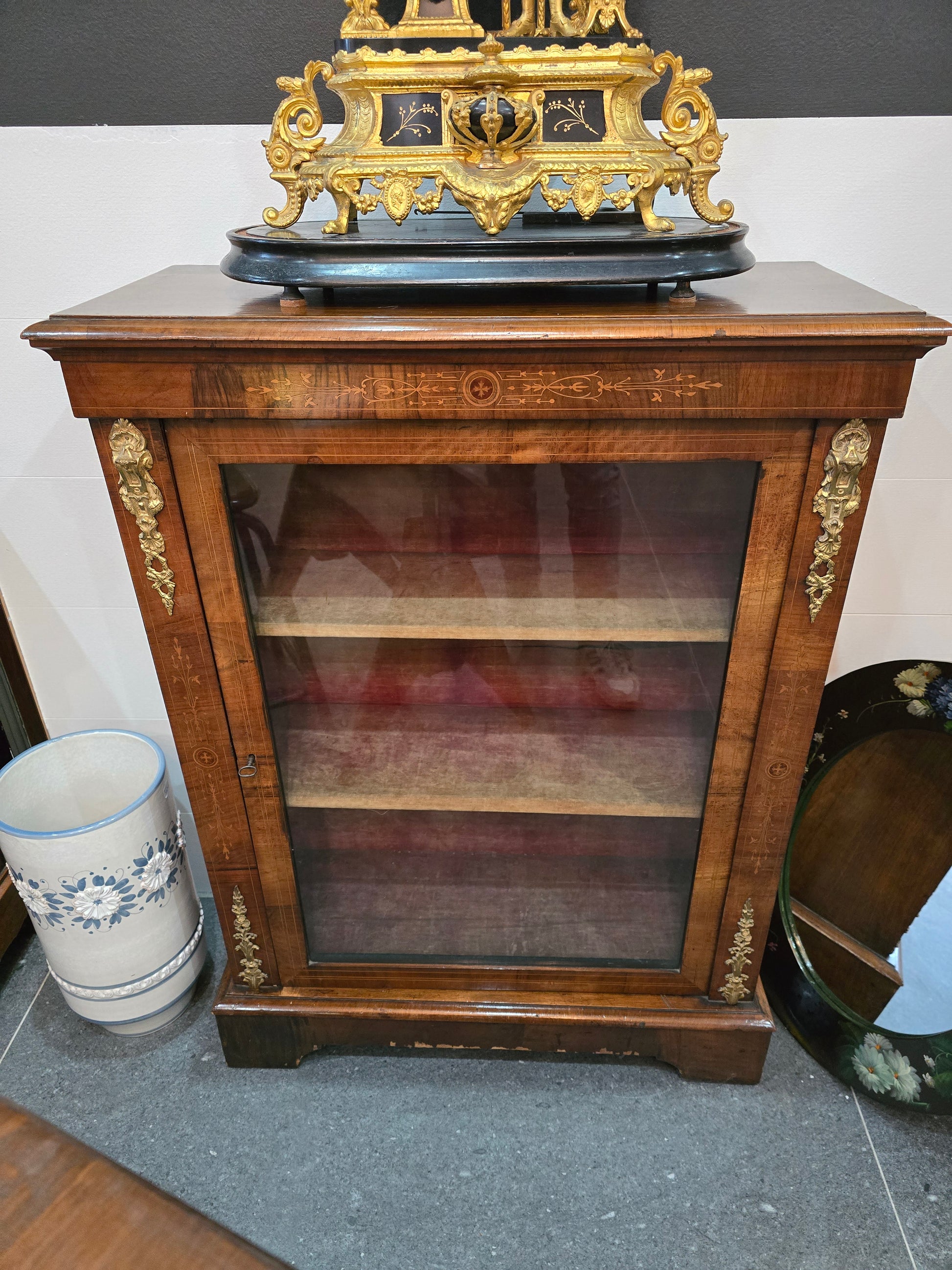 vitrine Charle X en marqueterie ornée de bronze, Interieur tapisser couleur groseille possédant deux étagères