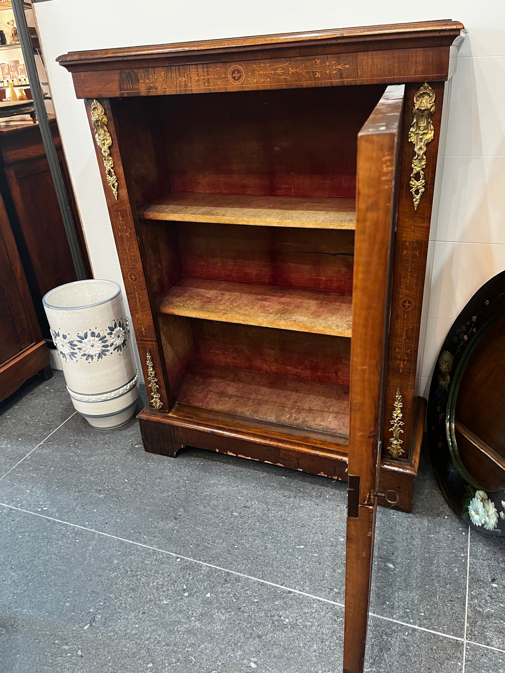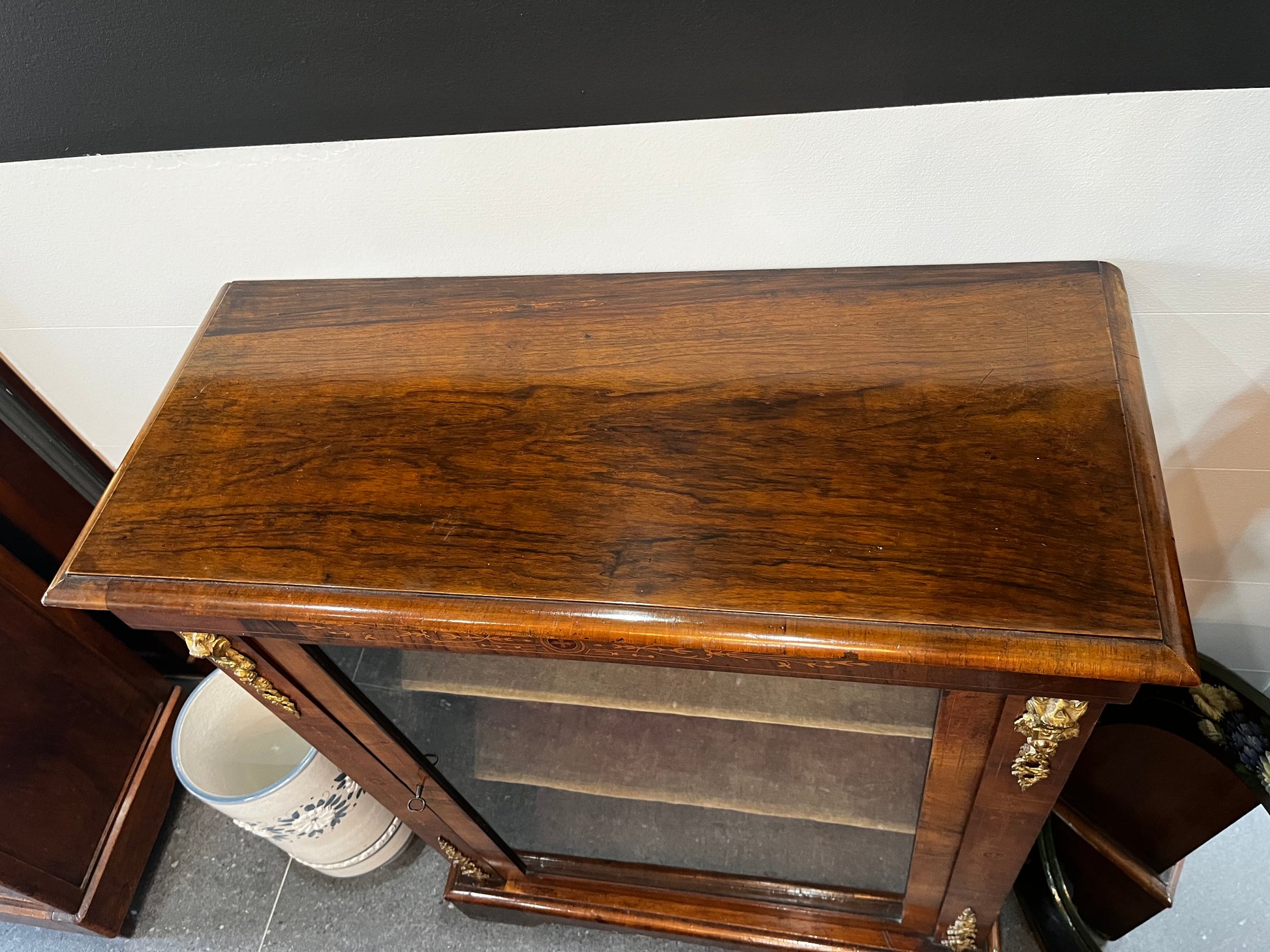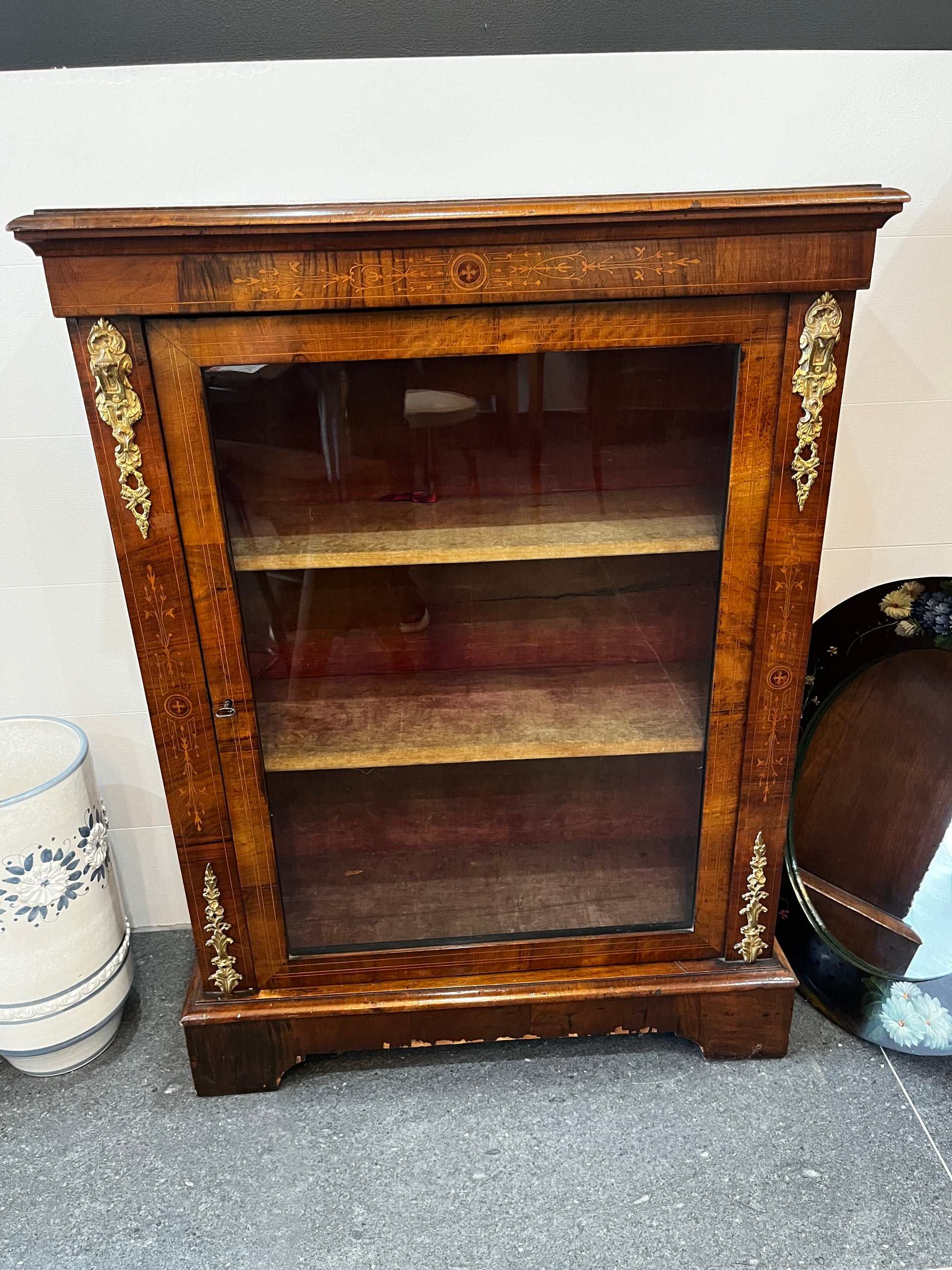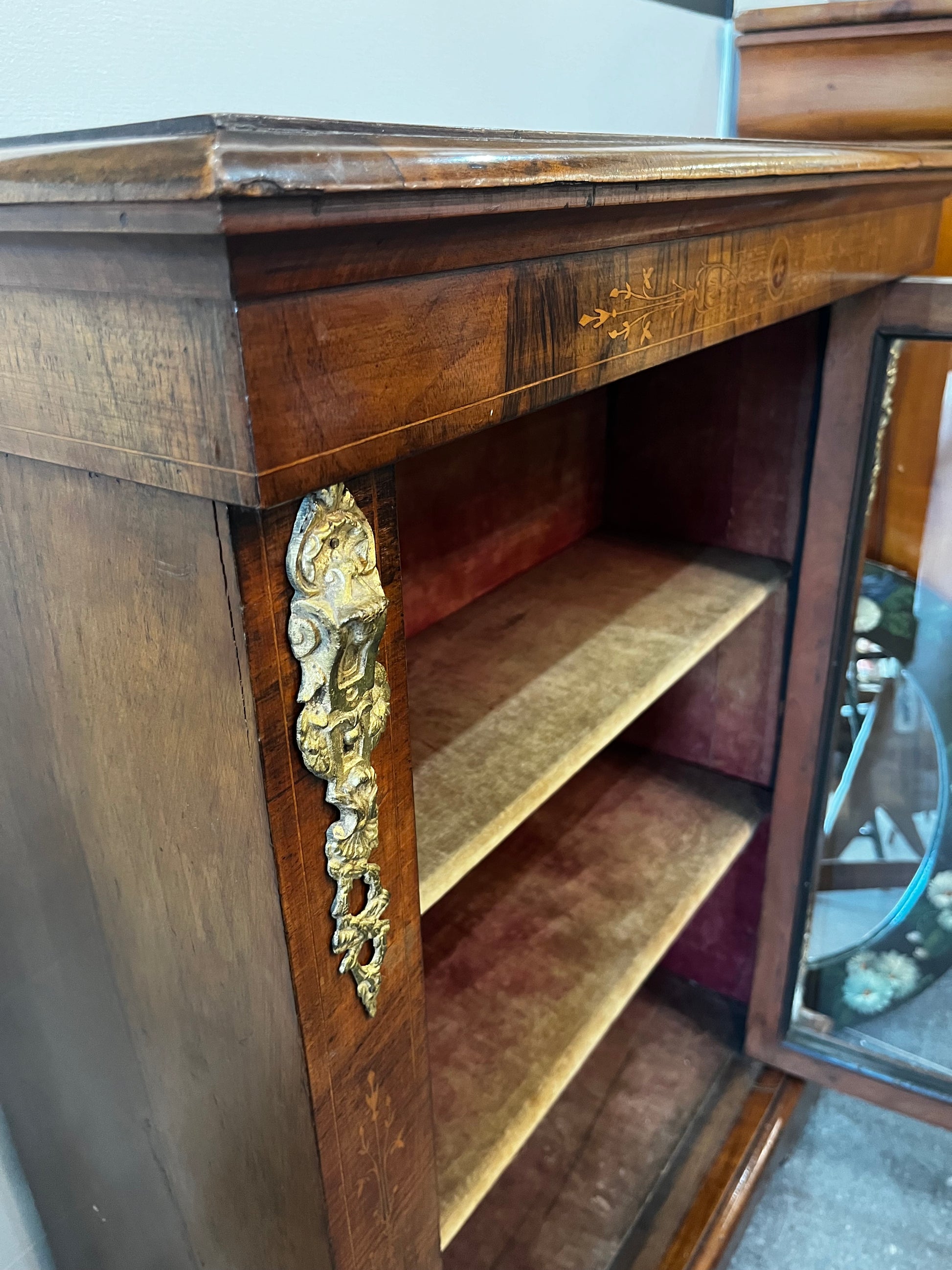 vitrine Charle X en marqueterie ornée de bronze, Interieur tapisser couleur groseille possédant deux étagères