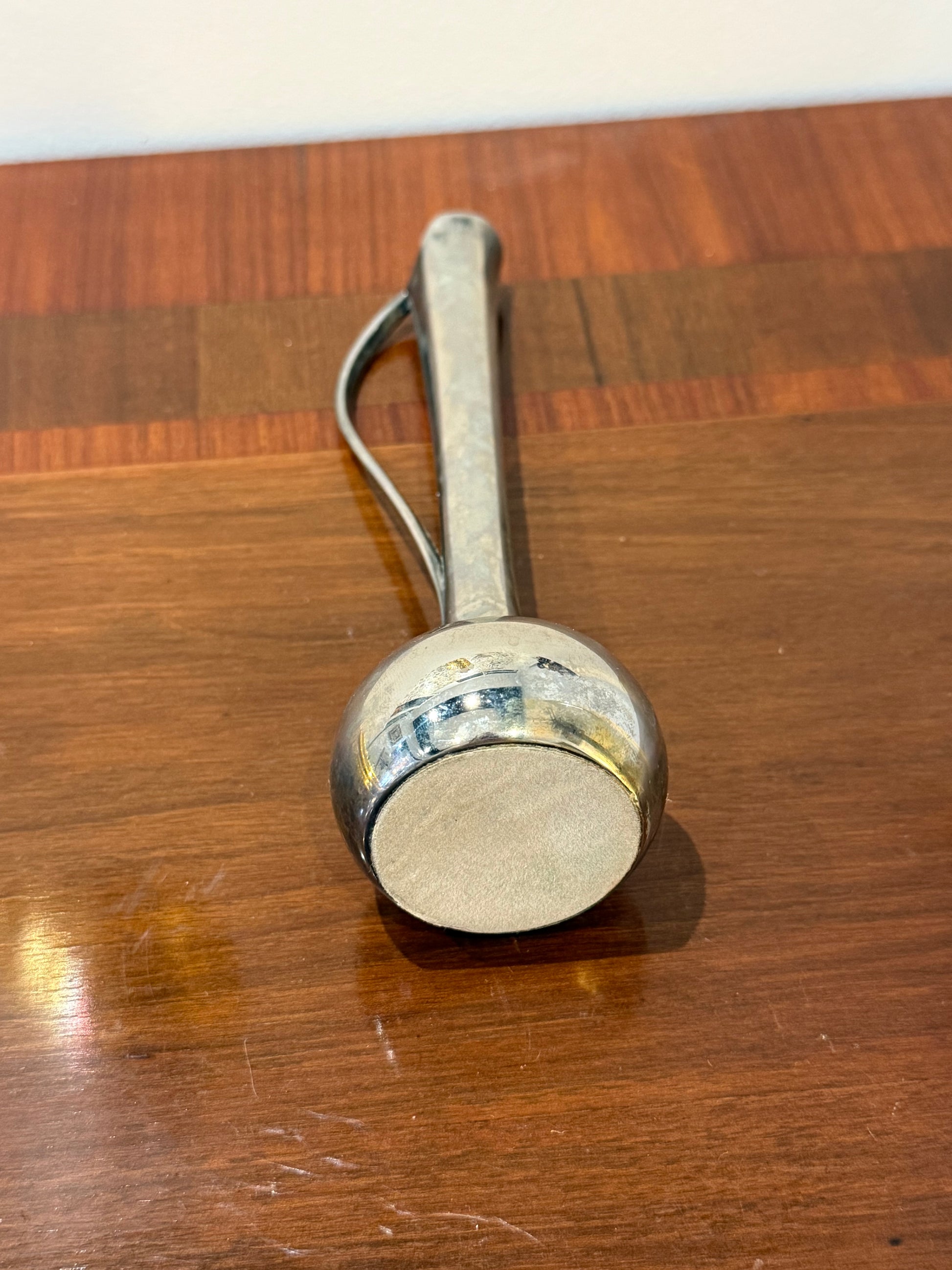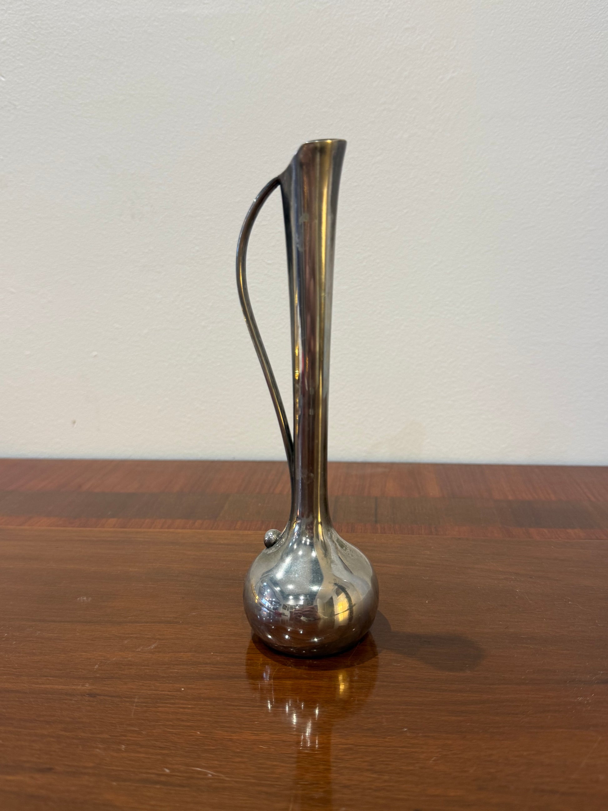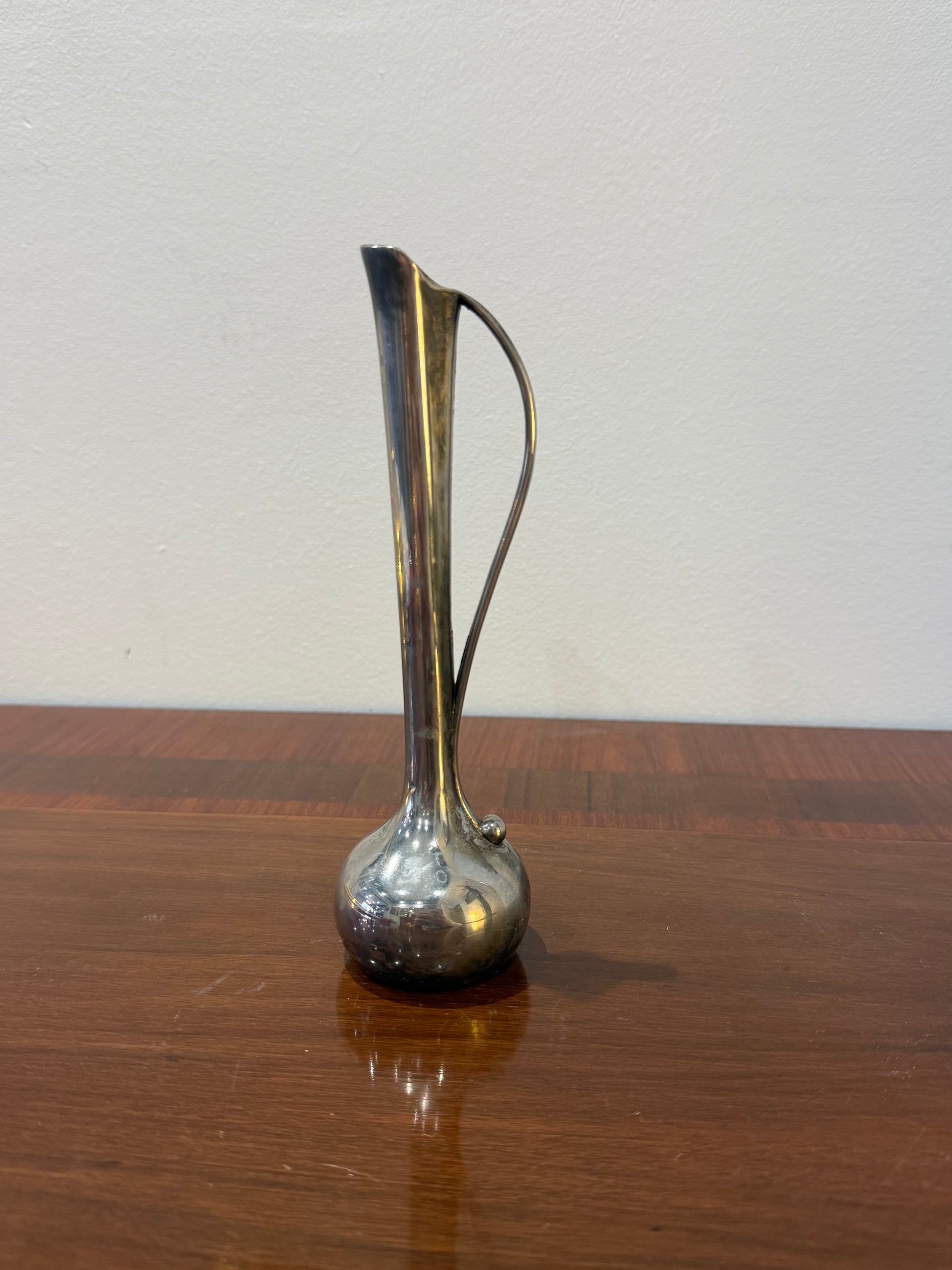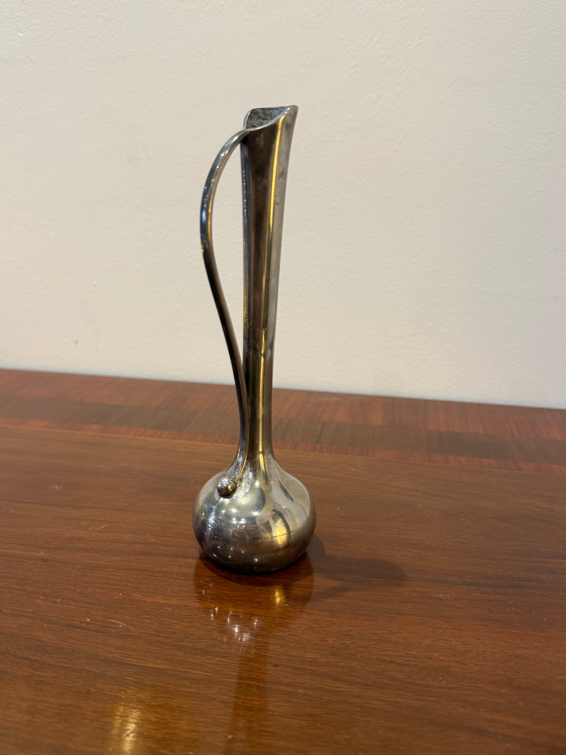 Ce soliflore en métal argenté présente un design élégant et raffiné, inspiré des styles Art Nouveau ou moderniste du début du XXe siècle. Sa silhouette élancée, avec une base ronde et un col long et fin, lui confère une allure gracieuse et sophistiquée.